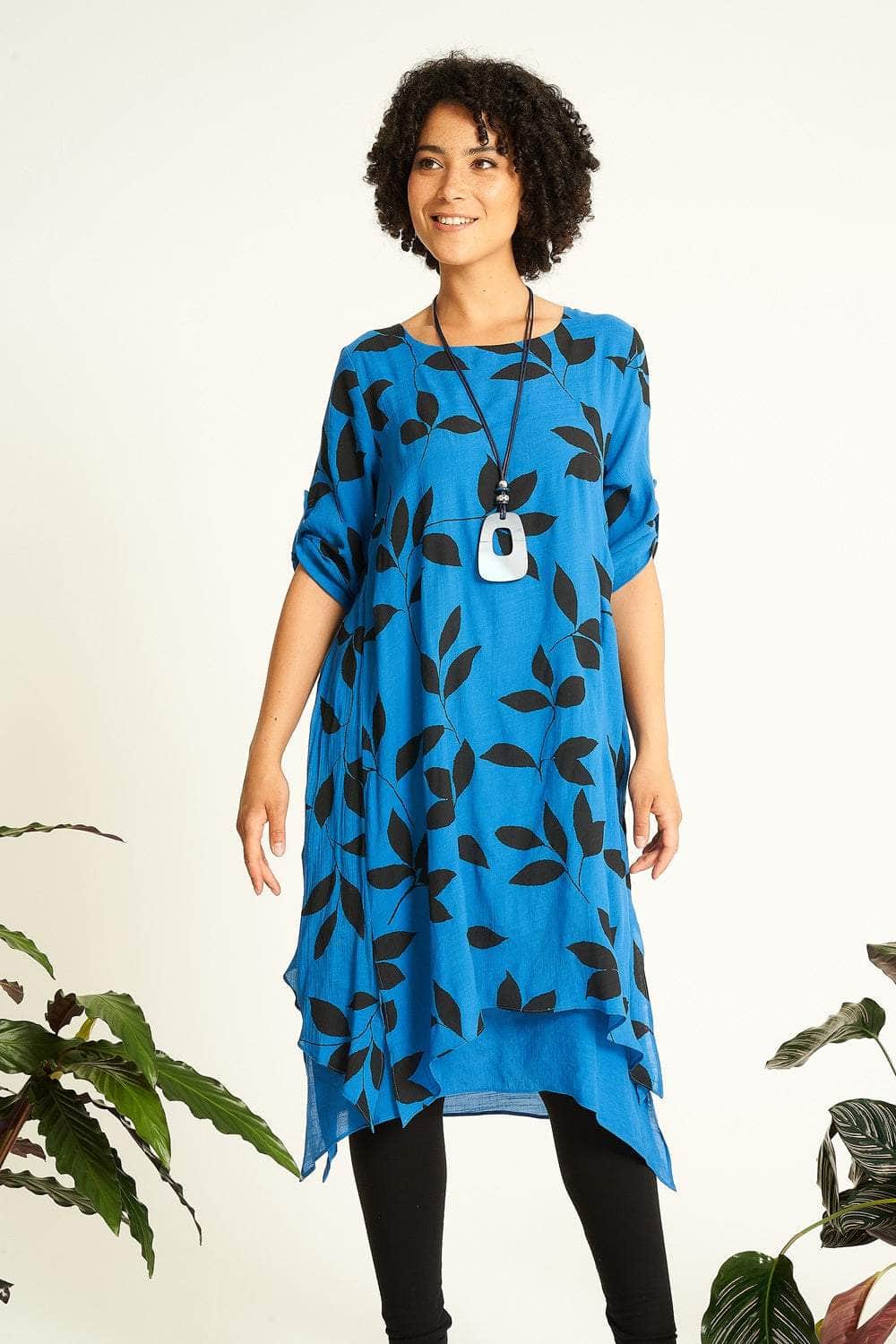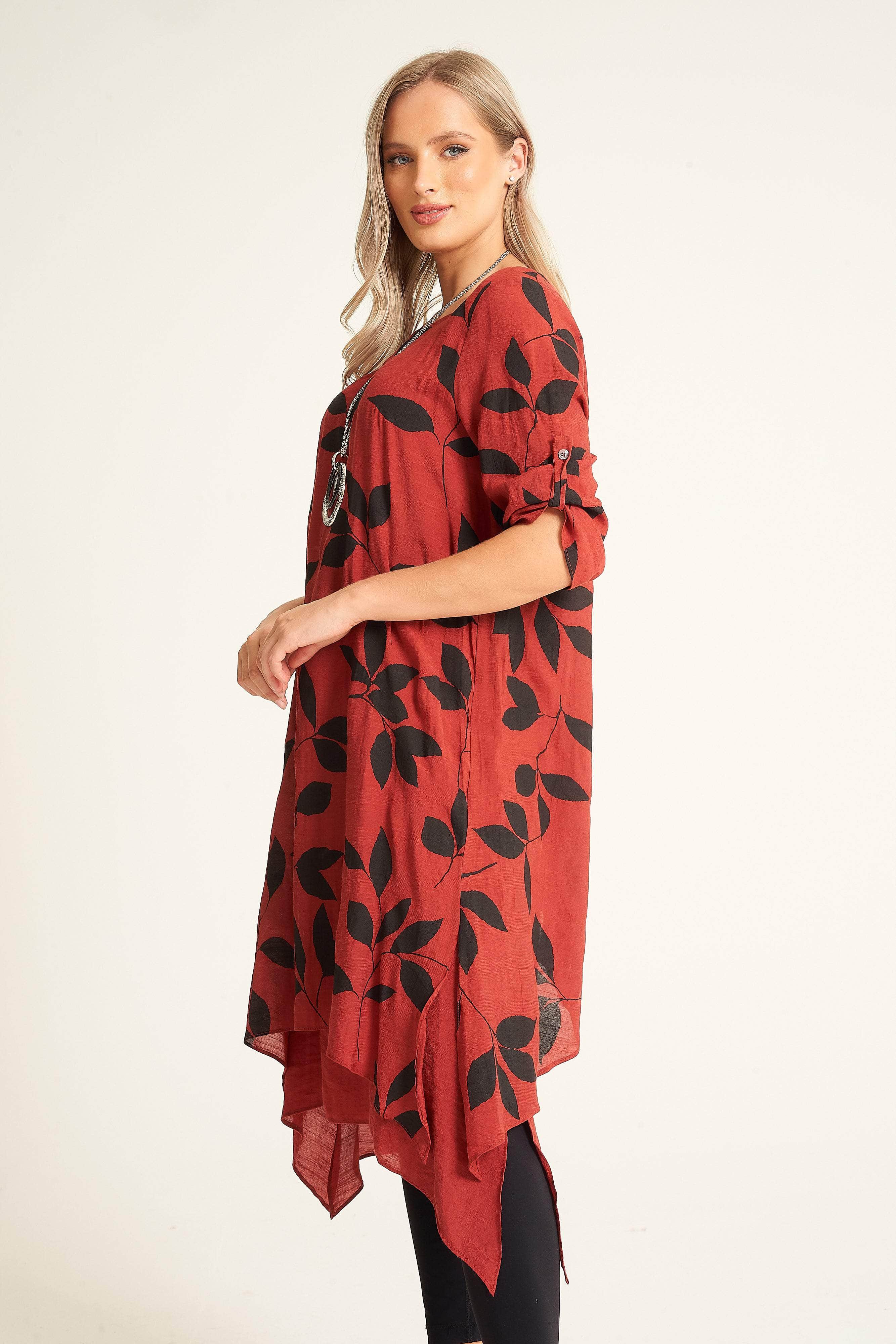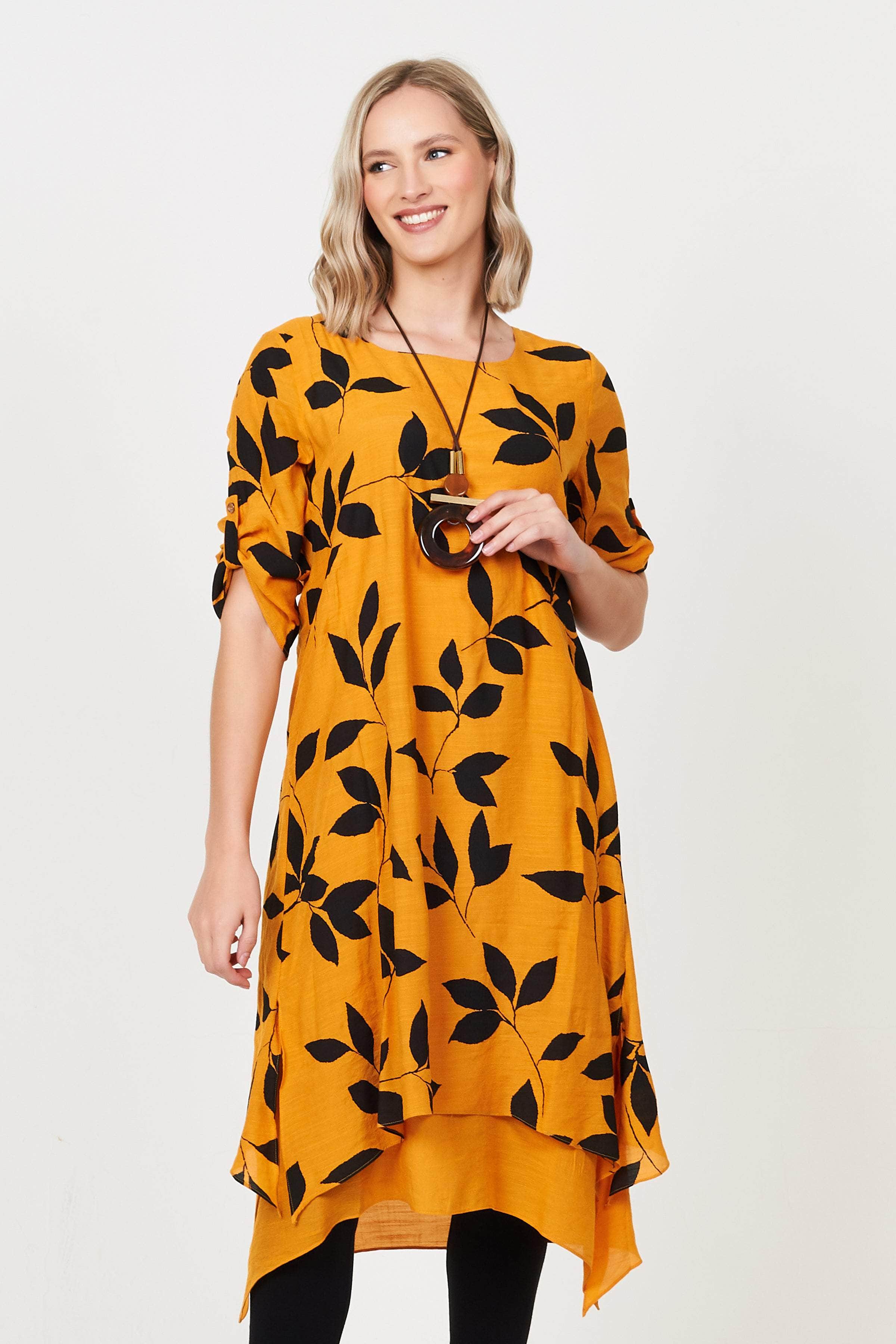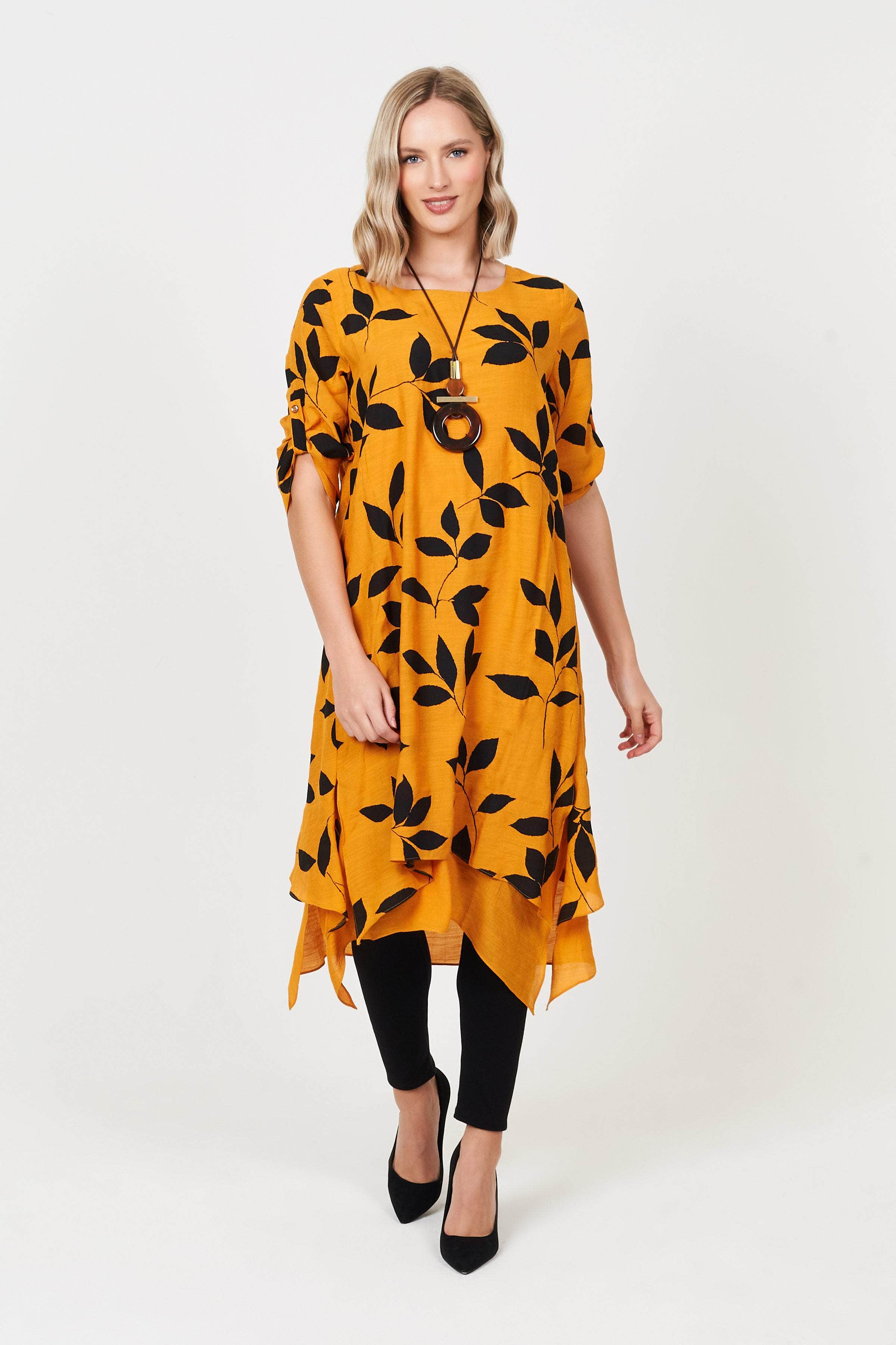 This double layered dress showcases a leaf print with a contrasting plain underlayer and roll-up sleeves. The airy style has a feminine touch and is best paired with leggings. A complementary necklace* is also included.