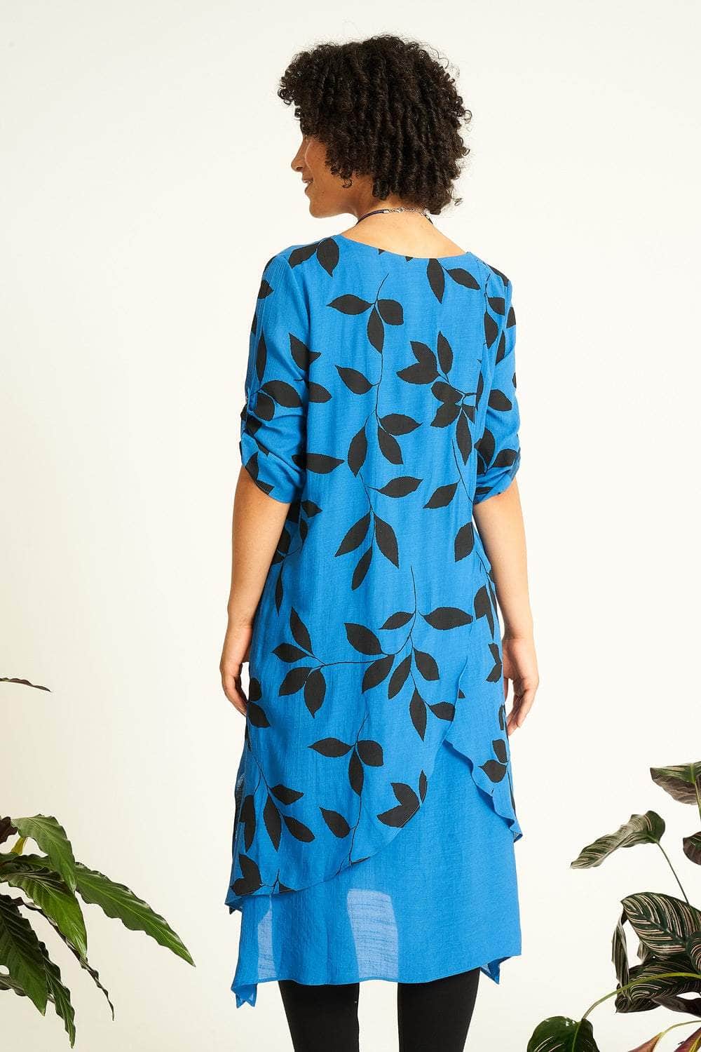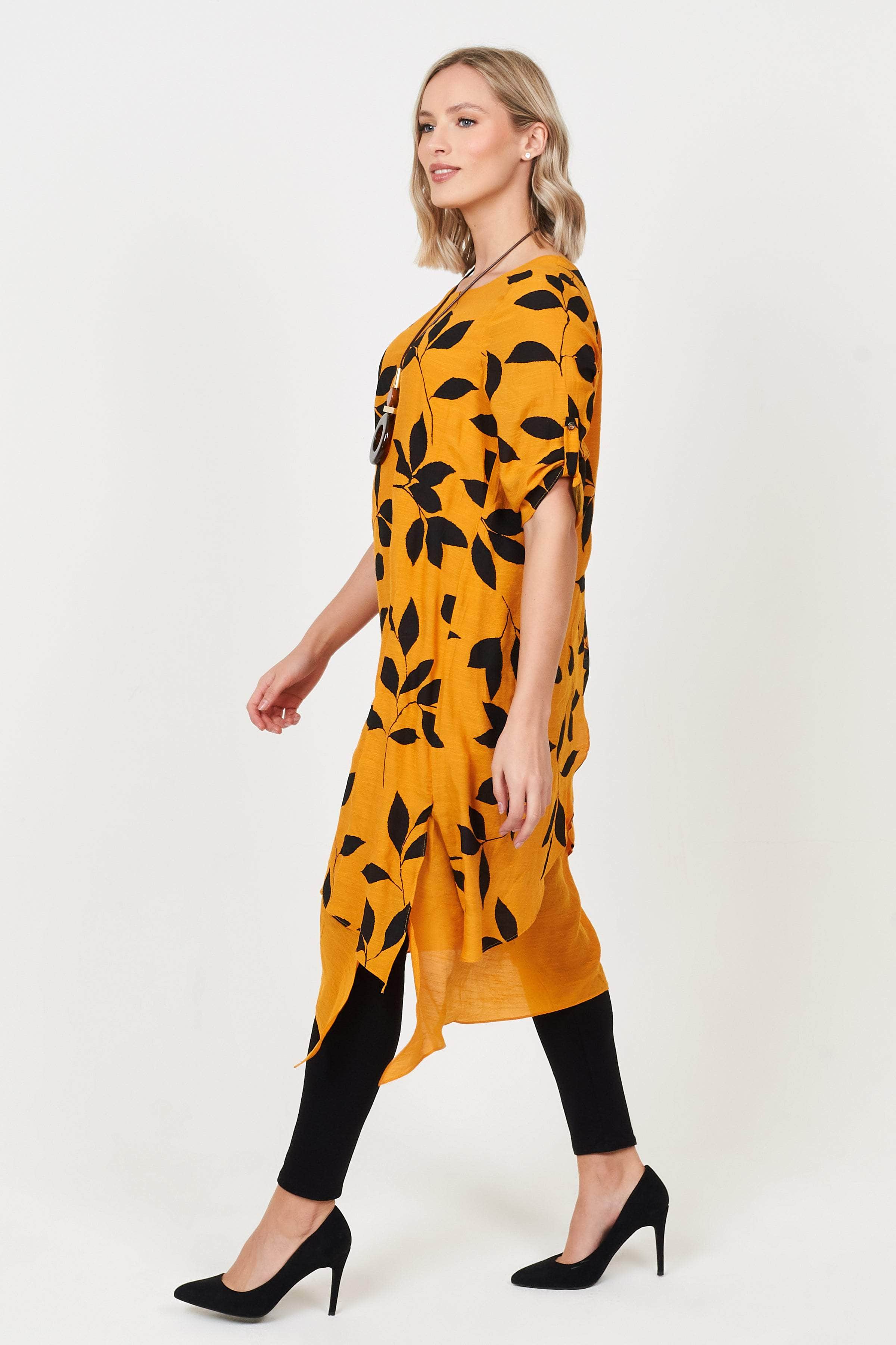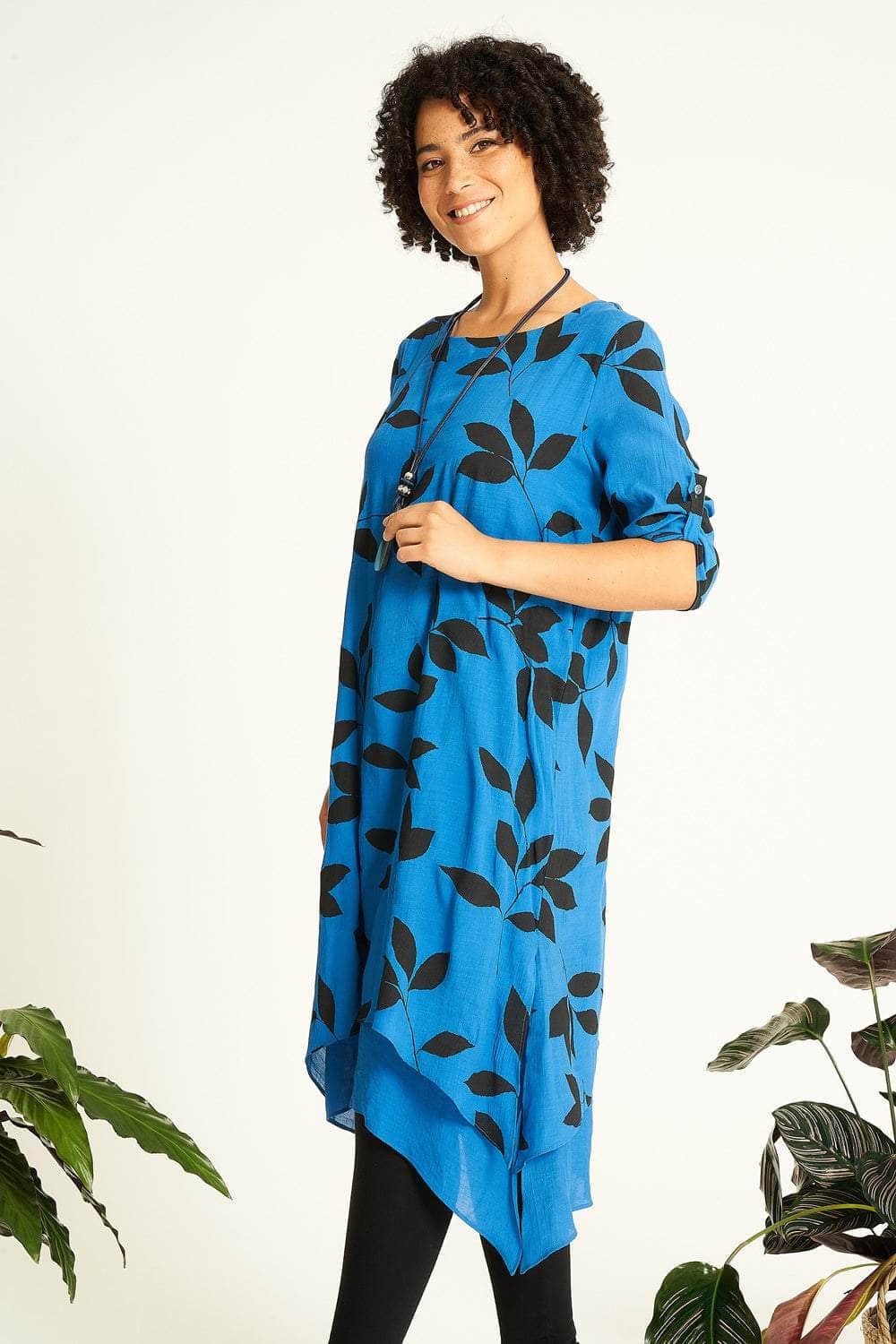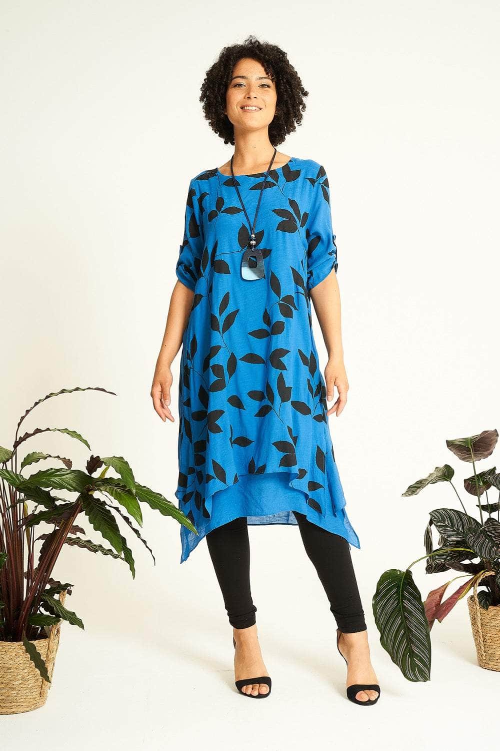 This double layered dress showcases a leaf print with a contrasting plain underlayer and roll-up sleeves. The airy style has a feminine touch and is best paired with leggings. A complementary necklace* is also included.