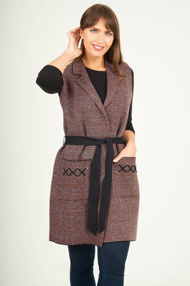 This Chevron knitted sleeveless jacket is a must have this season. With a stylish collar, contrasting waist tie and two front pockets with criss-cross detailing on. Fashionable sleeveless design fits perfectly over long sleeve jumpers for a smart look.