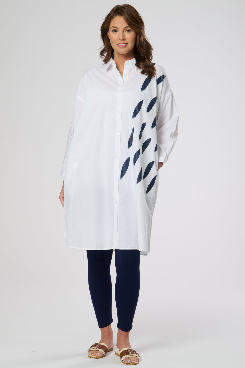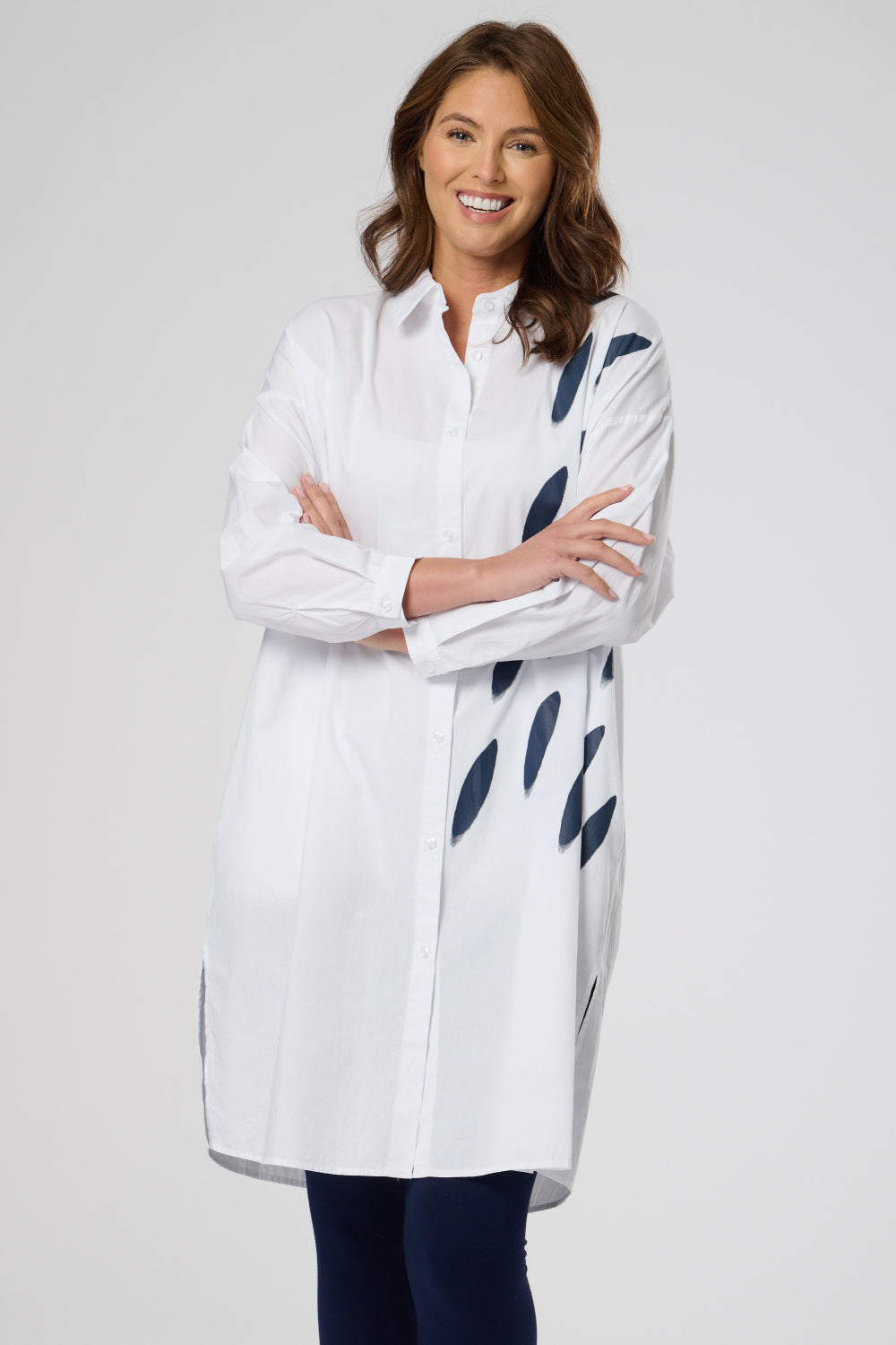 Look sharp and stylish in this long cotton shirt-dress. Featuring a side print detail, collared neckline and concealed button placket, this shirt-dress provides both comfort and elegance. A side slit hemline makes it easy to move, while the side pockets offer convenience.