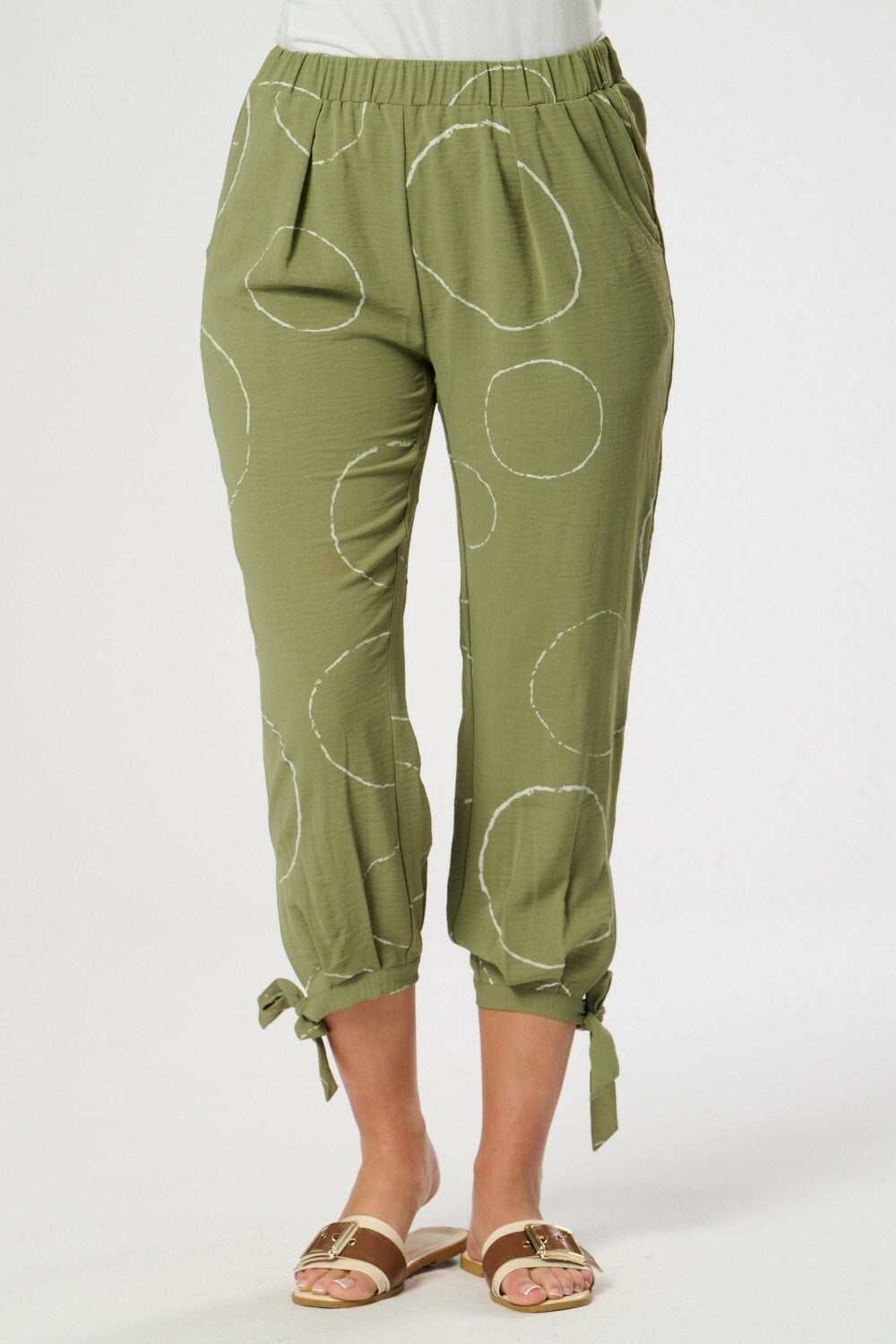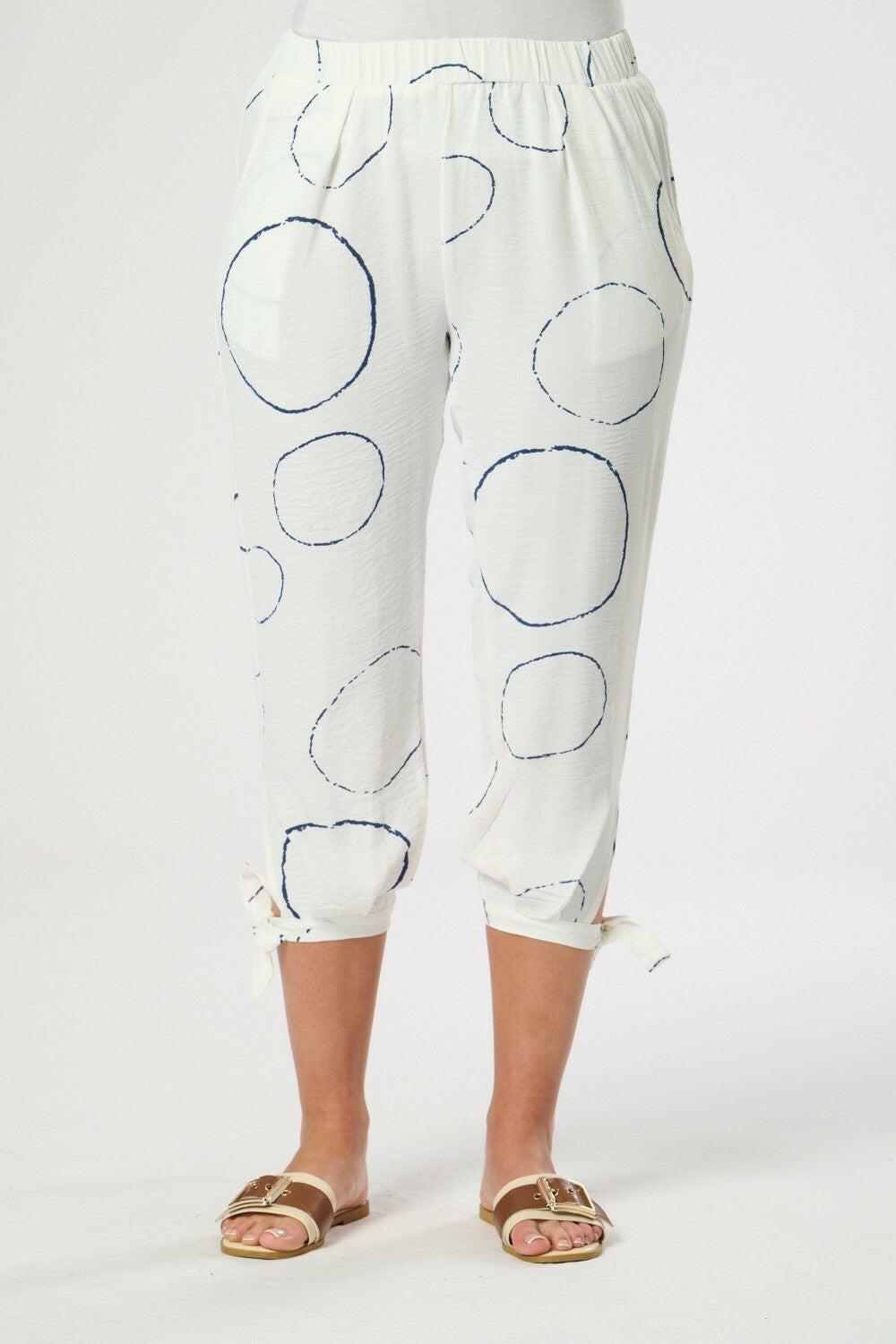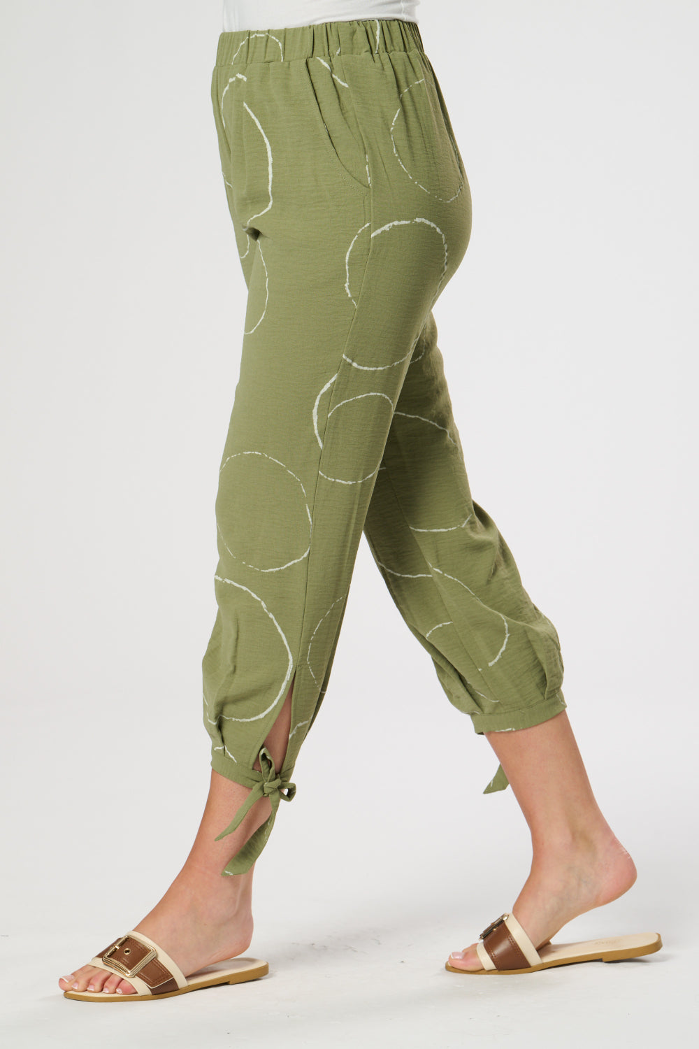 These trousers boast a distinctive three-quarter length, an elasticated waistband, and cuff tie accents for a contemporary and refined appearance. Side pockets add convenience to the design.