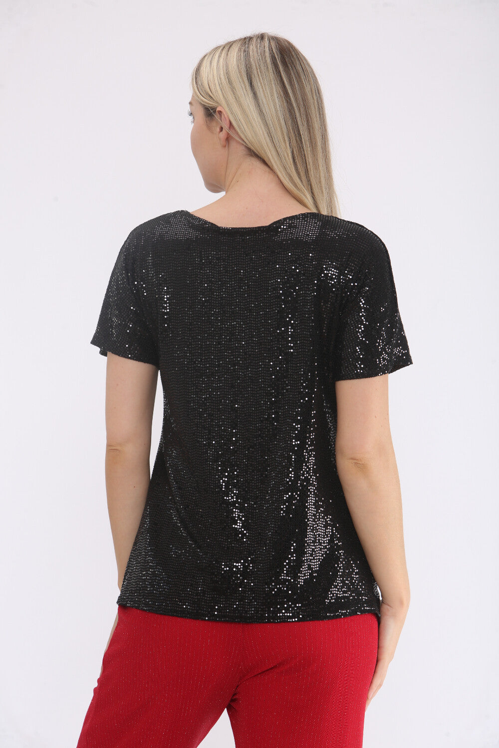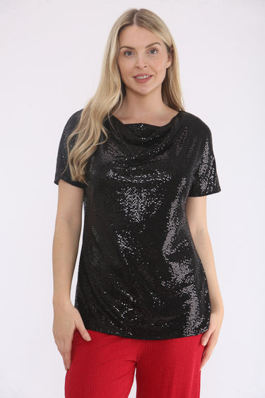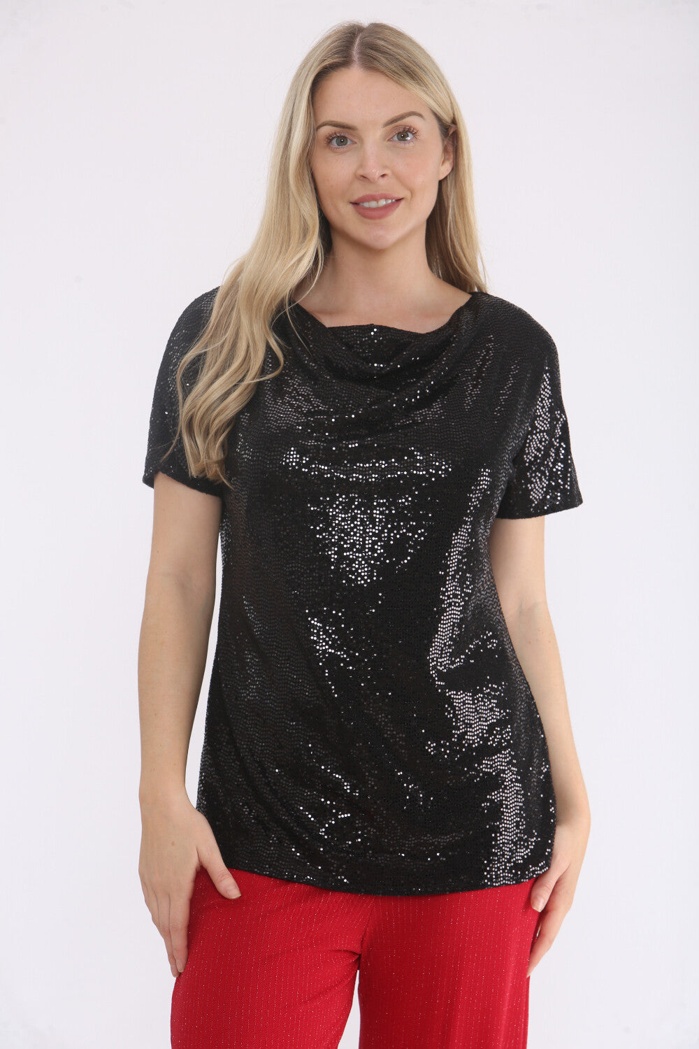 Saloos Women's Black Sequin Cowl Neck Party Top – Shimmer Short Sleeve Festive Blouse