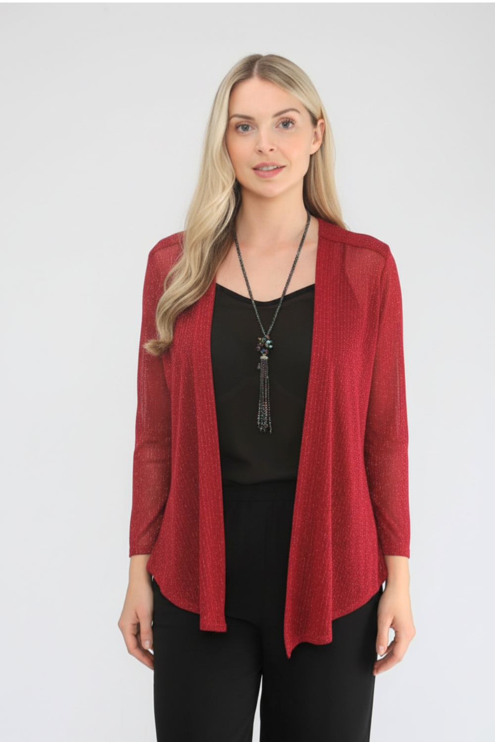 Elevate your holiday look with this stunning metallic mesh open-front jacket. Its shimmering red finish instantly adds a festive touch, making it a perfect choice for Christmas parties, winter events, and elegant evening outings. The lightweight mesh drapes beautifully, offering comfort without sacrificing style, while the open-front design creates a flattering, effortless silhouette.