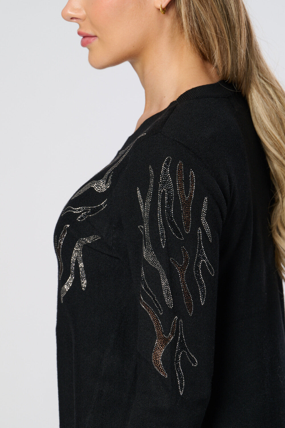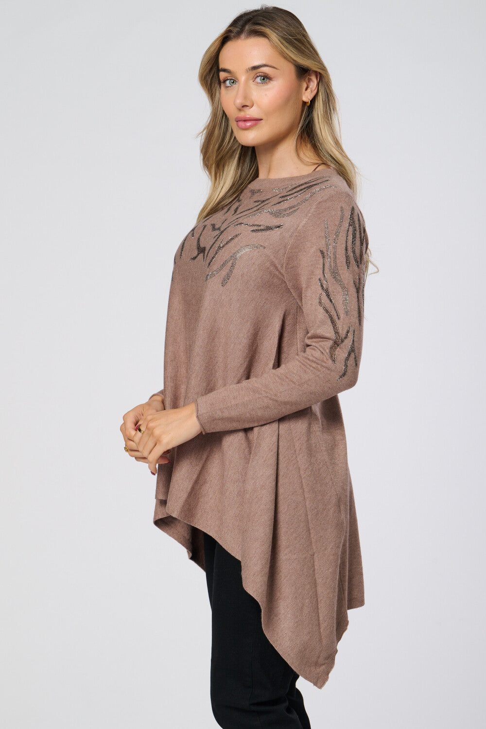 Elevate your everyday style with this soft knit top, designed for comfort and effortless elegance. Featuring long sleeves and a flowing silhouette with a flattering high-low hem, it drapes beautifully on any body type. Delicate metallic embellishments add a subtle sparkle, perfect for transitioning from day to night. Whether paired with your favorite jeans for a relaxed weekend look or tailored trousers for a polished ensemble, this versatile top brings timeless sophistication to every occasion.