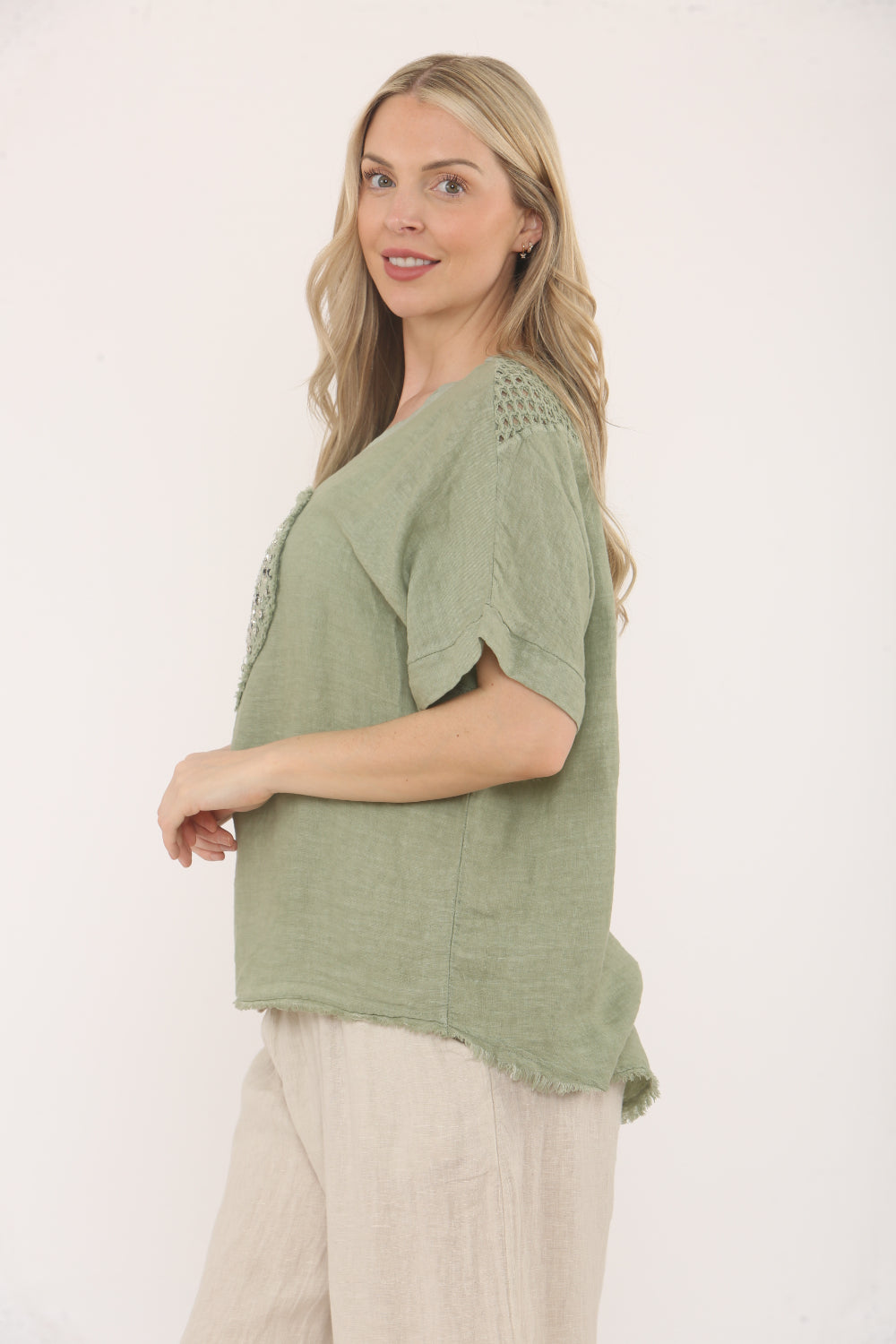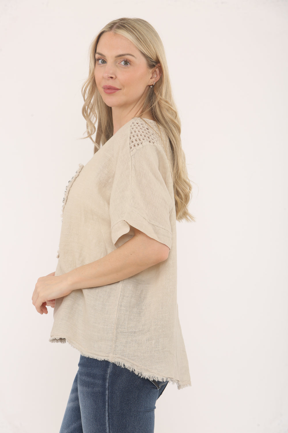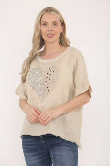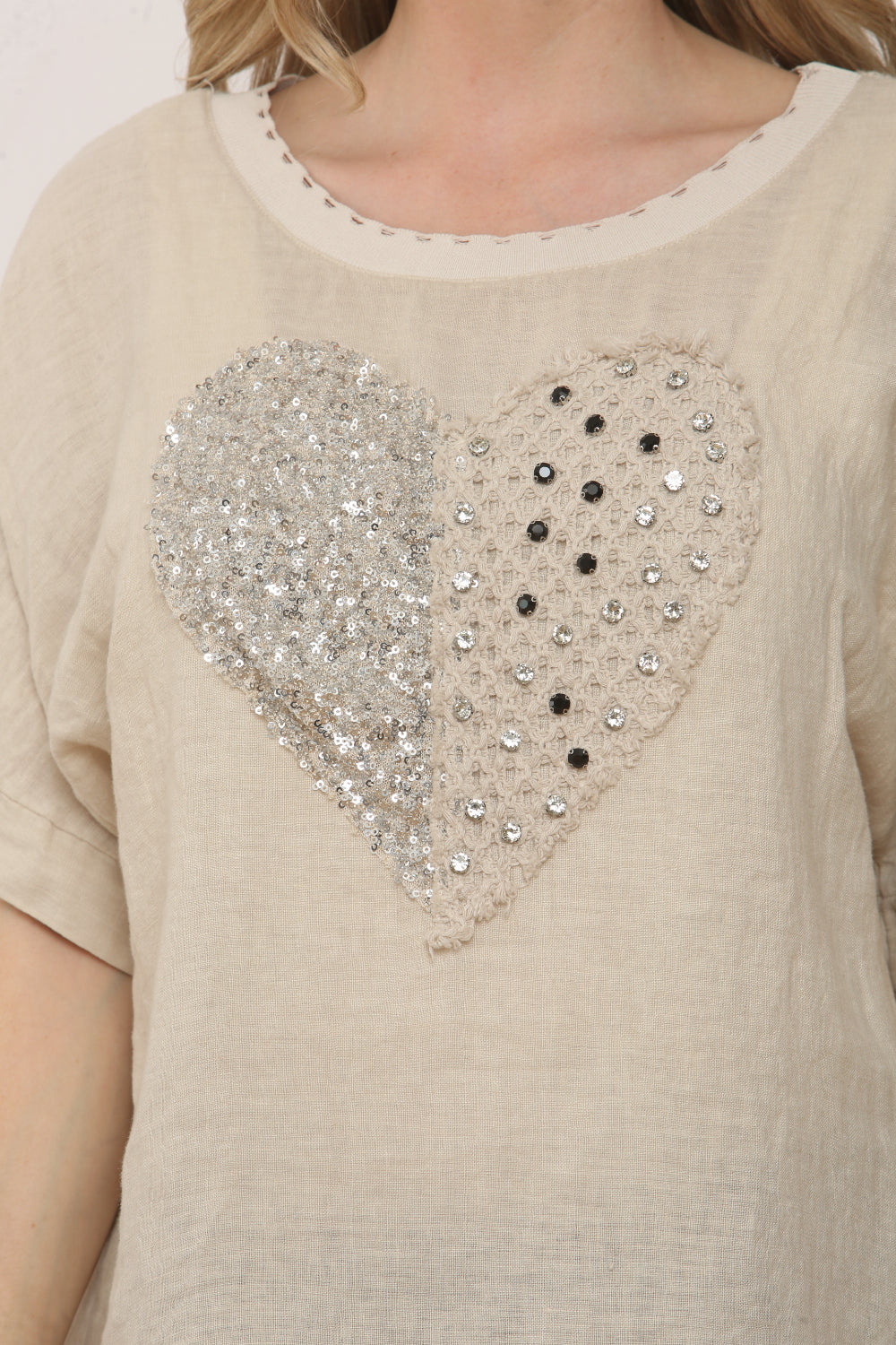 Silvia Linen Embellished Heart Patch with Crochet Detail Top