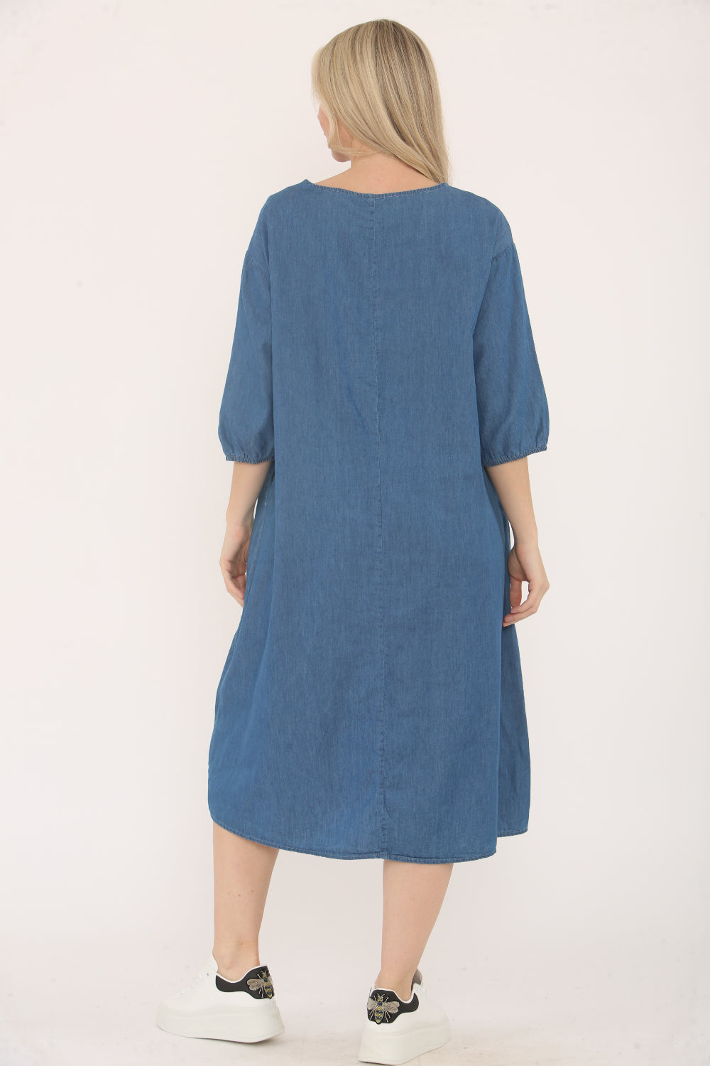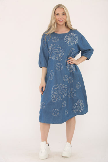 Embrace laid-back style with our unique denim midi dress, featuring a fresh white leaf and circular print. This comfortable, oversized soft denim design offers a relaxed fit and practical 3/4 sleeves. Perfect for effortless everyday wear or a casual summer outing. A must-have for chic comfort.
