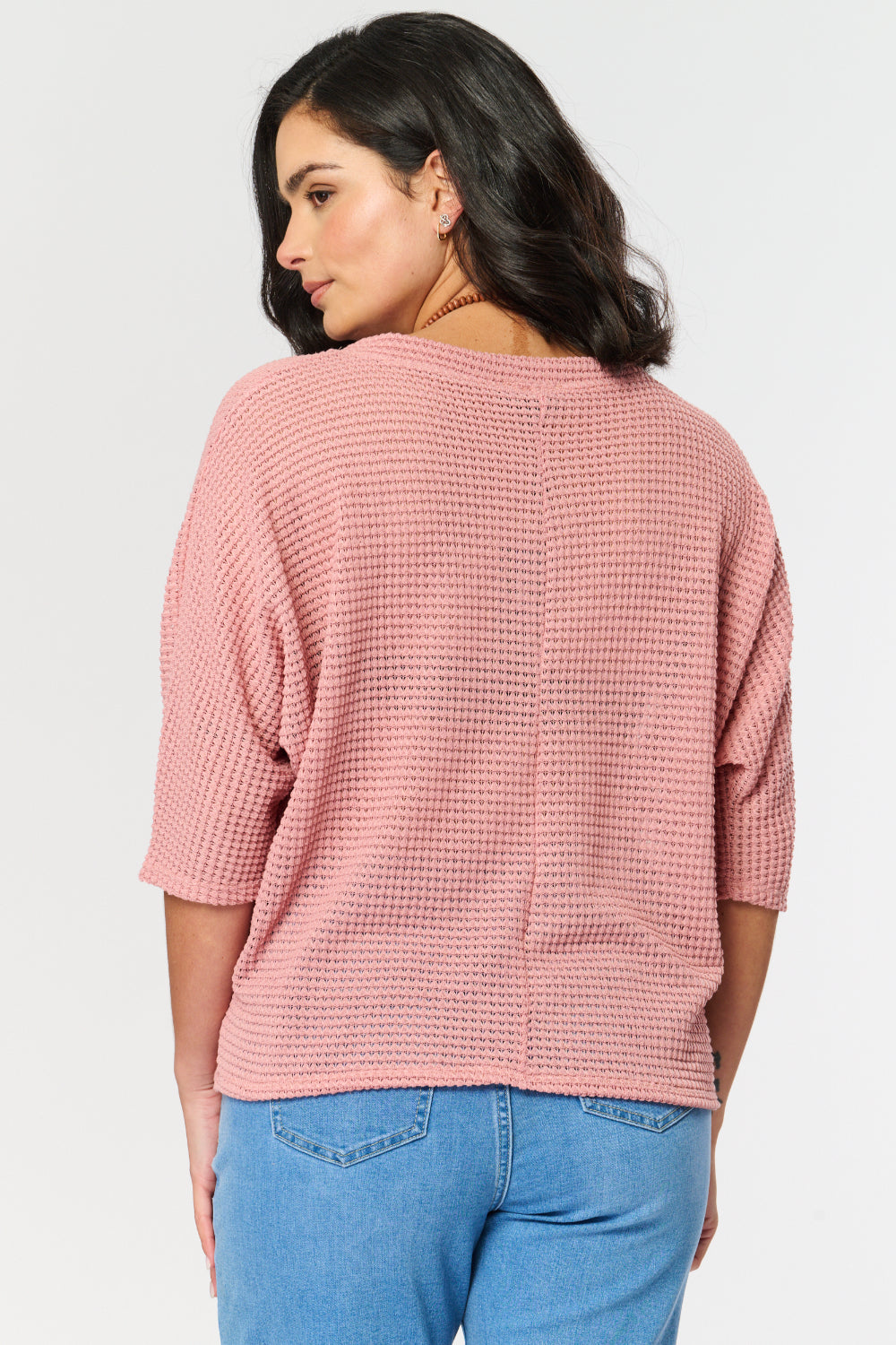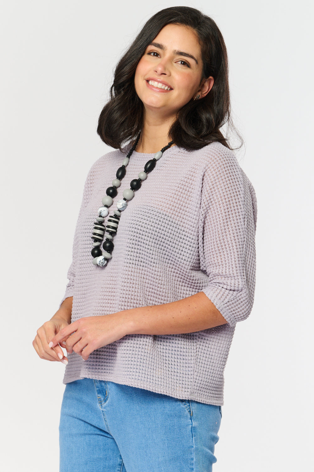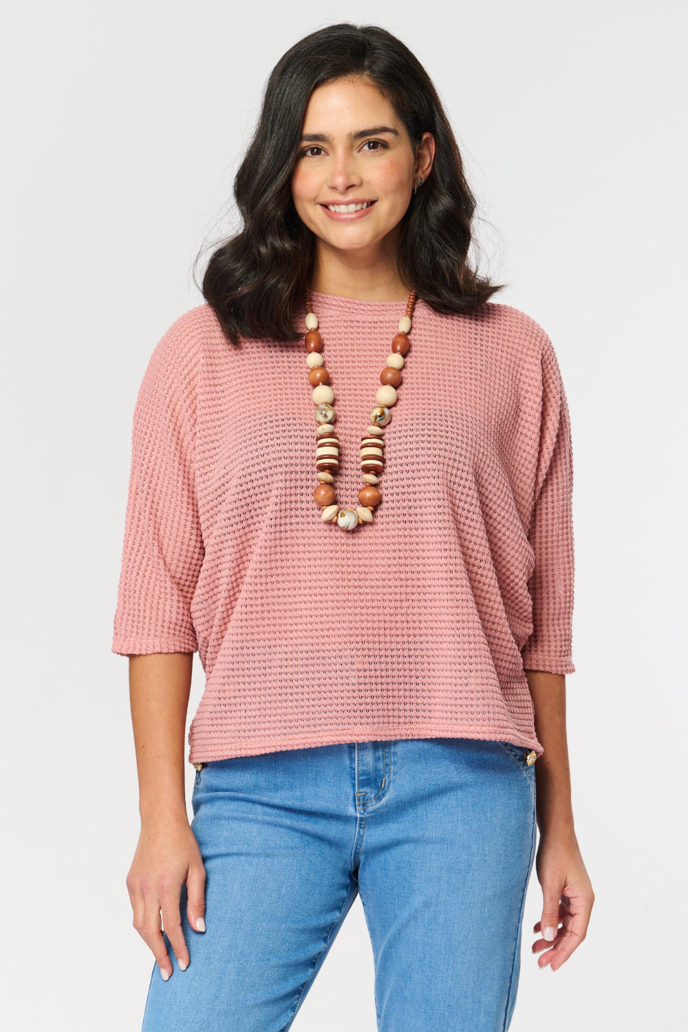 The top is made for comfort and style. The batwing shape top offers a loose fit, while the textured, knitted polyester fabric adds a touch of sophistication. With 3/4 sleeves and a complimentary necklace*, this top is perfect for any occasion.