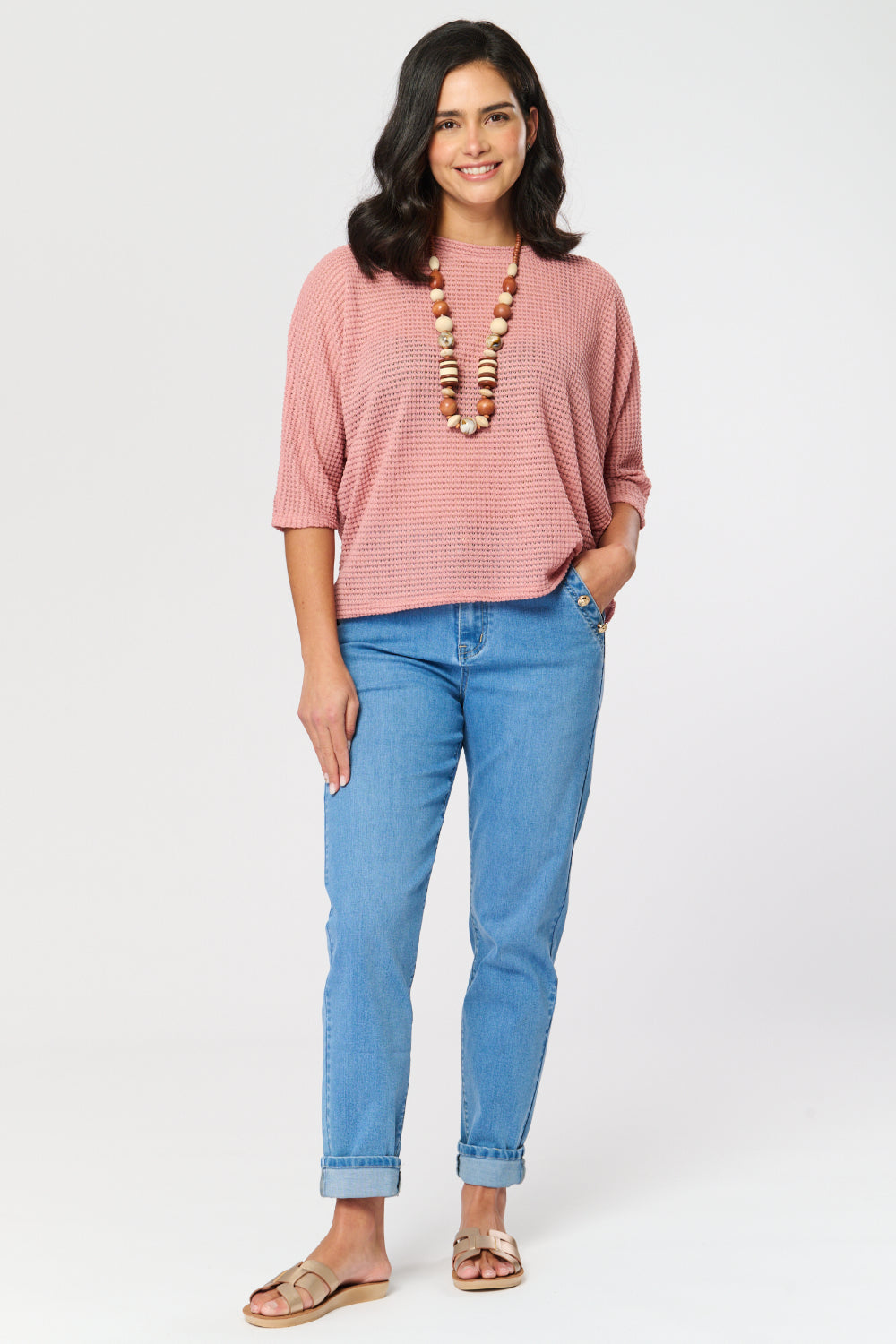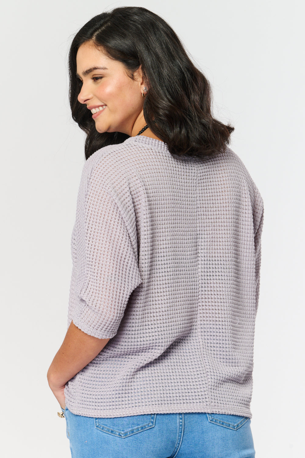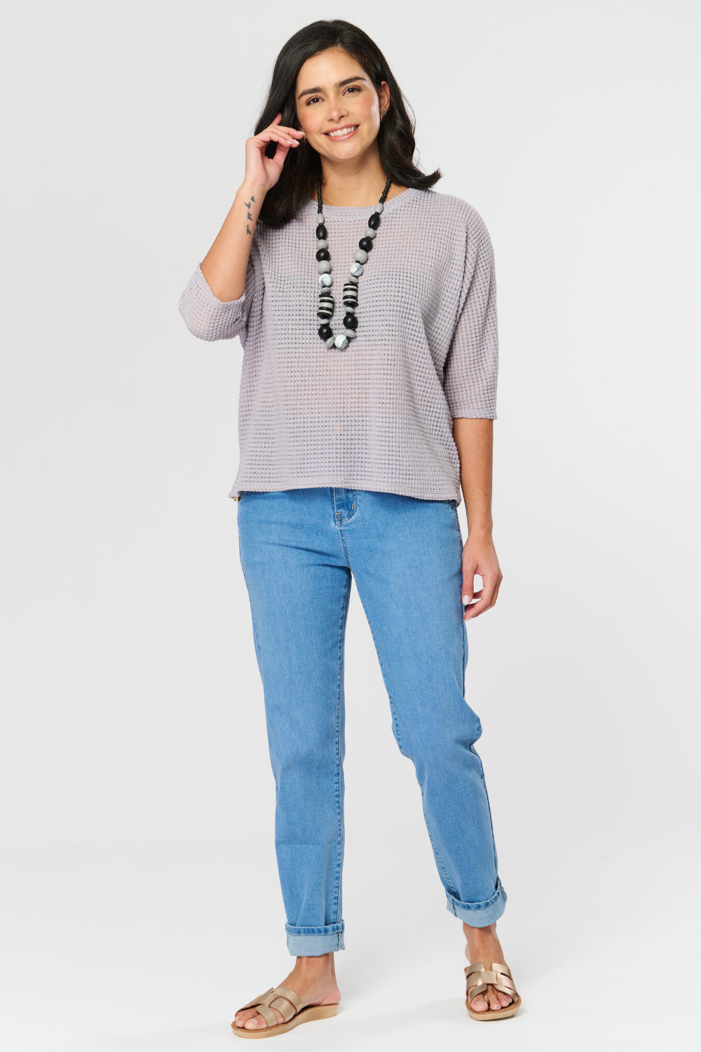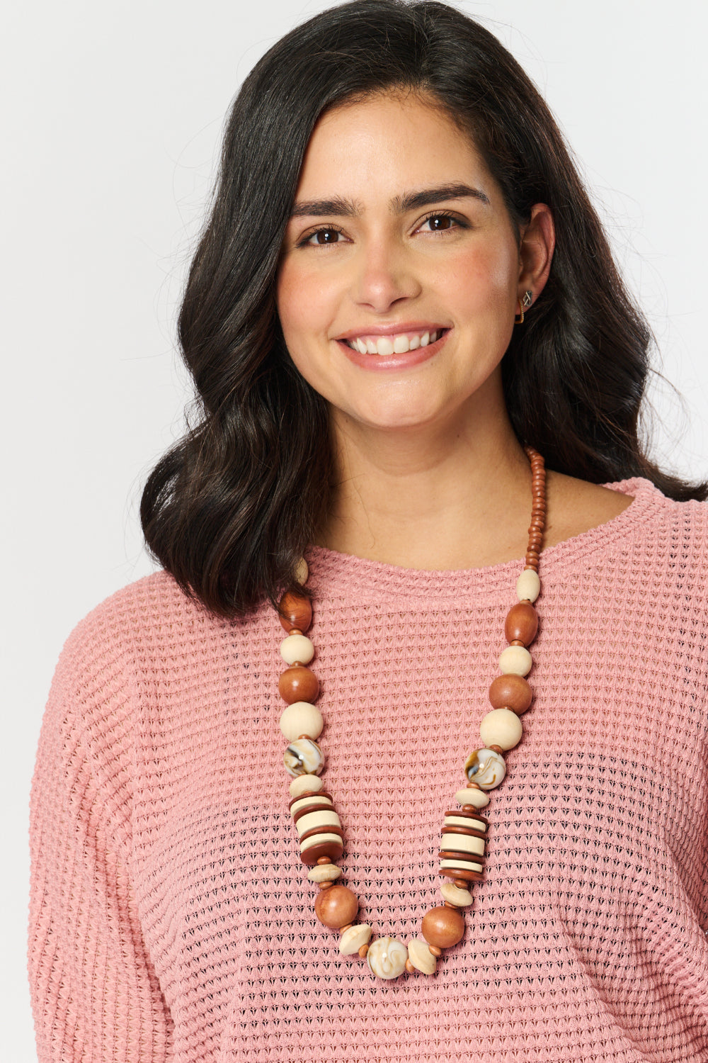 The top is made for comfort and style. The batwing shape top offers a loose fit, while the textured, knitted polyester fabric adds a touch of sophistication. With 3/4 sleeves and a complimentary necklace*, this top is perfect for any occasion.
