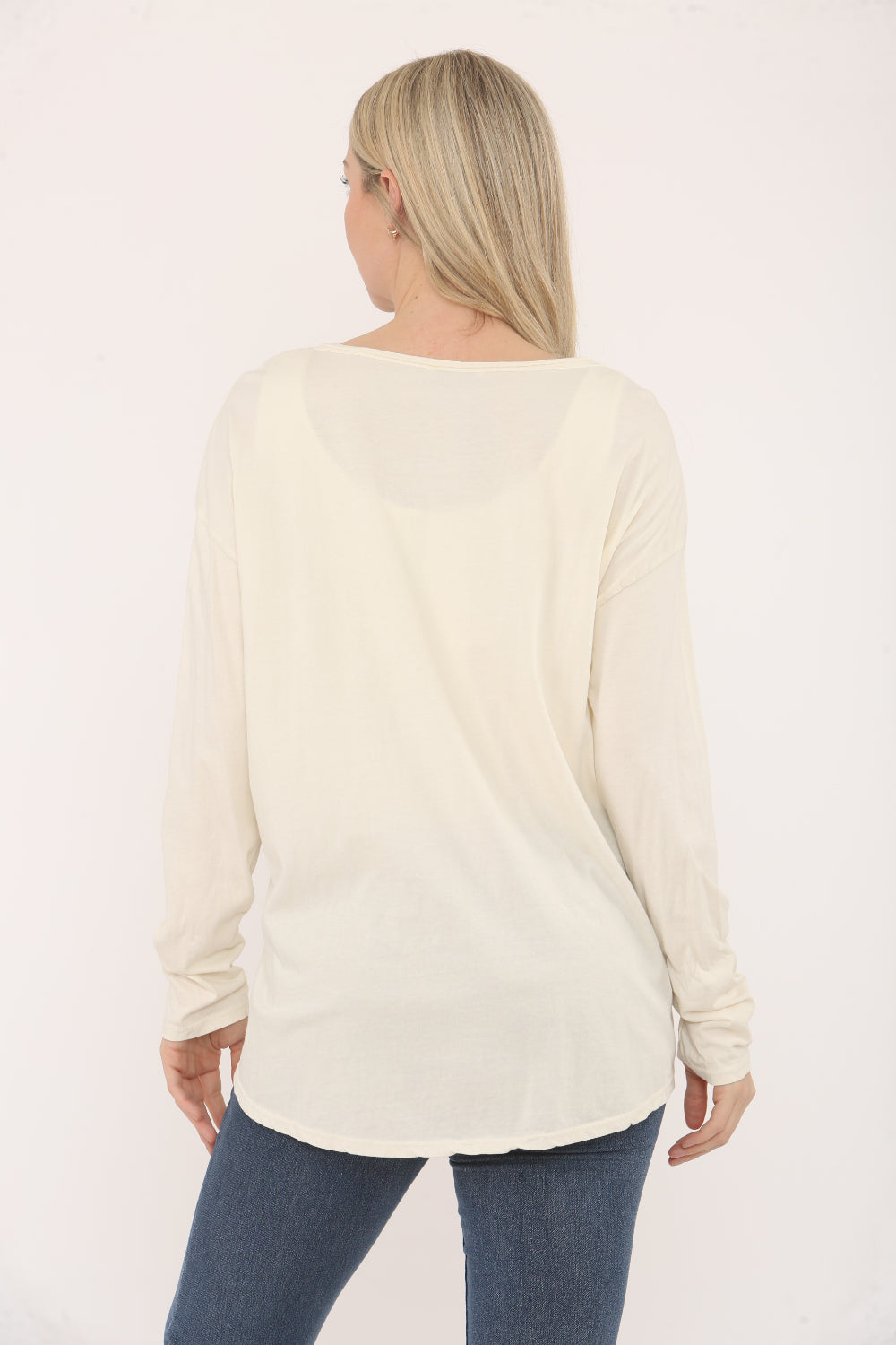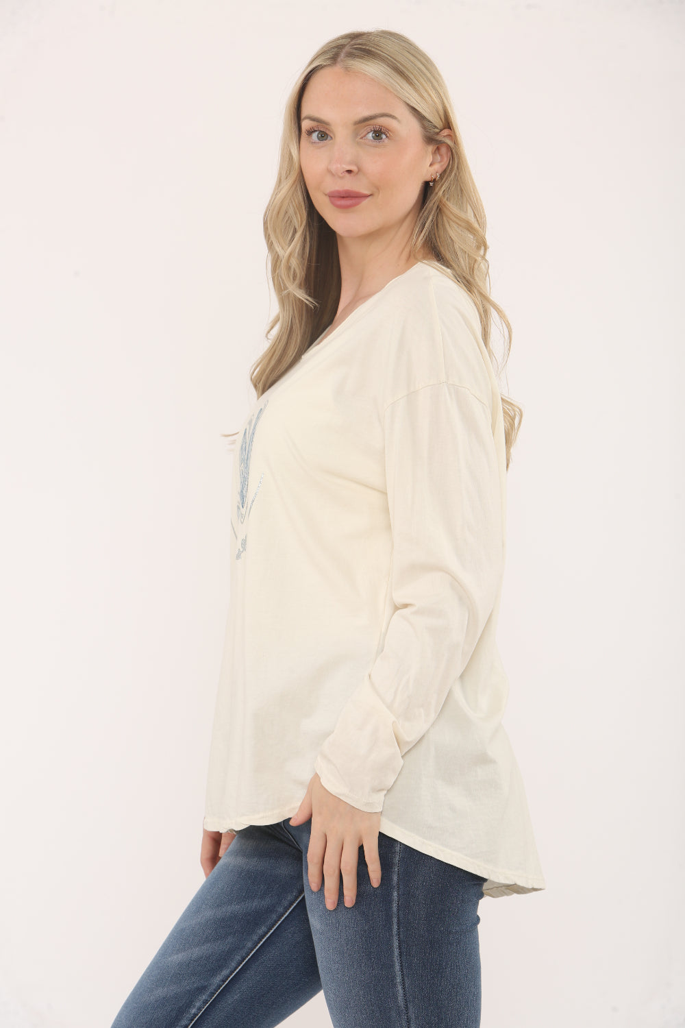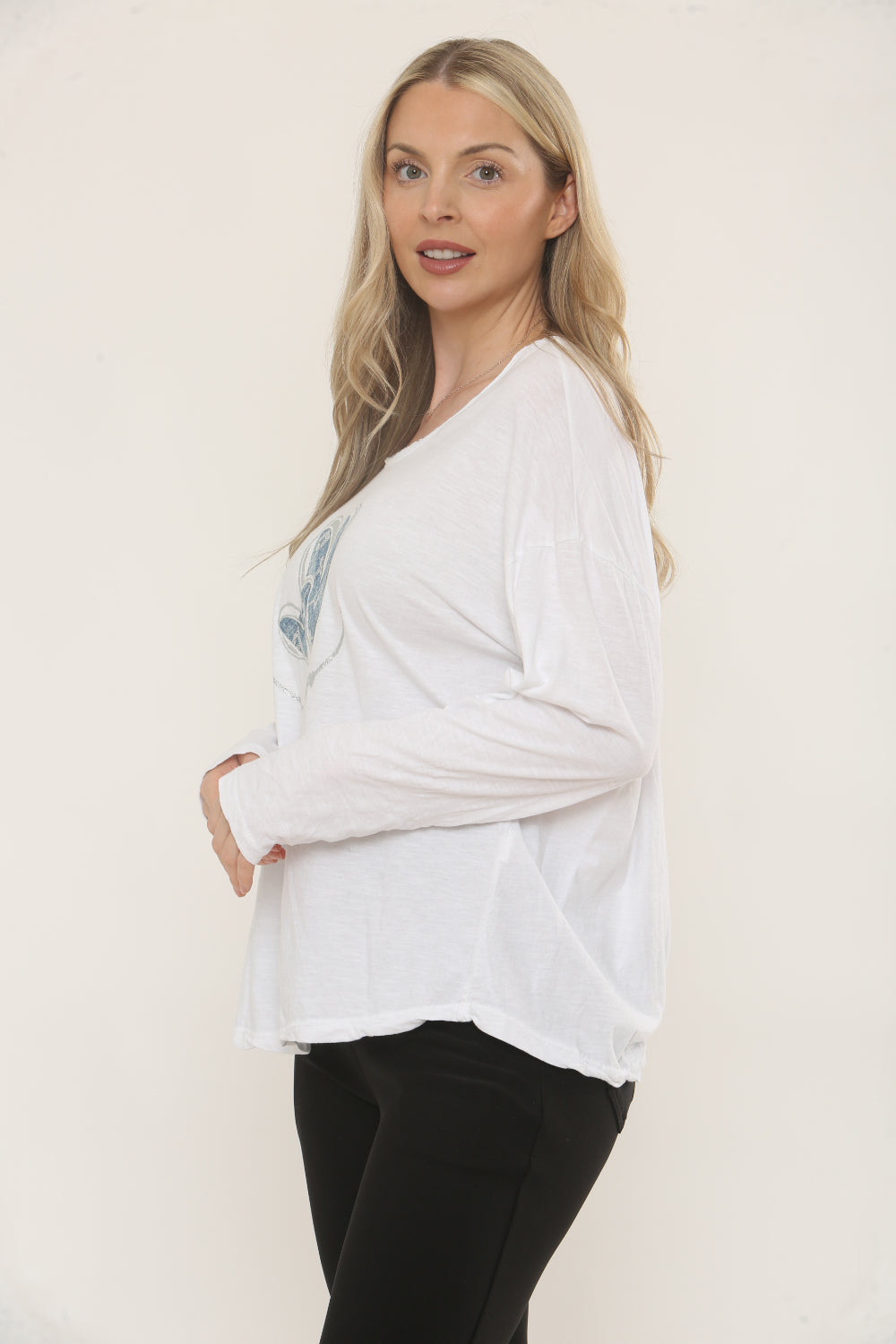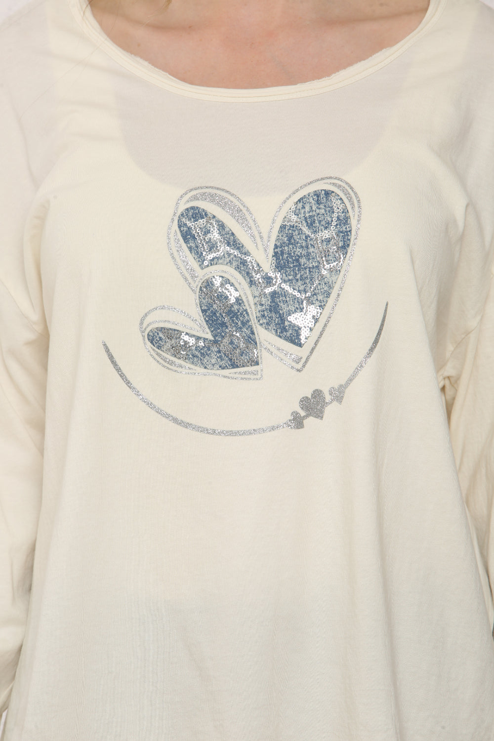 Refresh your wardrobe with this women’s long-sleeve top, crafted from 100% cotton for a soft, breathable feel. Featuring a charming blue heart print on the front, this top adds a touch of playful style to your everyday look. Its relaxed fit and classic crew neckline make it a versatile choice for pairing with jeans, leggings, or casual trousers. Perfect for layering or wearing on its own, this top is a must-have staple for comfortable, effortless fashion.