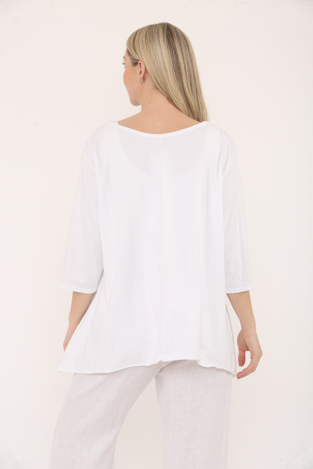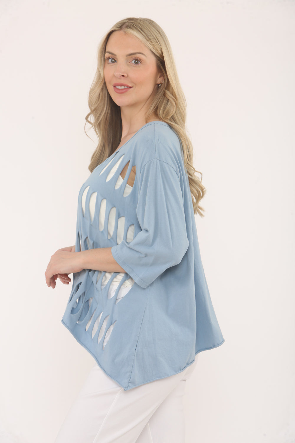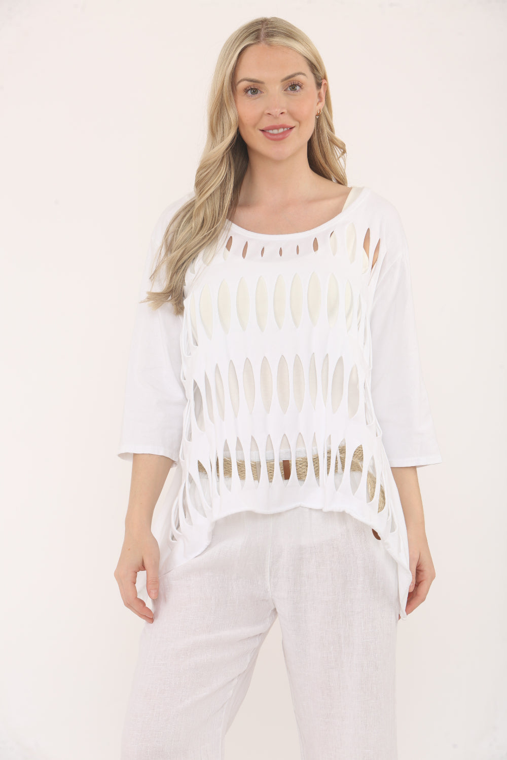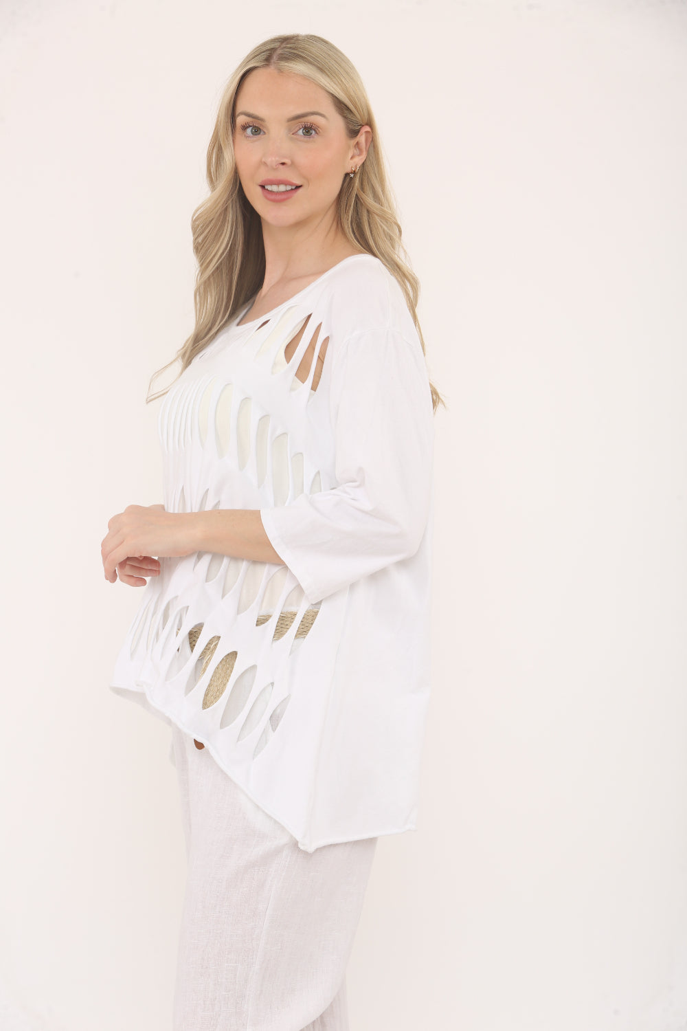 Turn heads with this statement-making top, designed to add a playful edge to your casual wardrobe. Featuring bold oval cut-outs, this relaxed-fit top offers both comfort and standout style. The scoop neckline and elbow-length sleeves keep it effortlessly chic, while the asymmetrical hem adds a modern twist. Perfect for pairing with slim white pants or jeans.