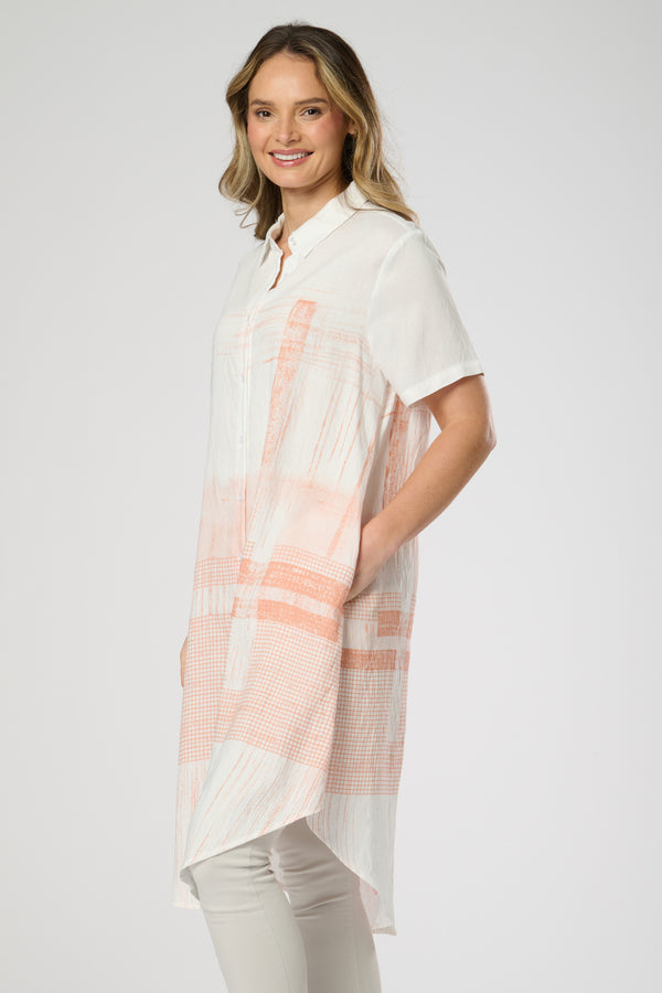 Elevate your style with this blouse. Featuring a classic collar and functional button front, this timeless piece exudes sophistication. The 3/4 sleeves and long dip back add elegance, while the border print brings a unique, artistic touch. Suitable for any occasion.