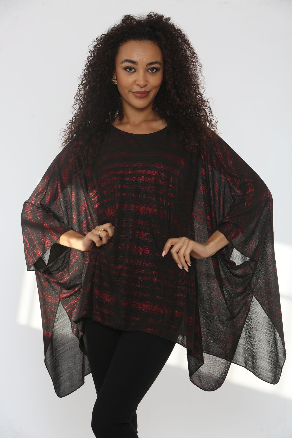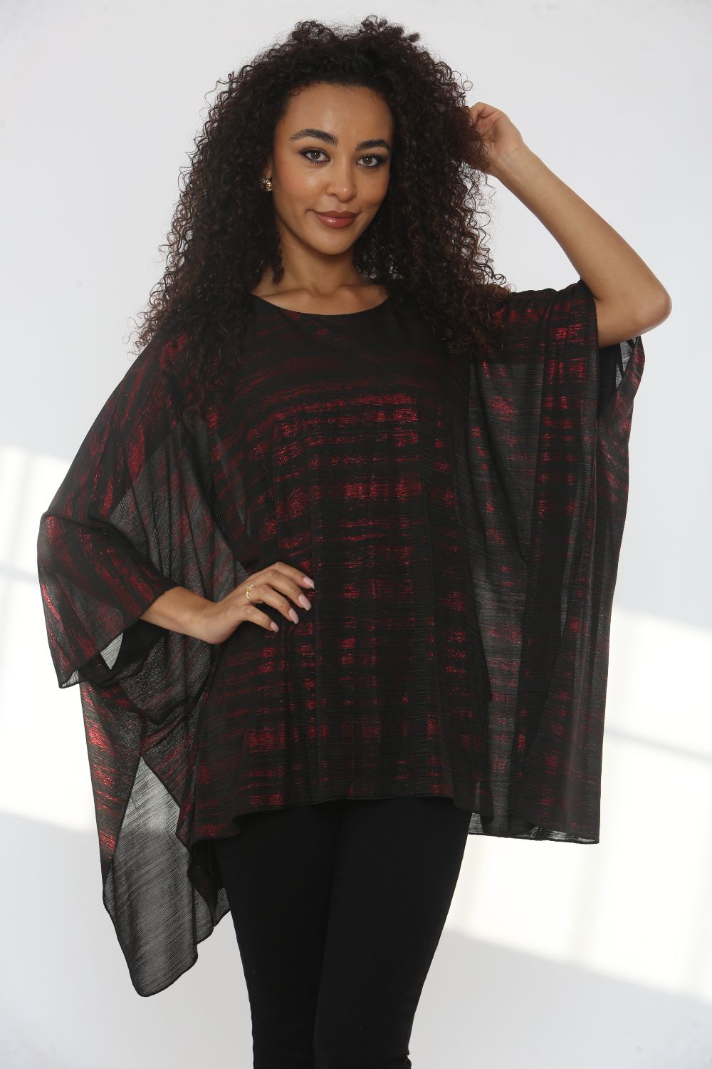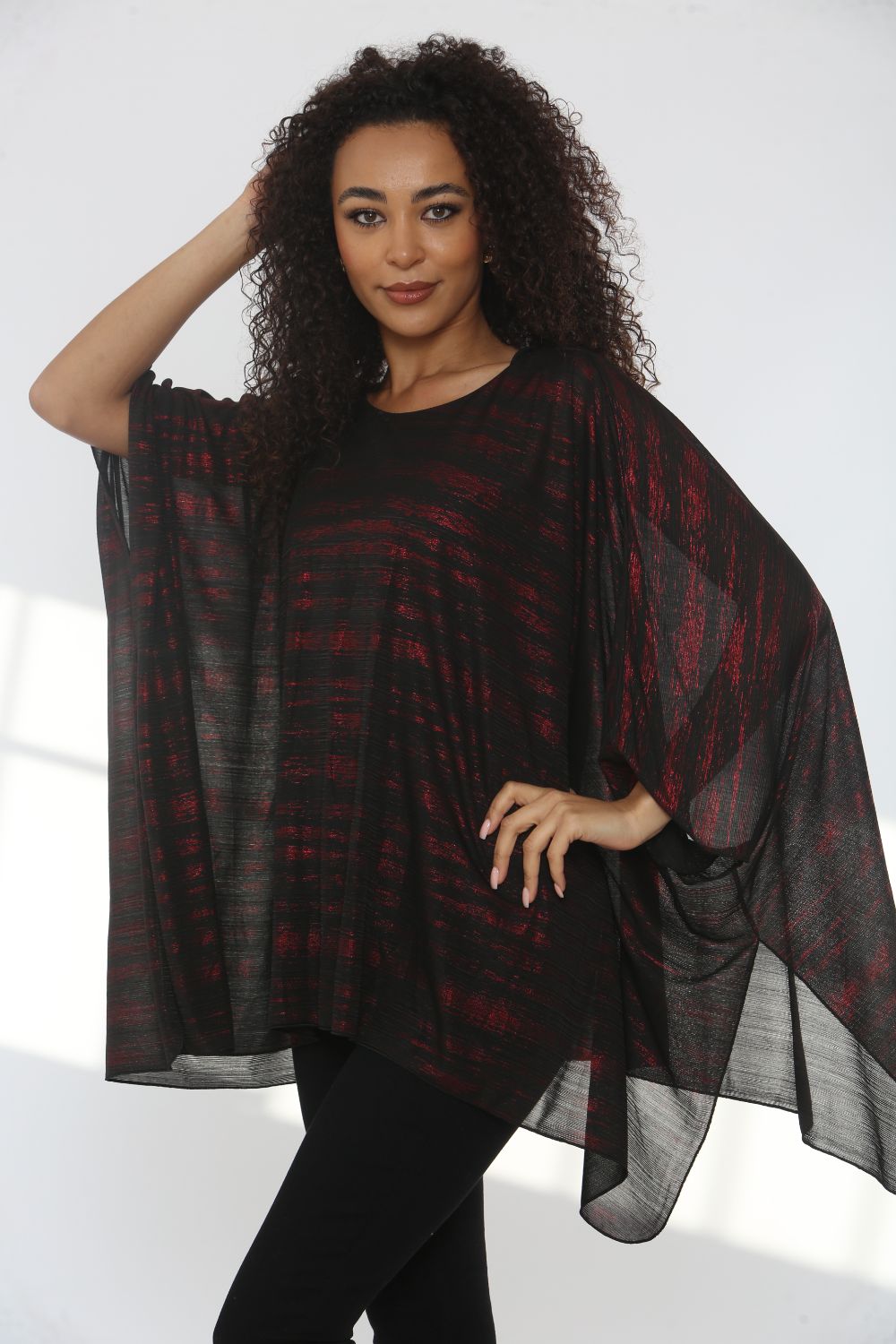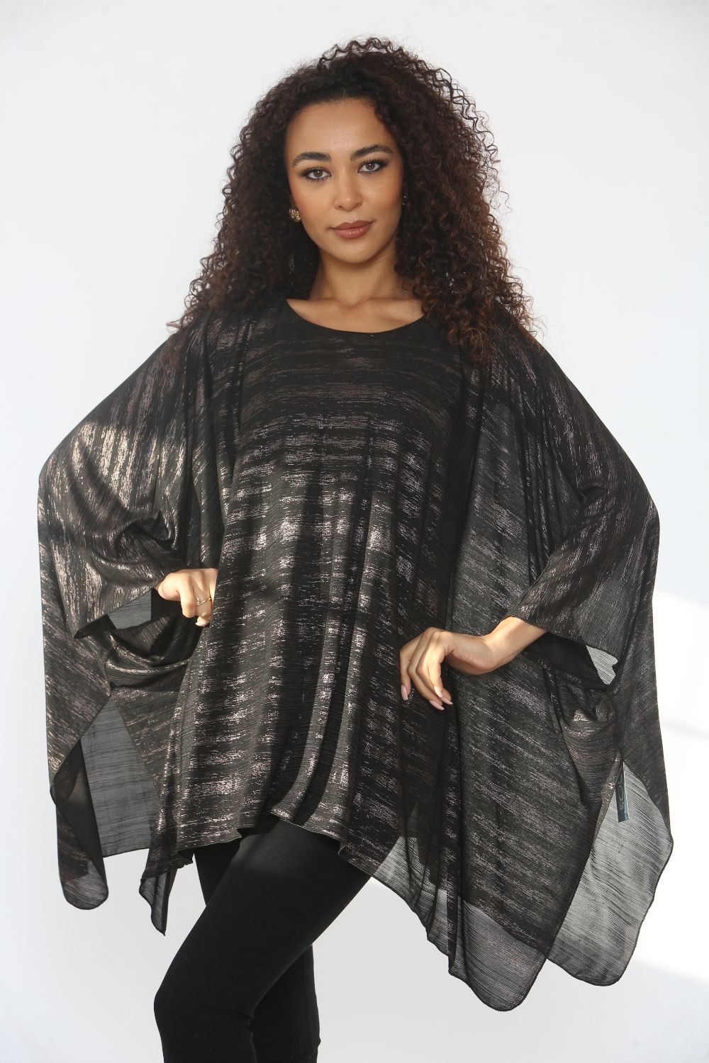 Un impresionante top largo con un lujoso cuerpo exterior de gasa con apariencia de seda y una capa inferior de gasa. Corte evasé con bajo elíptico y elegantes mangas de ángel. Un estilo favorecedor perfecto para una salida nocturna.