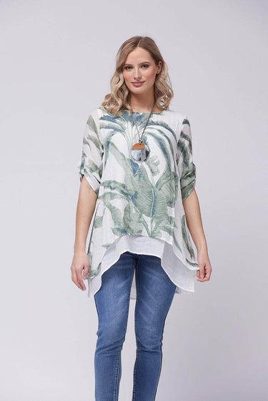 An A-line top constructed of a double-layer linen look fabric with a loose, relaxed fit. It features 3/4 length button tab sleeves and comes with a matching stylish necklace. This design offers plenty of breathability and a lightweight feel to keep you comfortable all day long. The versatile ensemble is sure to be a favourite addition to your wardrobe.