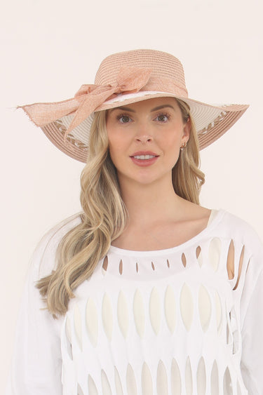 A stylish wide-brimmed sun hat made from a woven straw-like material. It features a colour gradient, transitioning from the crown to the brim. A prominent ribbon with a frayed edge is tied into a bow on one side, adding a feminine and elegant touch. The wide brim offers good sun protection, making it both fashionable and functional—perfect for outdoor events, beach outings, or garden parties.
