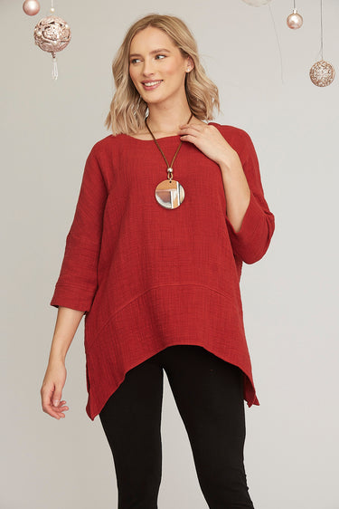 This top is a must-have for your wardrobe. Featuring a soft cotton texture, boat neck and extended shoulder, three-quarter sleeves, this piece can be dressed up or down. With side slits for ease of movement, it comes with a matching necklace* for the perfect finishing touch.
