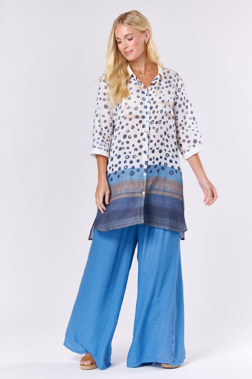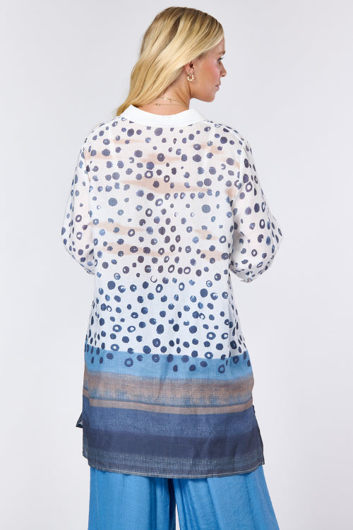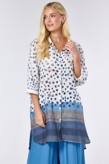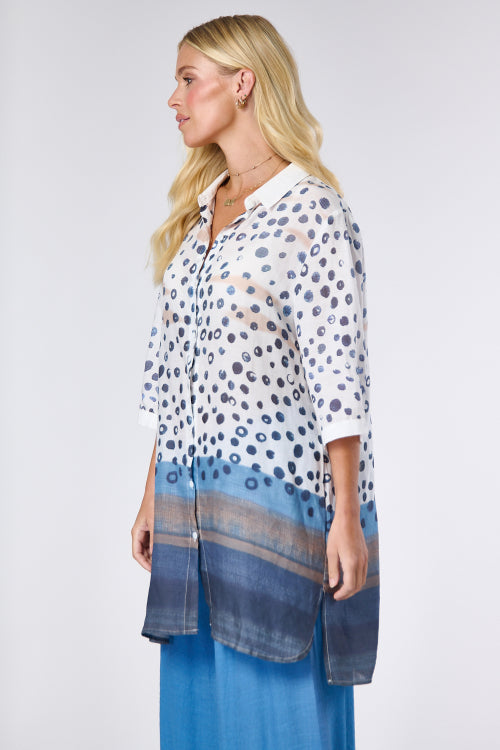 Elevate your style with this blouse. Featuring a classic collar and functional button front, this timeless piece exudes sophistication. The 3/4 sleeves and long dip back add elegance, while the border print brings a unique, artistic touch. Suitable for any occasion.