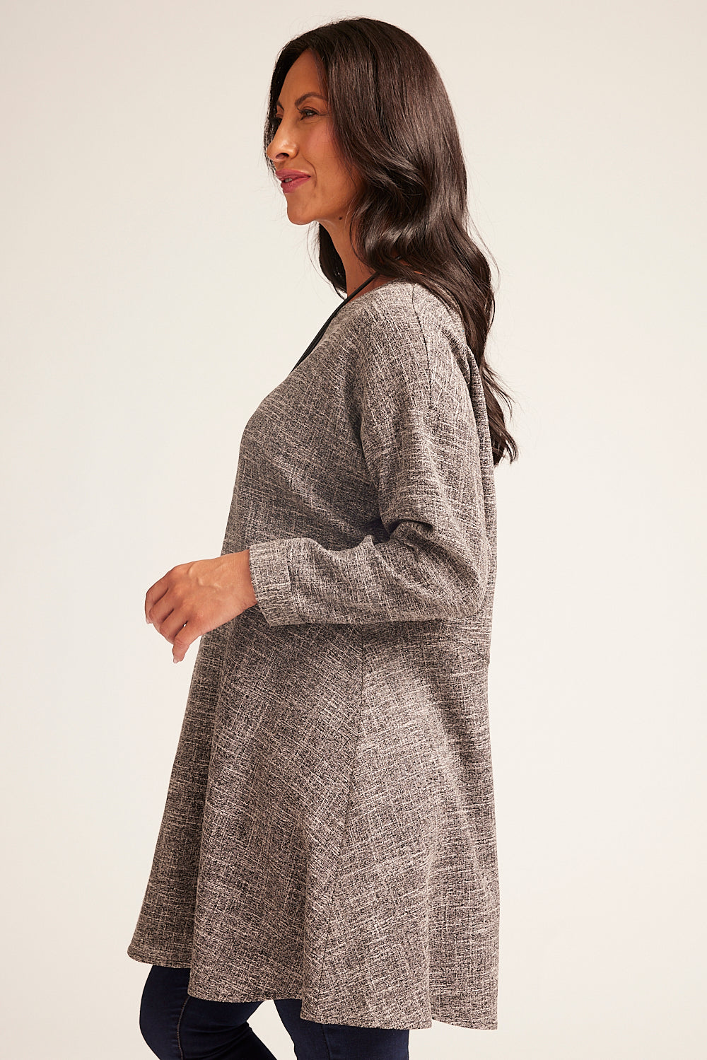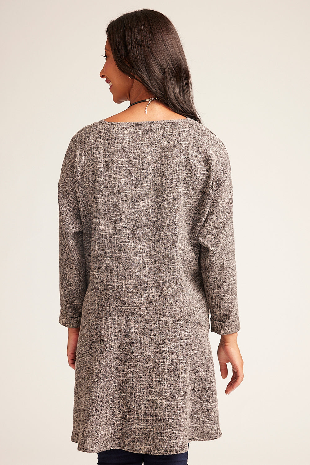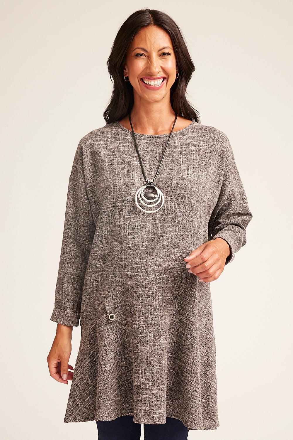 Our panelled A-line tunic is the perfect addition to any wardrobe. Featuring long sleeves, a boat neckline, and turned cuffs, this style is both comfortable and fashionable. Additionally, the textured fabric and front pocket with button detail add an extra touch of elegance.