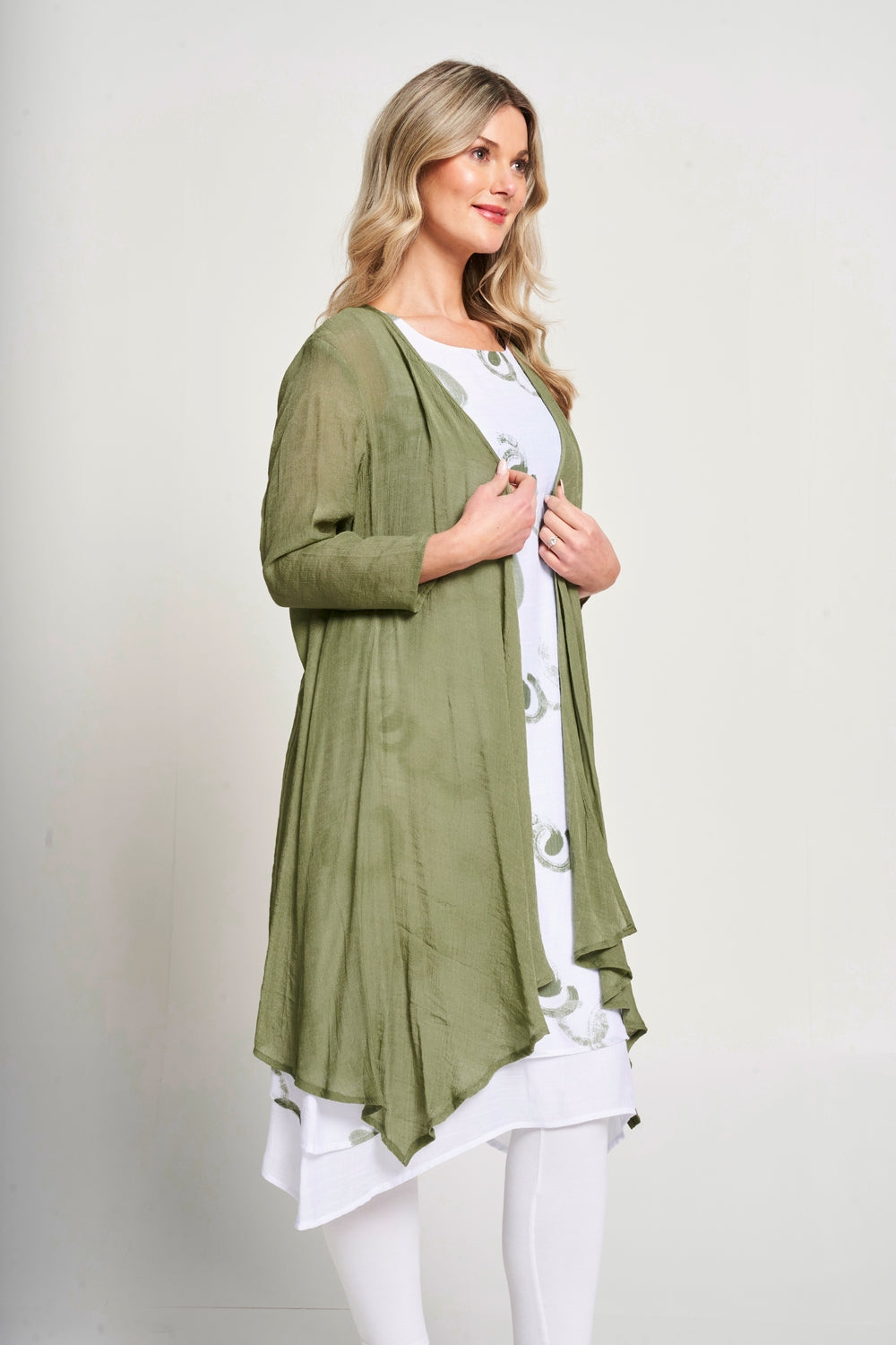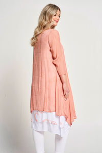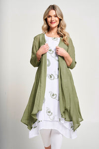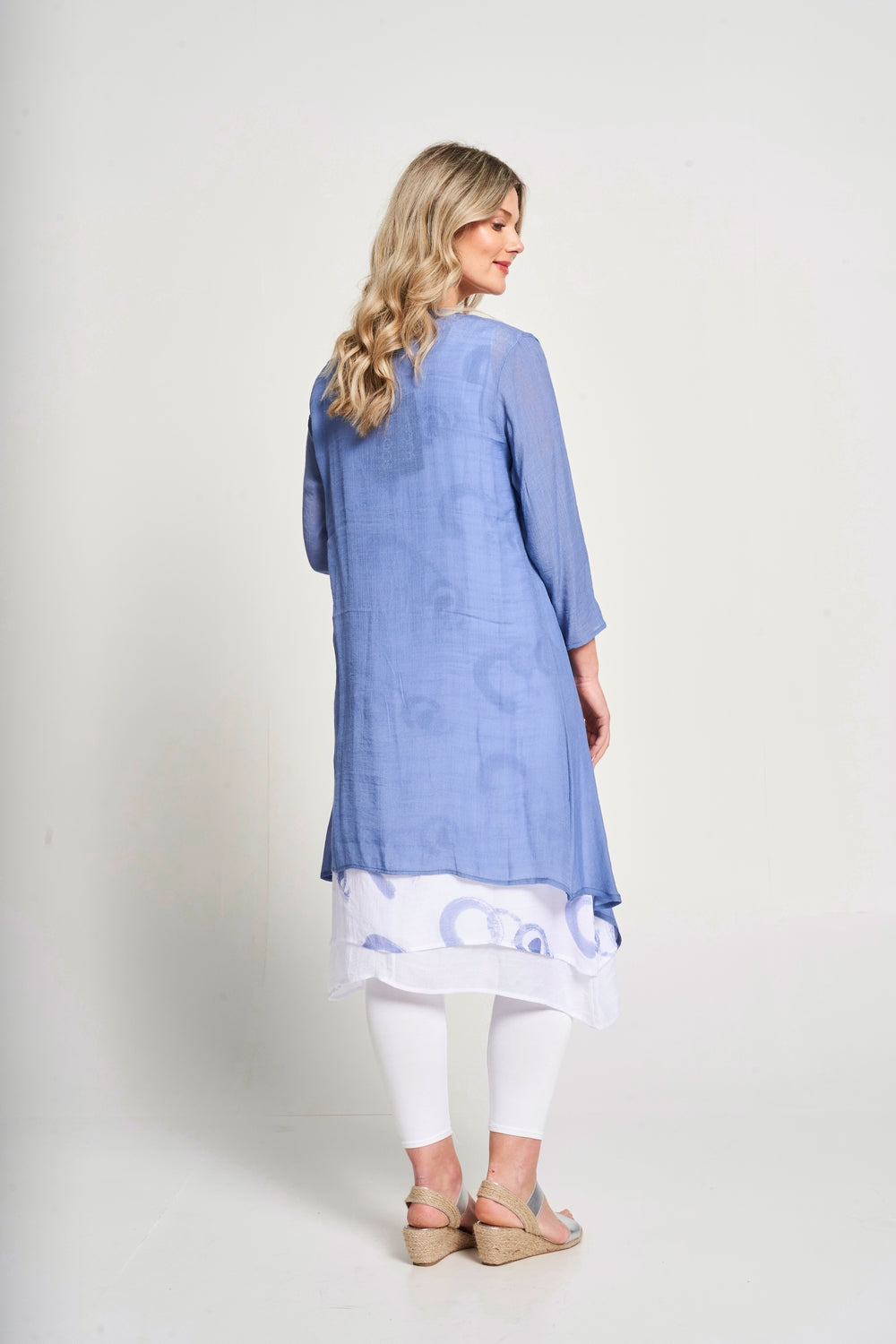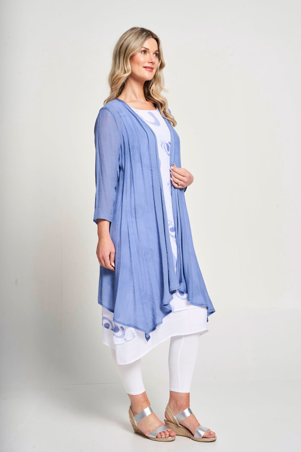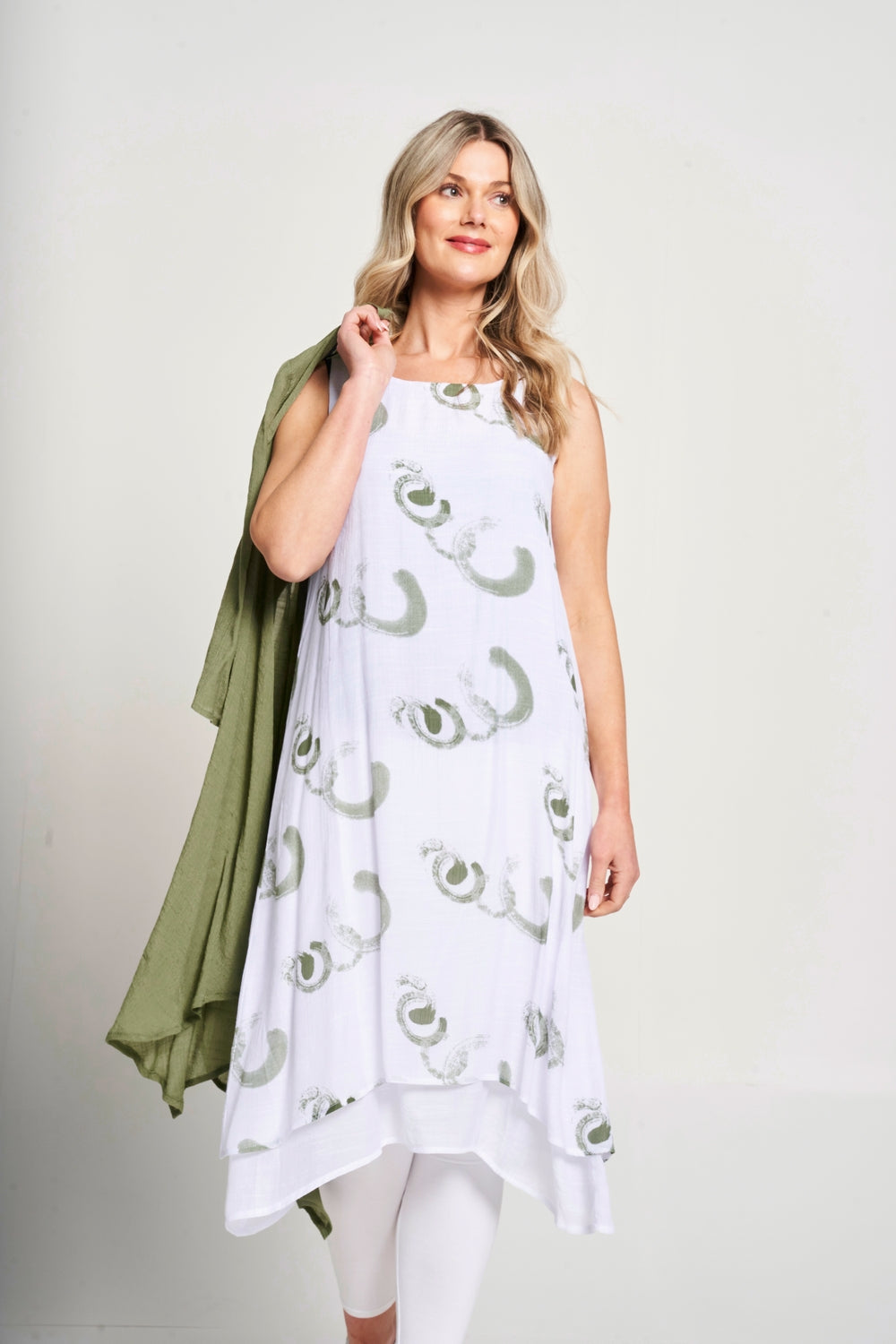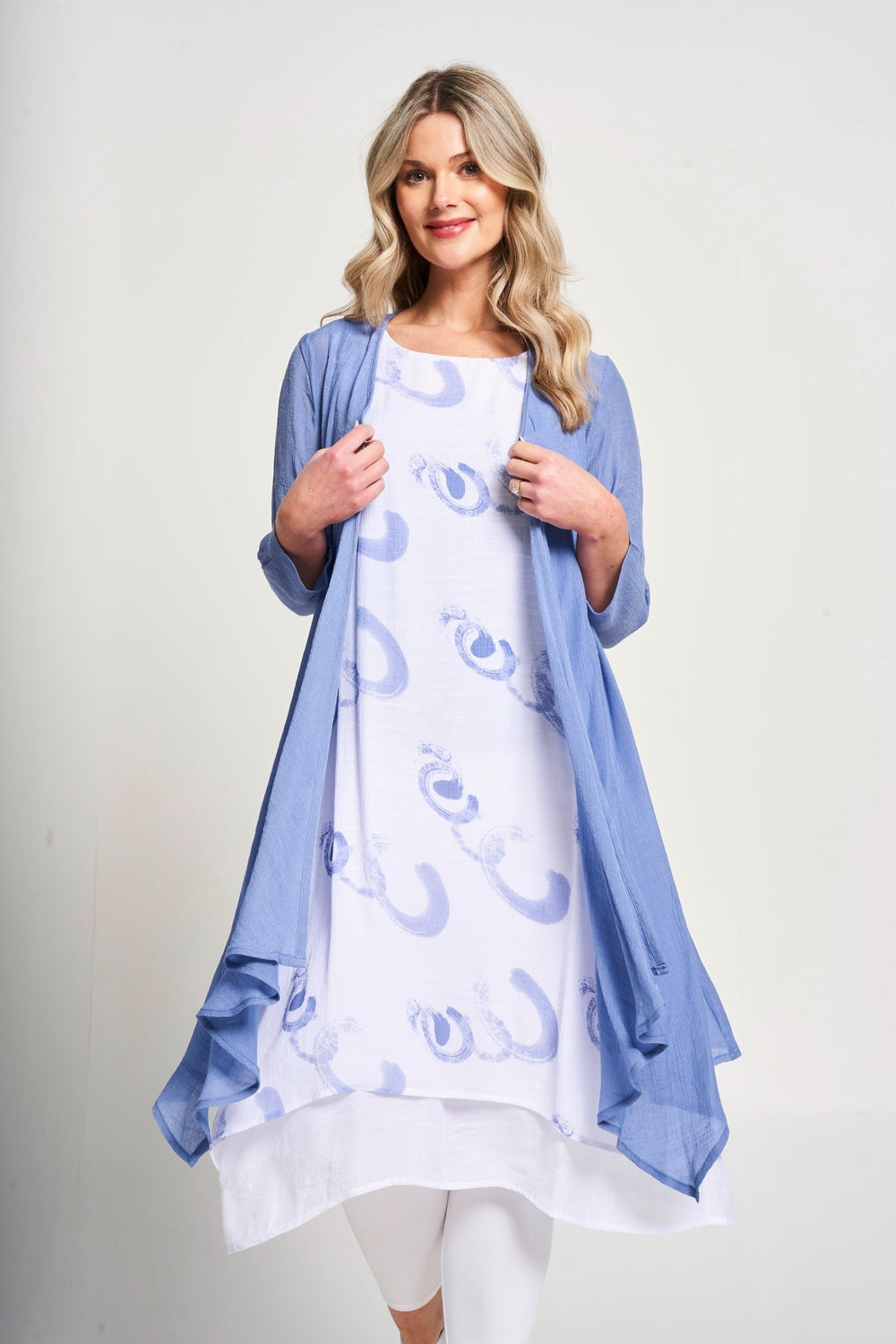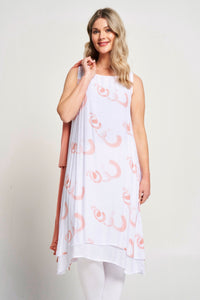 Effortlessly transition from day to night with our 2-in-1 dress. The sleeveless double layer printed dress is perfect for any occasion, while the floaty jacket adds a touch of elegance. Stay stylish and versatile with this must-have piece.