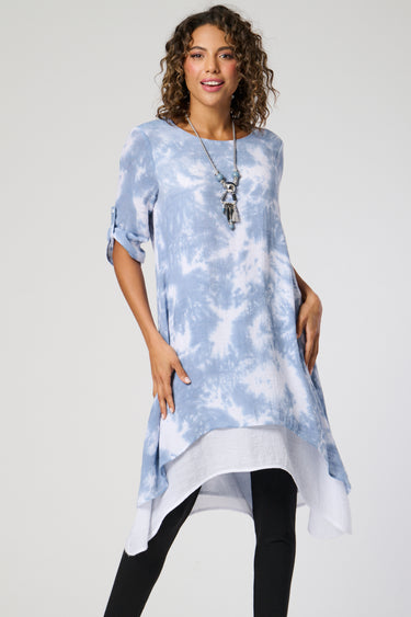 This tie dye dress features a flattering high-low hem and ruched button tab sleeves for a stylish look. The double layer design adds dimension and the matching necklace* completes the ensemble. Perfect for any occasion, this dress is a must-have for your wardrobe.