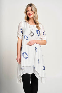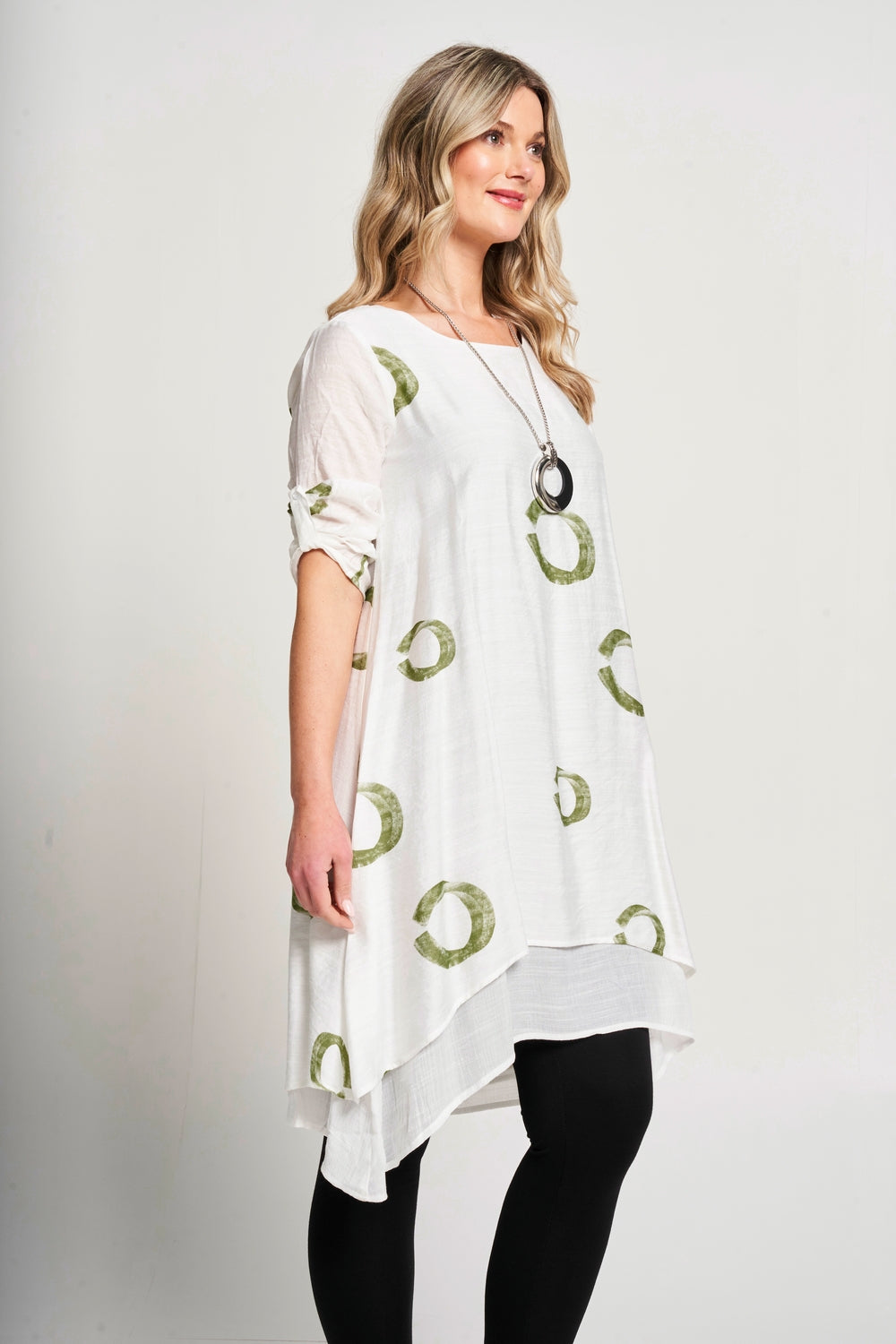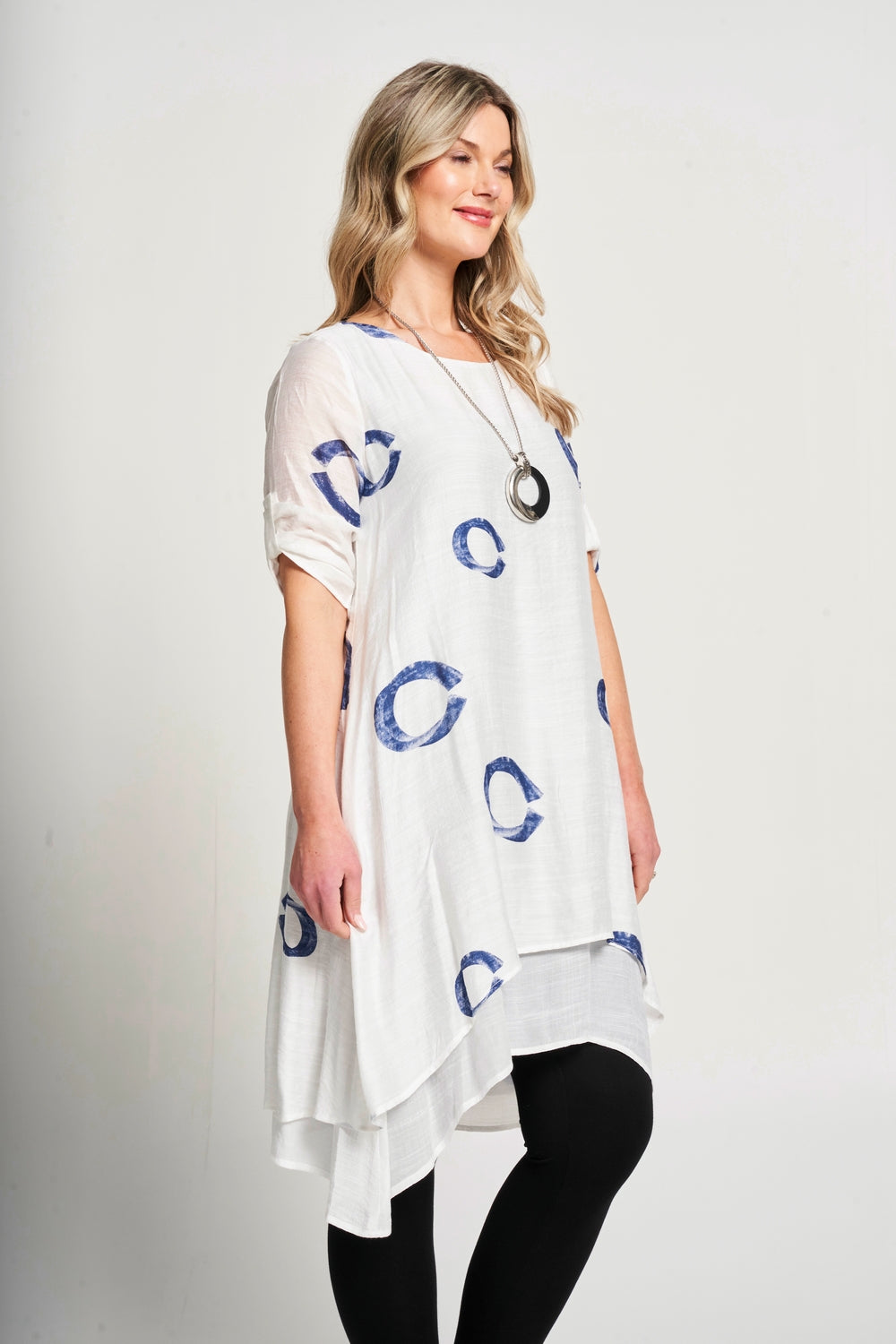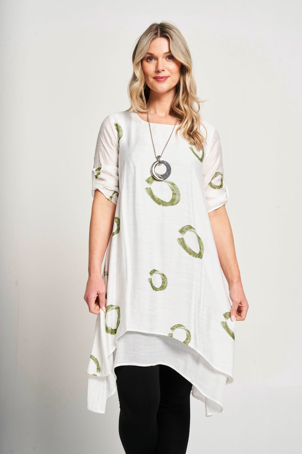 This dress features a stylish double layer design and convenient roll up sleeves. The A-line cut flatters all body types while the included matching necklace* adds an elegant touch. The round neck completes the sophisticated look. Perfect for any occasion.