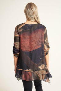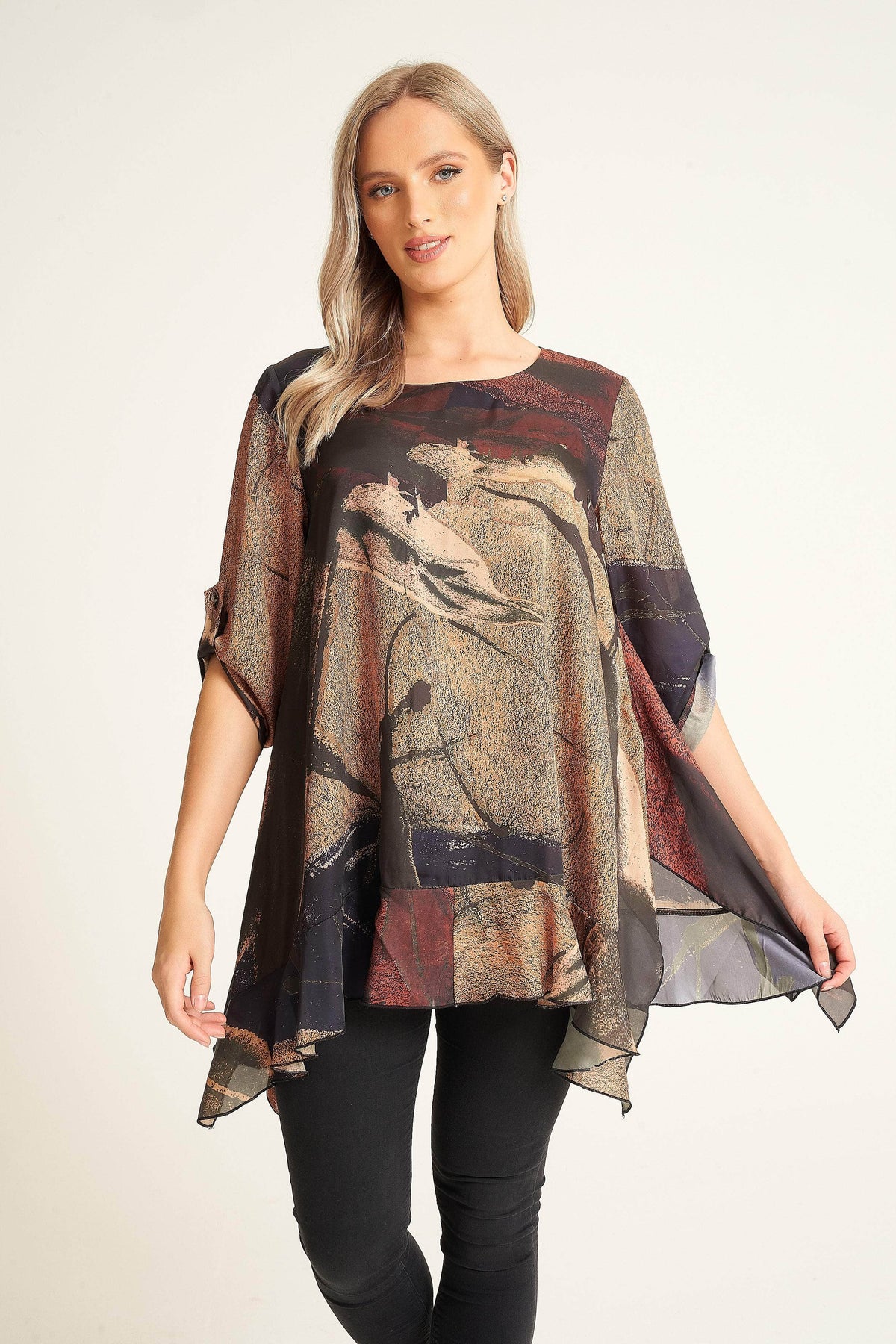 Simply stunning, this flowing frilled hem tunic top has a gorgeous silk-feel in a striking autumnal print. Complete with side slits and 3/4 button-tab sleeves.