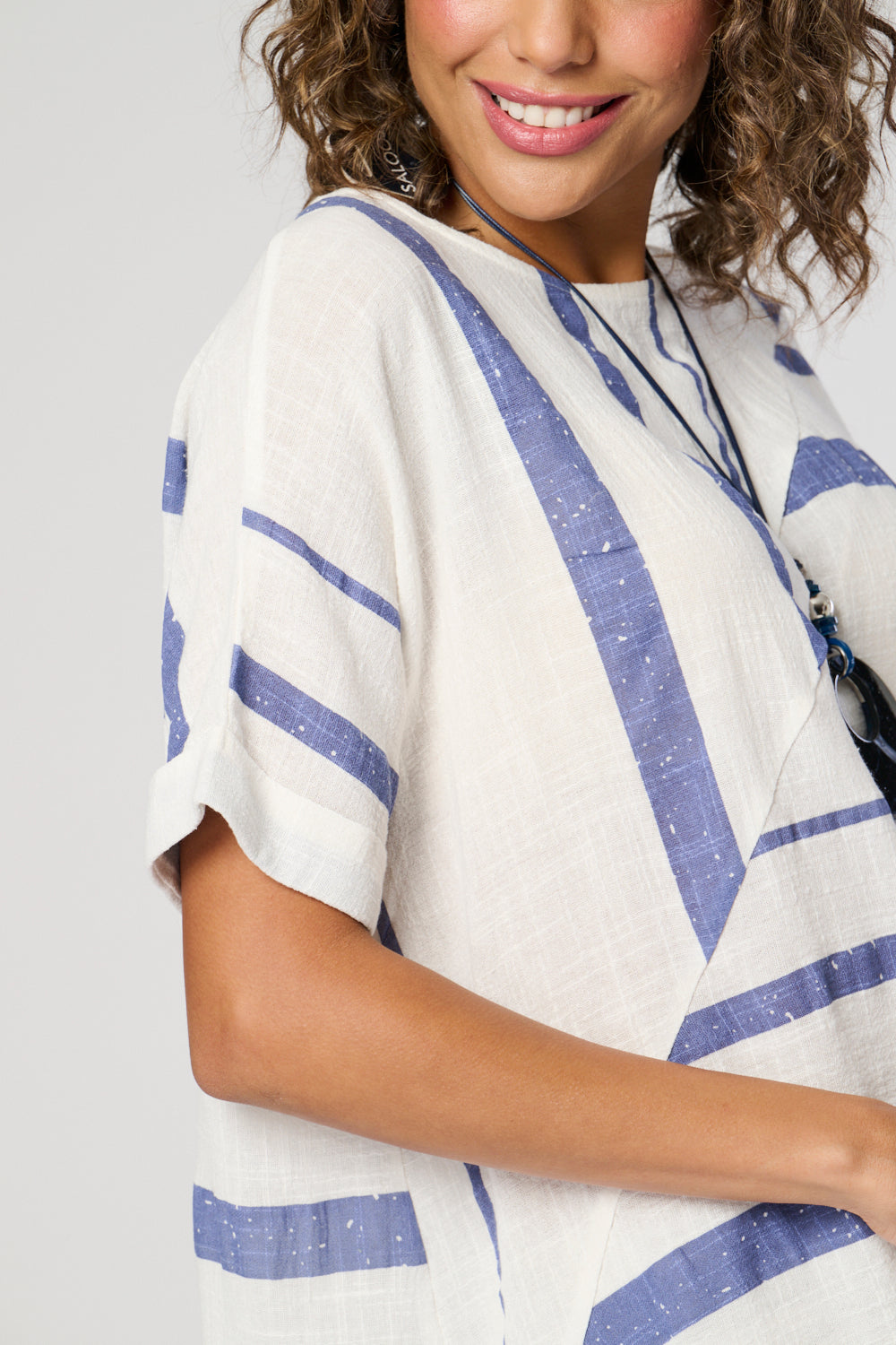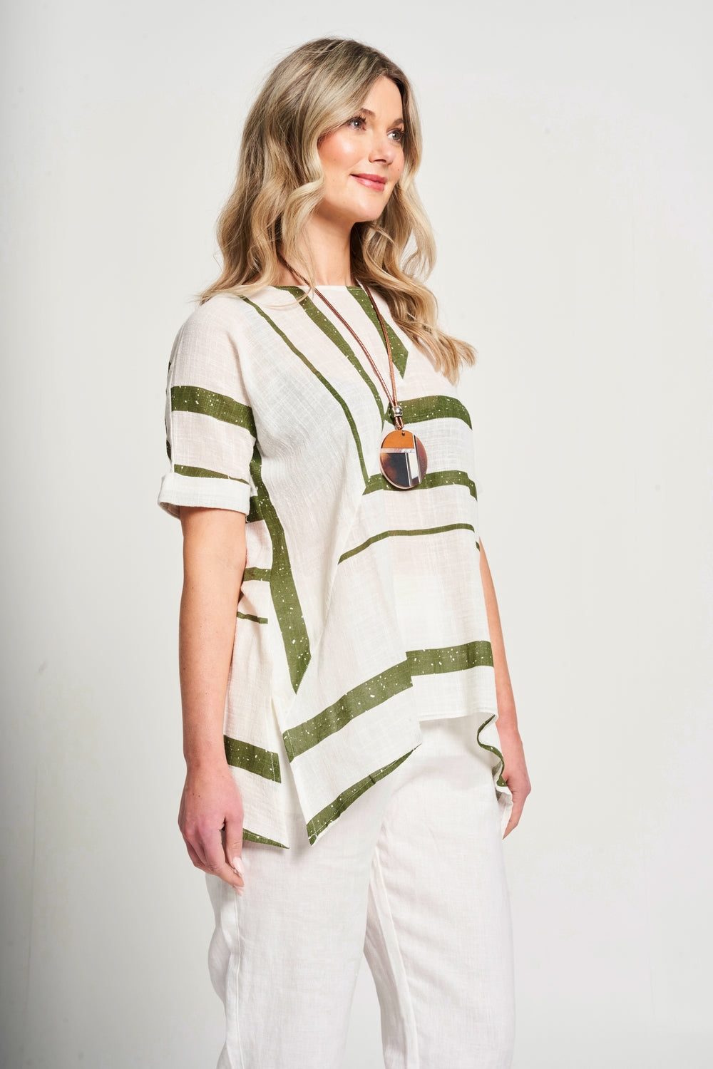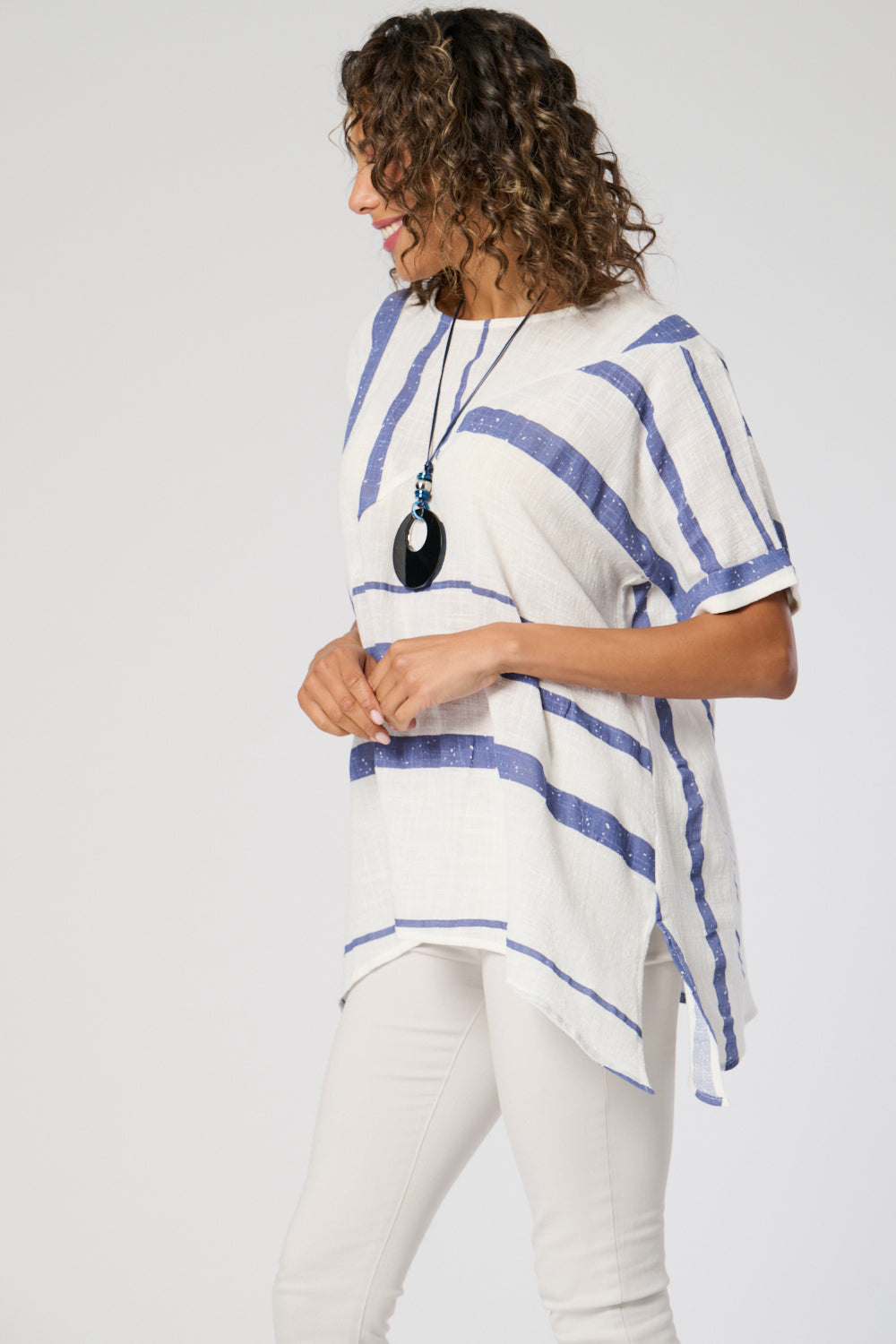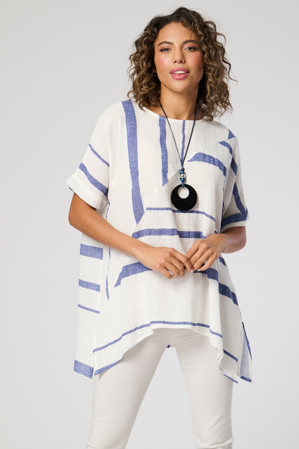Expertly tailored with a diagonal seam and panelled design, this top is a must-have for your wardrobe. The extended shoulder short sleeves provide comfort and the stripy print adds a touch of style. Made of lightweight cotton, it comes with a matching necklace* for effortless accessorizing.
