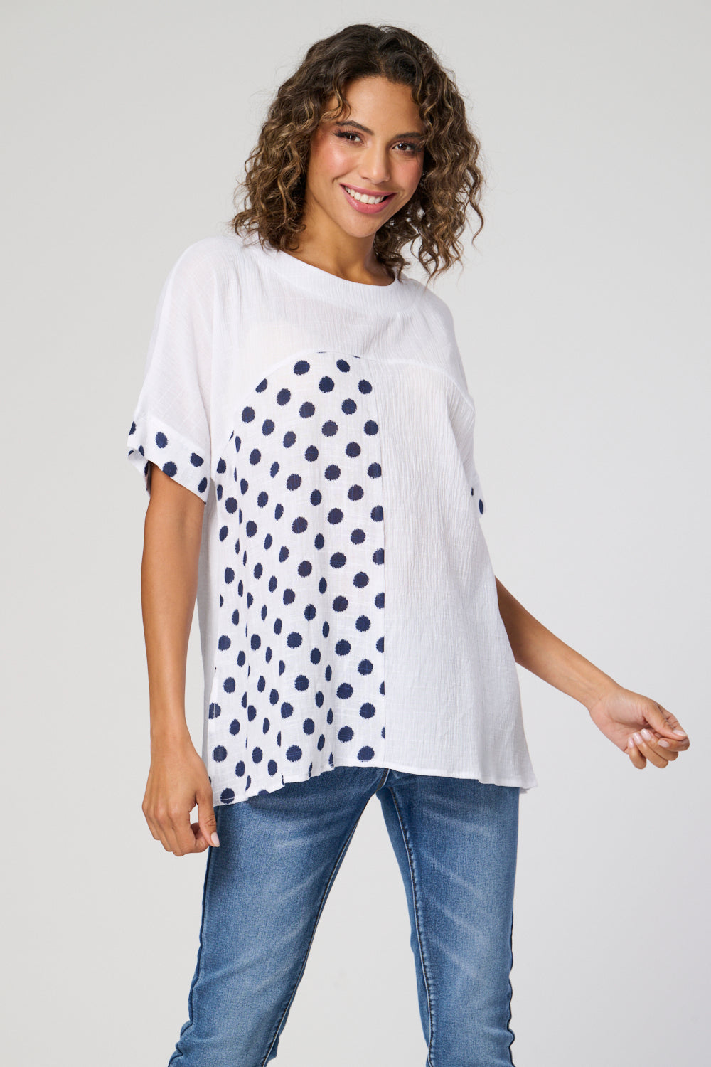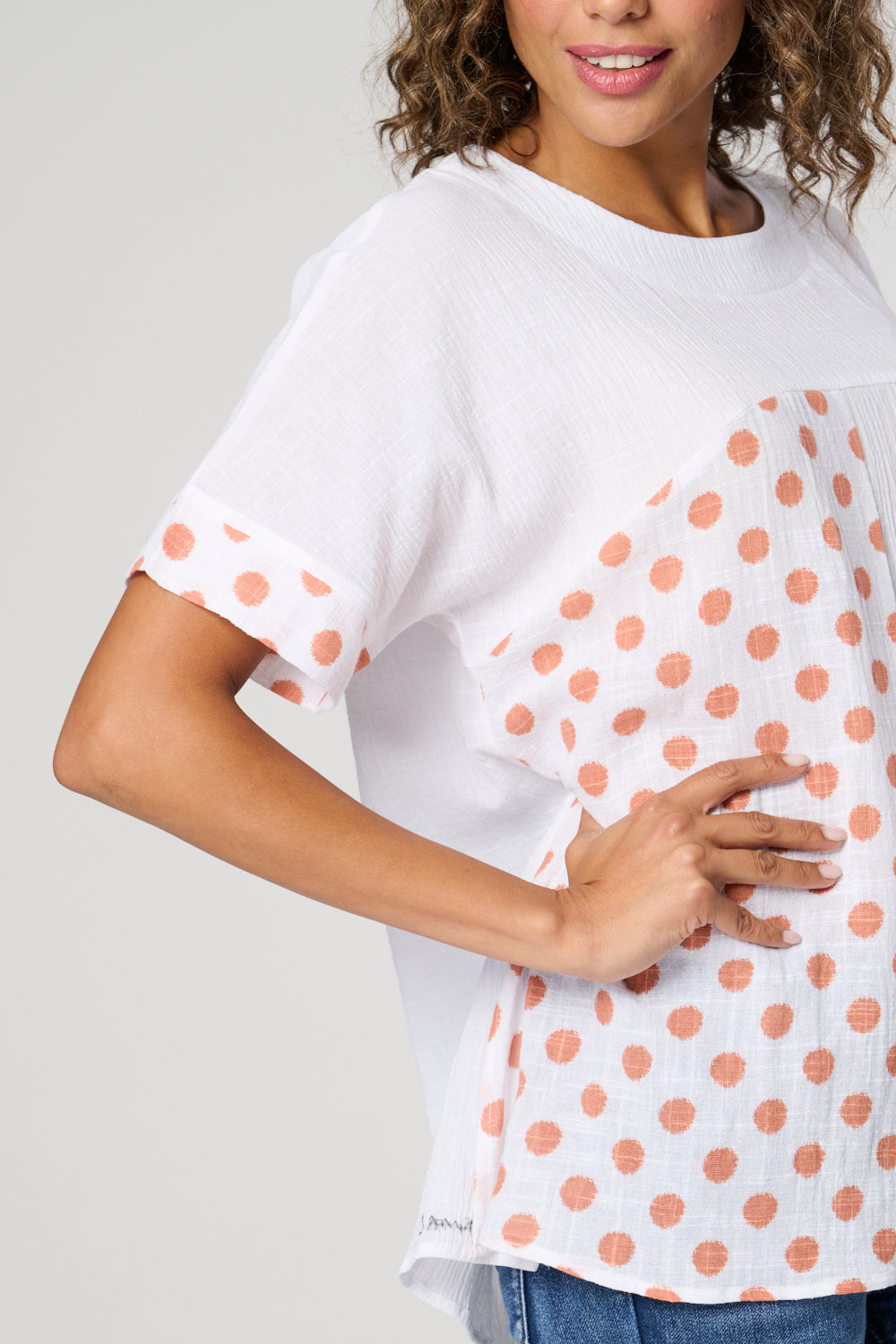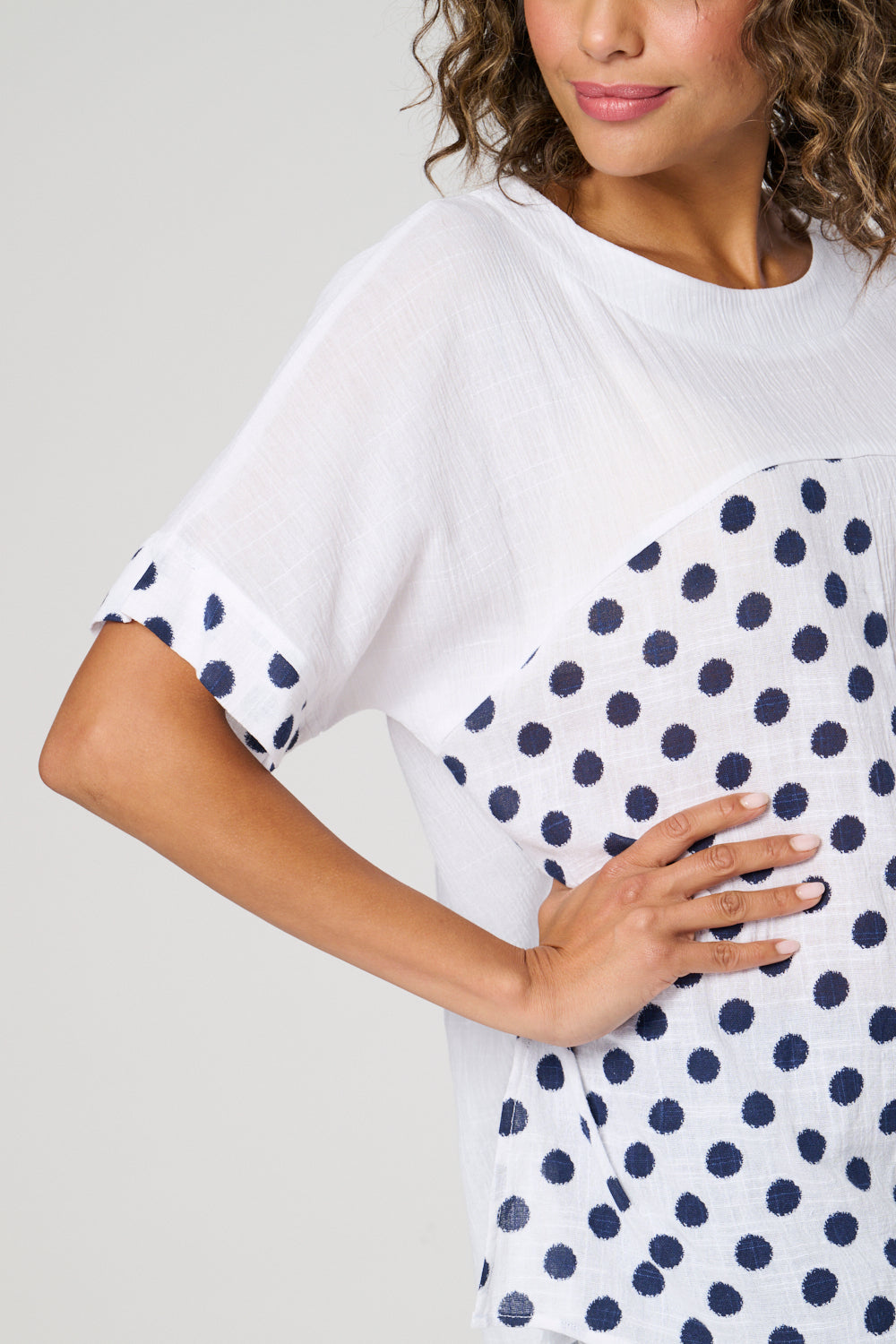 This cut about top is made with cotton for a comfortable and breathable fit. The short sleeves and panelled design create a modern and flattering look. Complete with a stylish spot print, this top is perfect for adding a touch of pattern to your wardrobe.