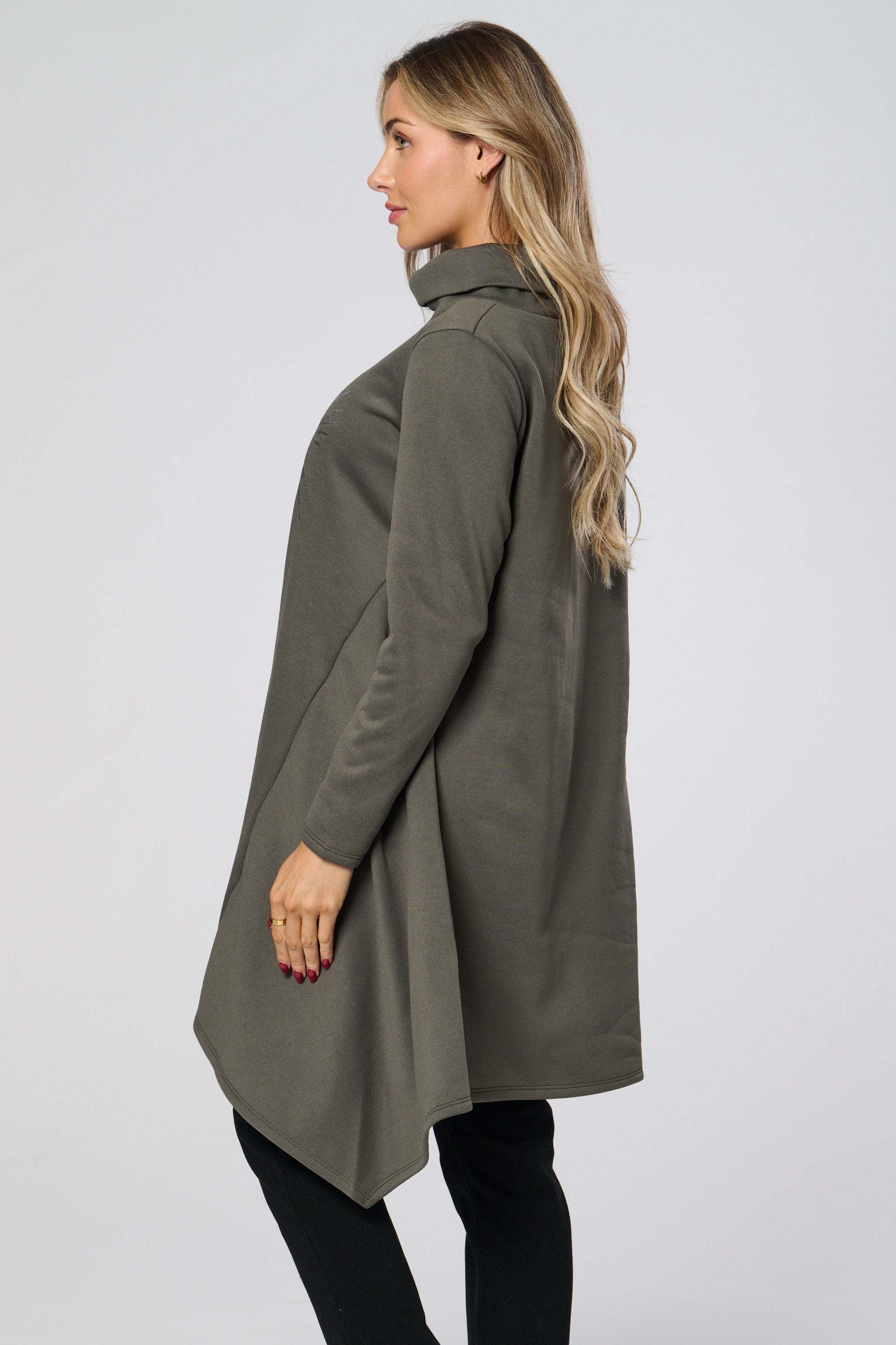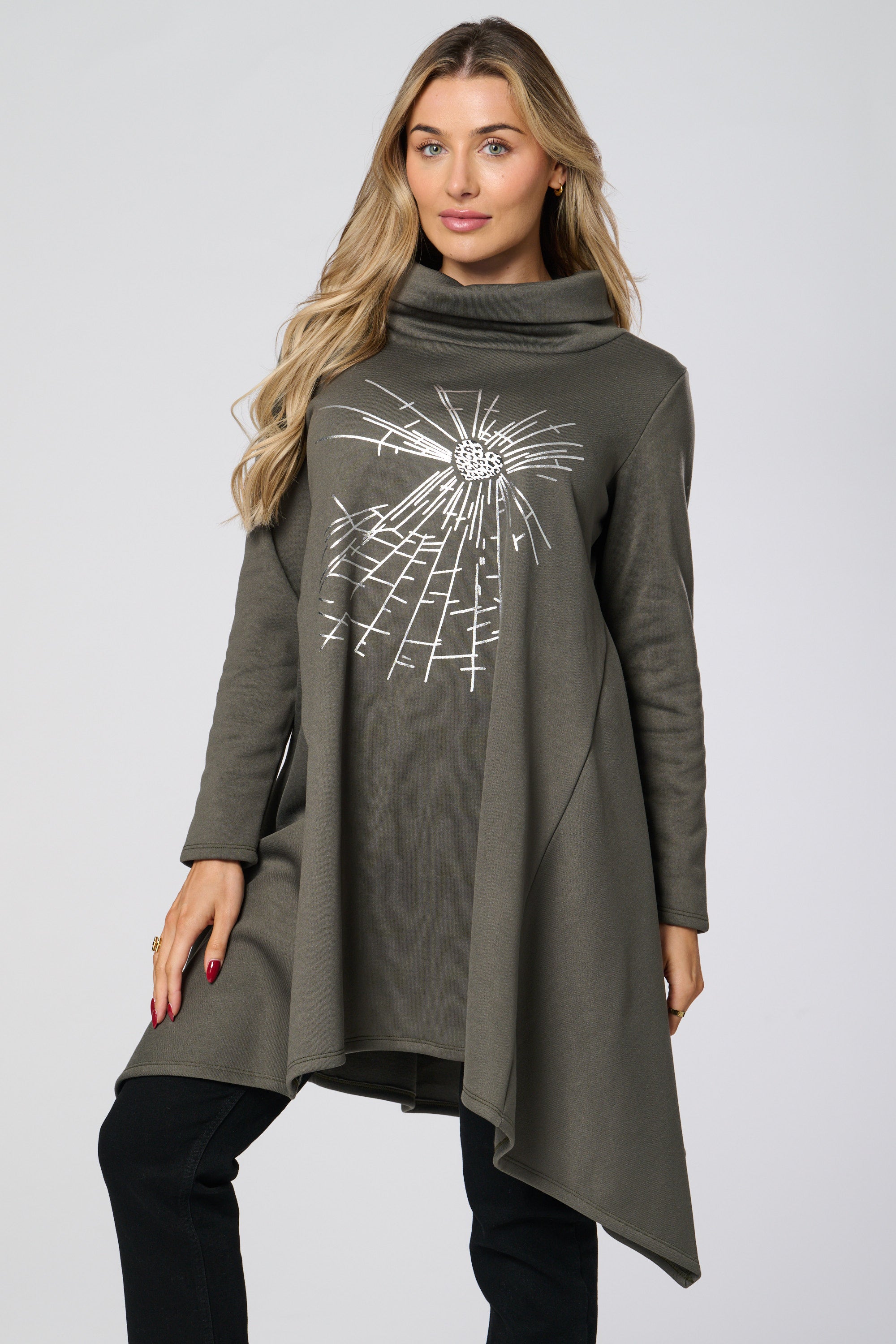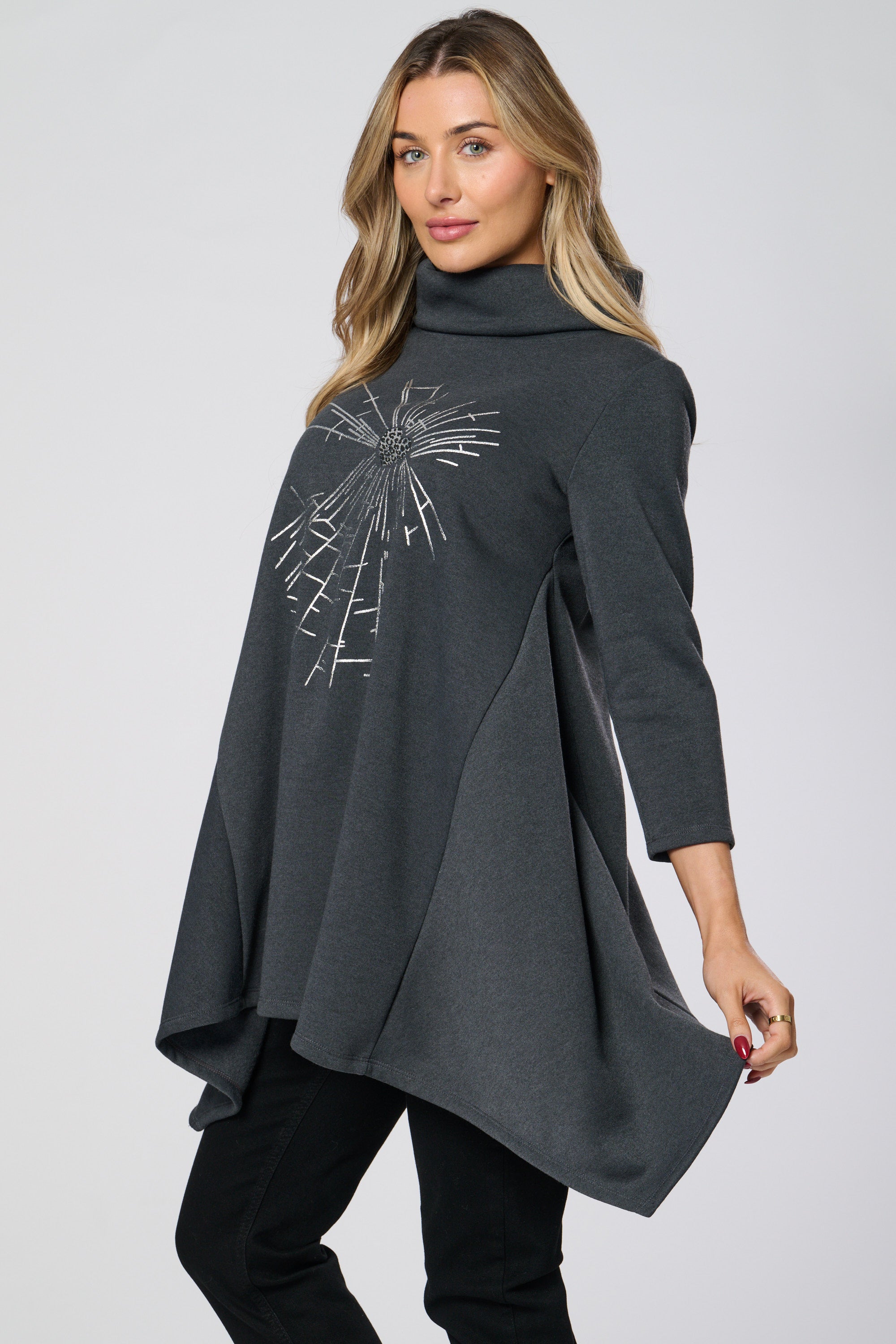 Introducing the Saloos Cowl Neck Tunic Top! Elevate your everyday look with the glimmering heart design and stay cozy on chilly days with the cowl neckline, 3/4 length sleeves, and curved hemline. Perfect for adding a touch of glam to any outfit!