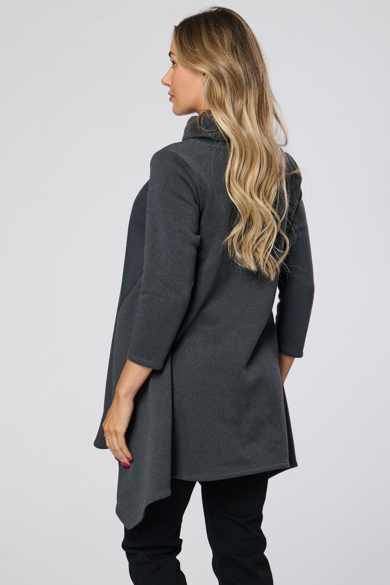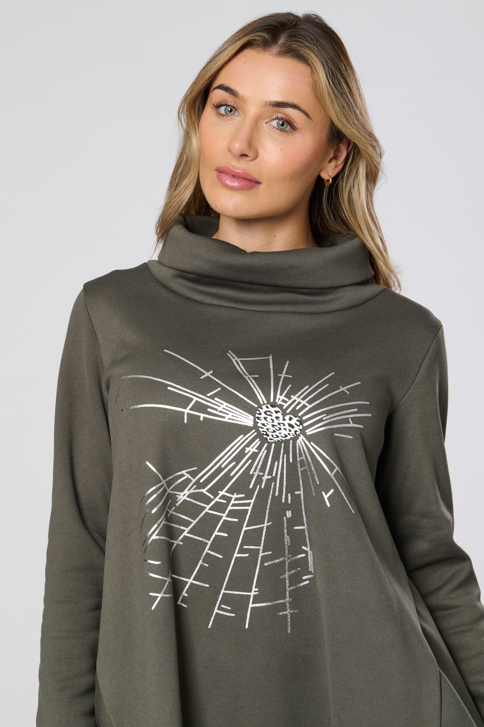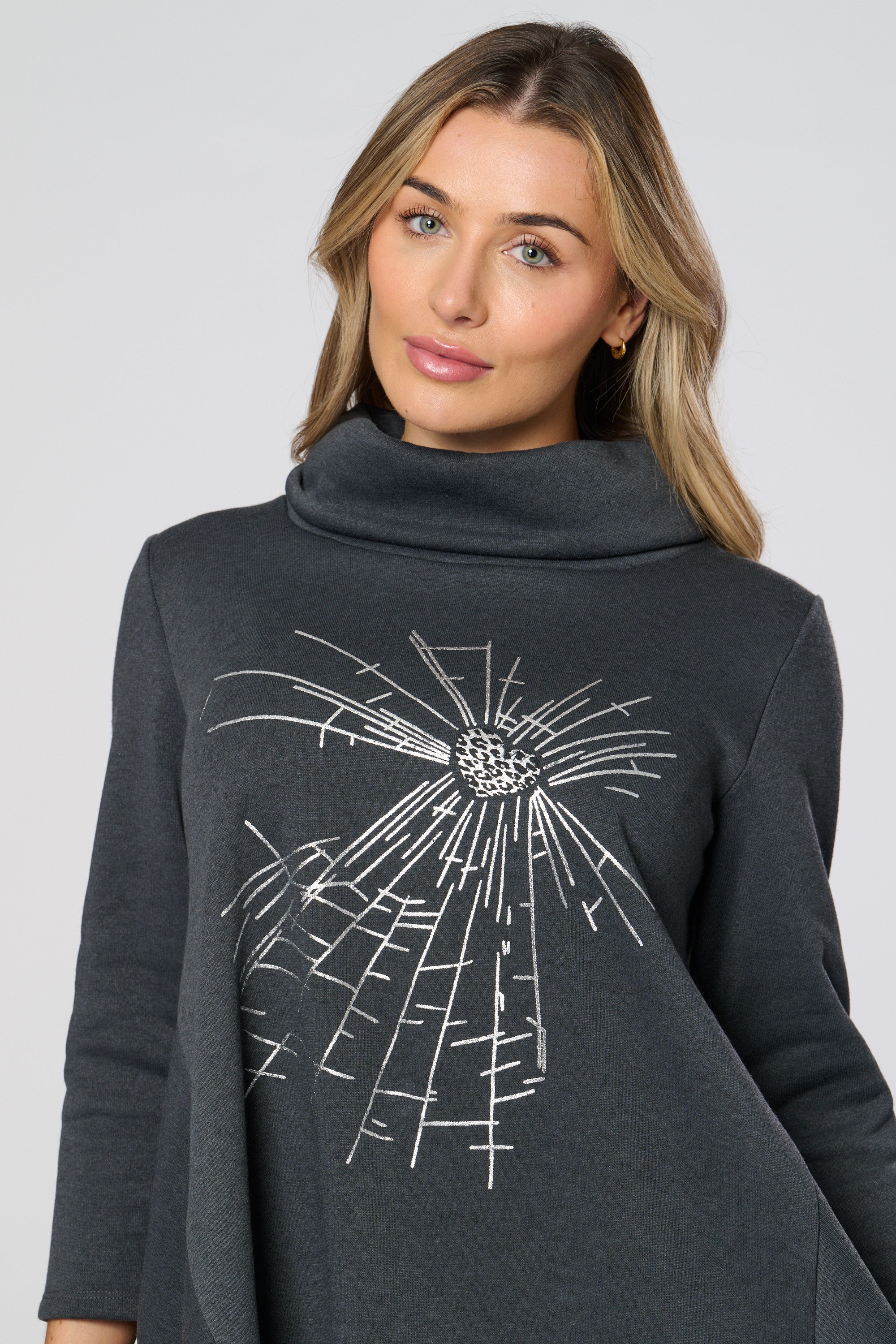 Introducing the Saloos Cowl Neck Tunic Top! Elevate your everyday look with the glimmering heart design and stay cozy on chilly days with the cowl neckline, 3/4 length sleeves, and curved hemline. Perfect for adding a touch of glam to any outfit!