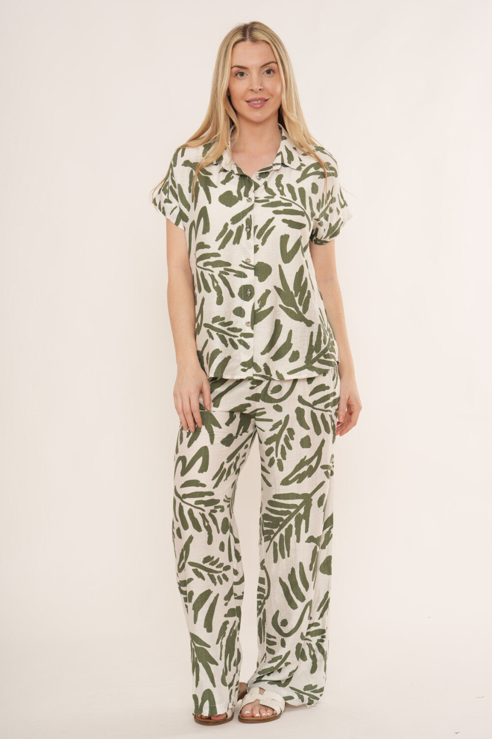 Crafted from a lightweight, breathable fabric, they feature a soft elasticated waistband for an easy, flattering fit and all-day comfort. The bold leaf-inspired print contrasts beautifully against the light background, creating a modern, eye-catching design that pairs effortlessly with simple tops and sandals.