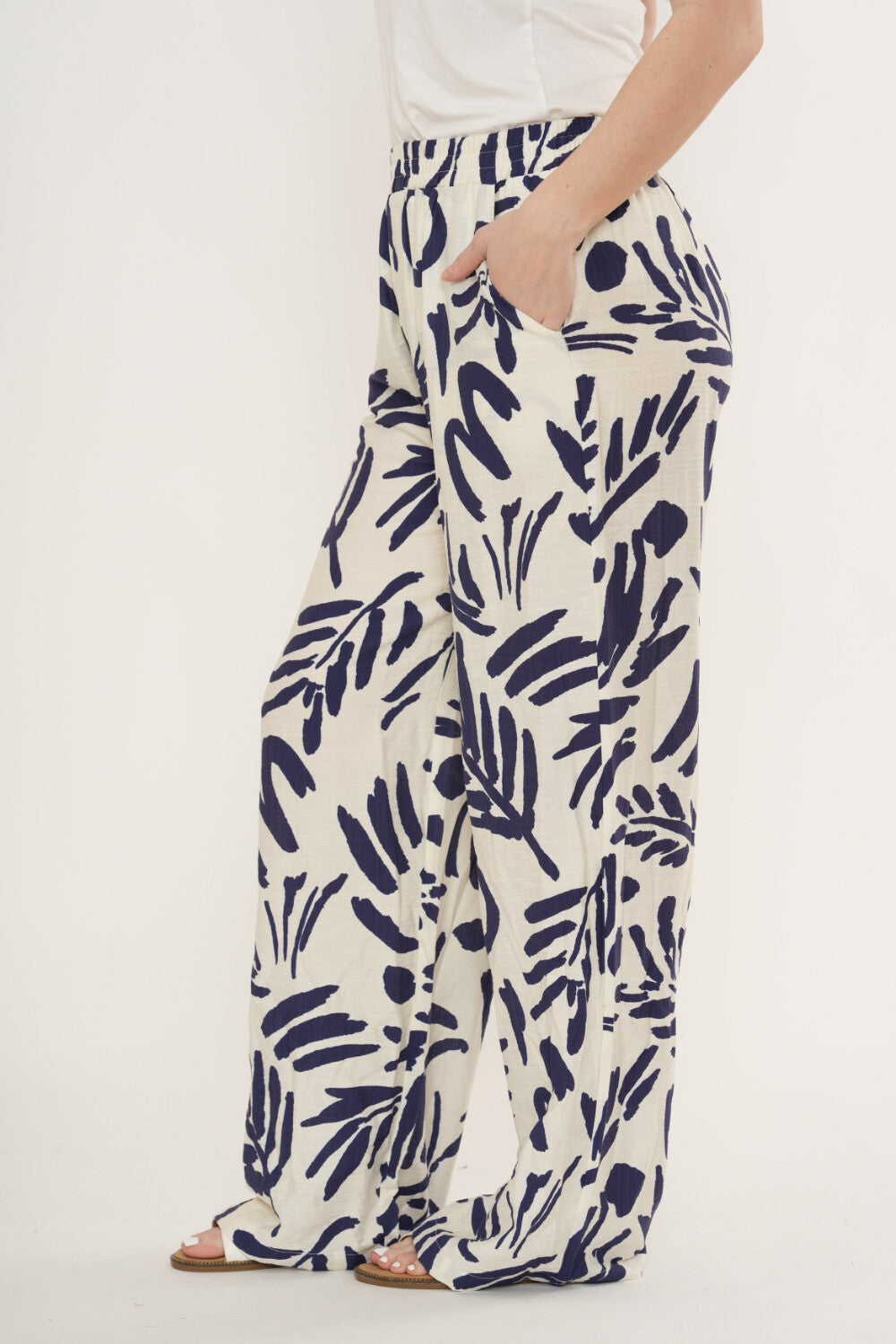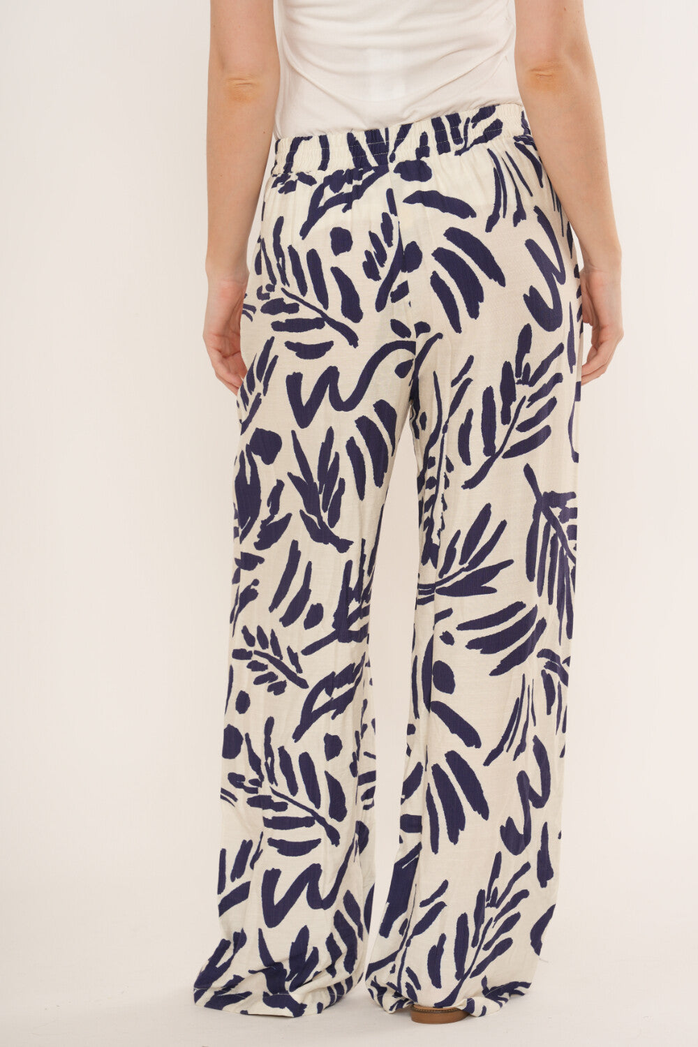 Keywords: women’s wide-leg trousers, navy print trousers, khaki print trousers, botanical print pants, summer wide-leg trousers, elastic waist trousers, casual women’s trousers.