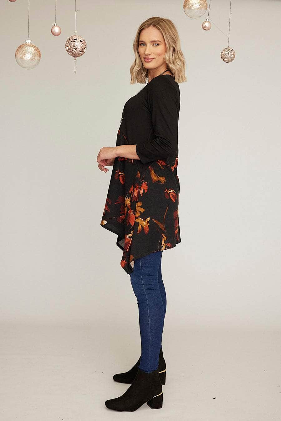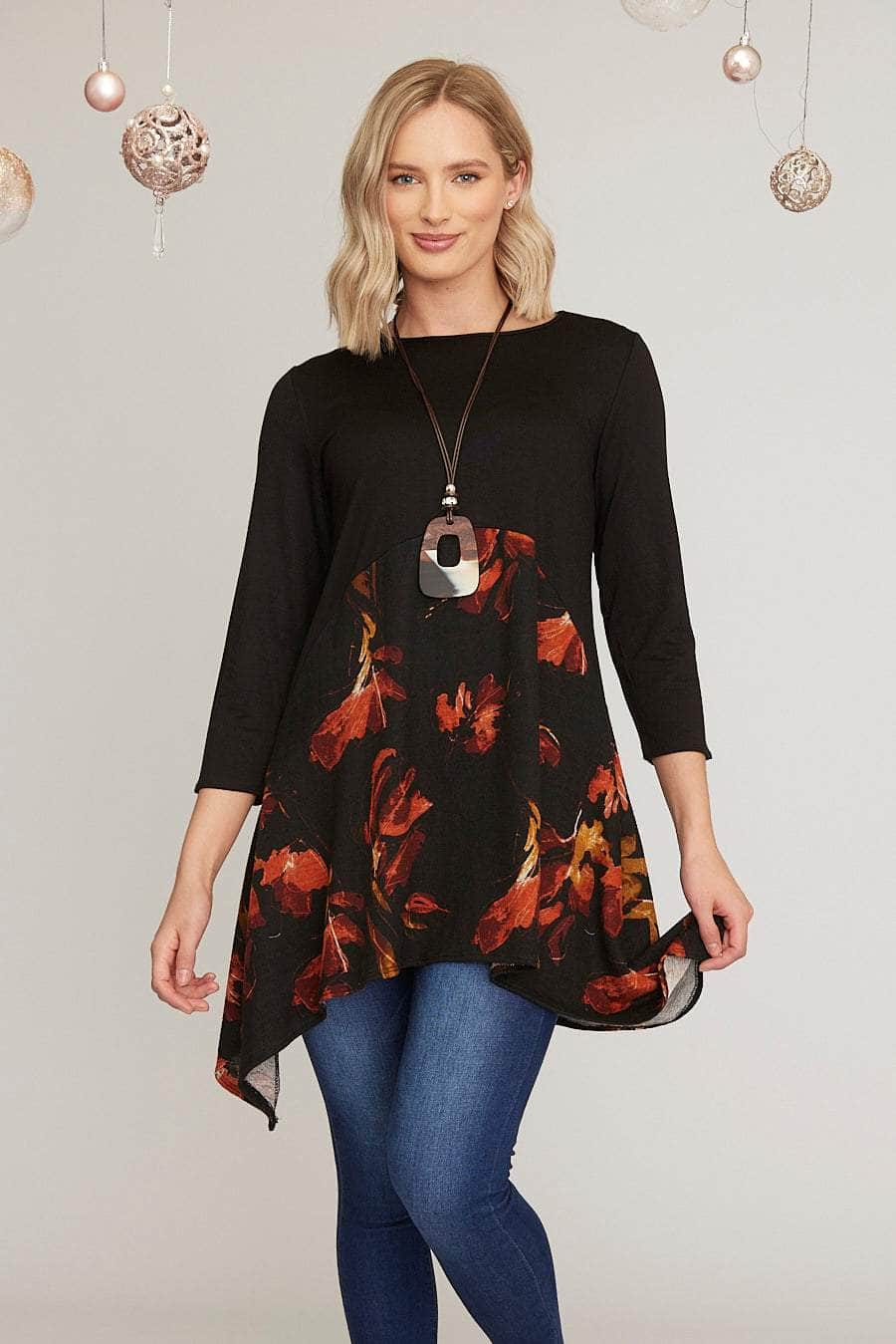 An A-line tunic dress featuring a striking autumn leaves print lower half contrasted by a plain black upper half. A flattering fit and flare cut with stylish exaggerated dipped hems and bracelet-length sleeves. It comes with a complementary necklace*