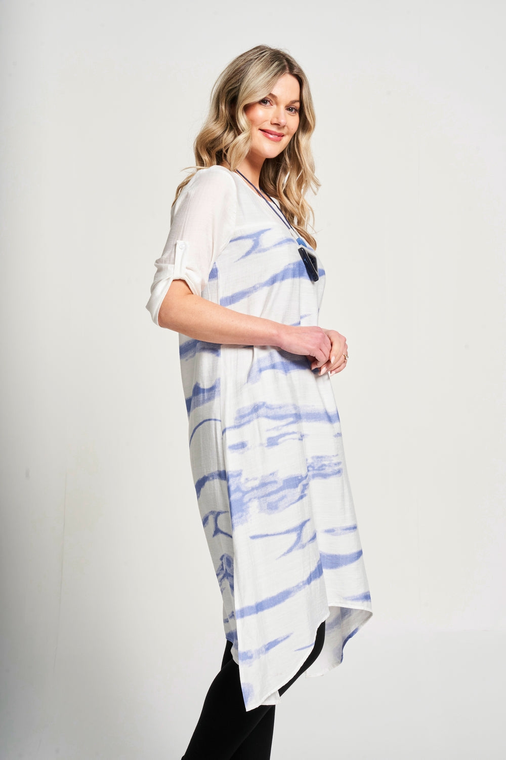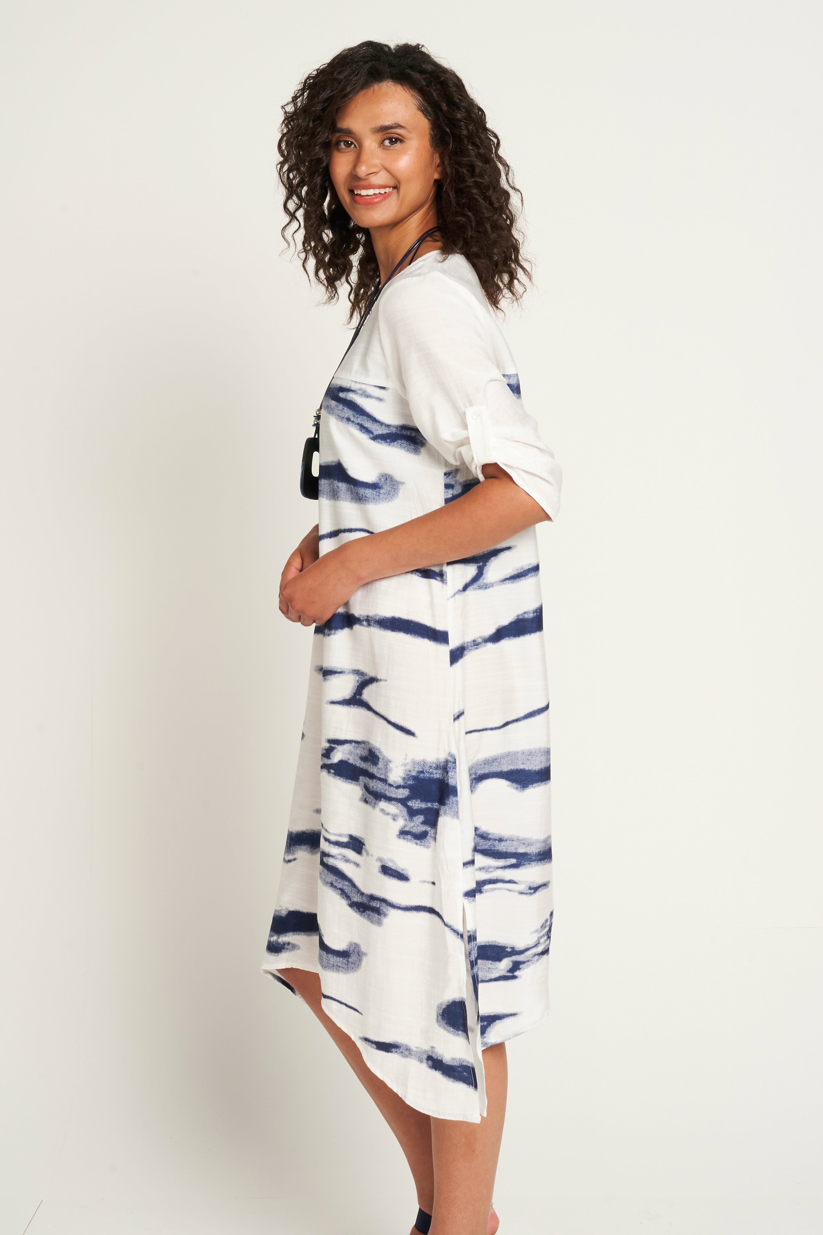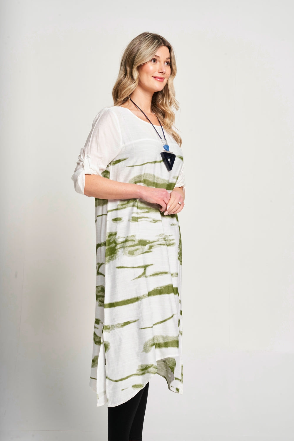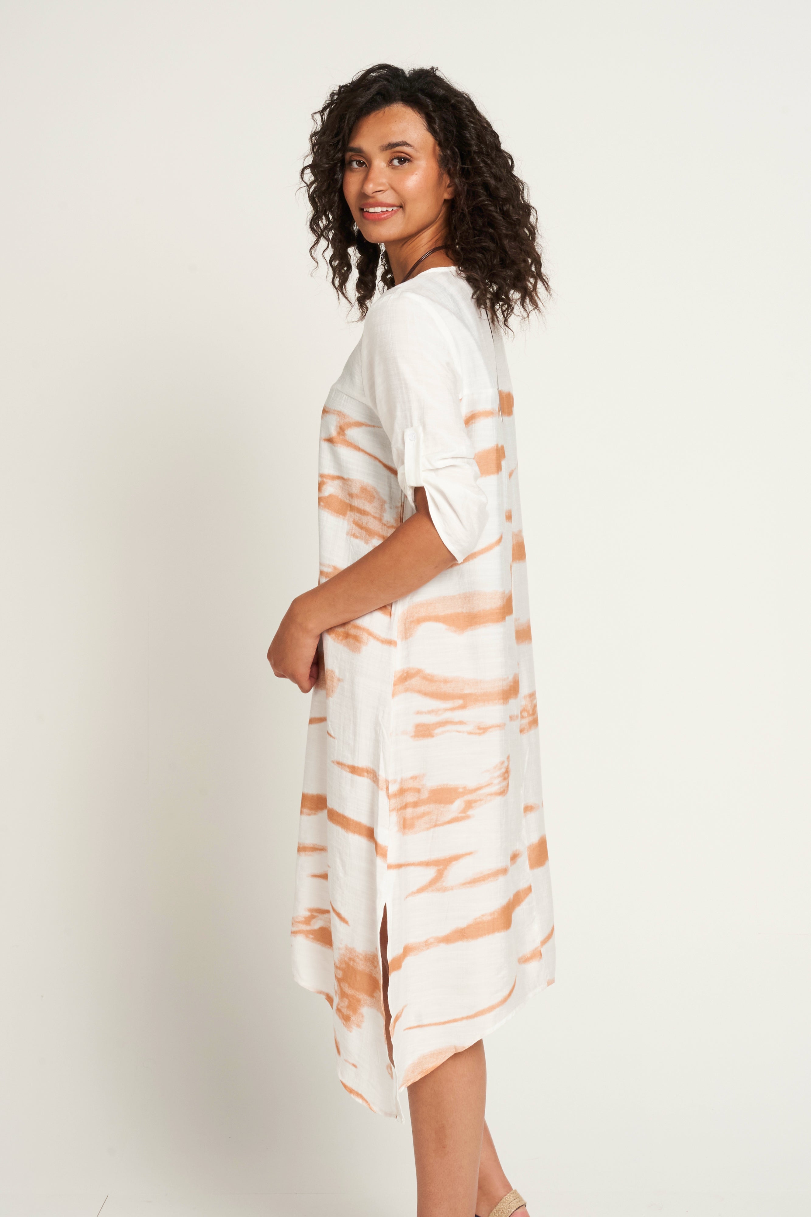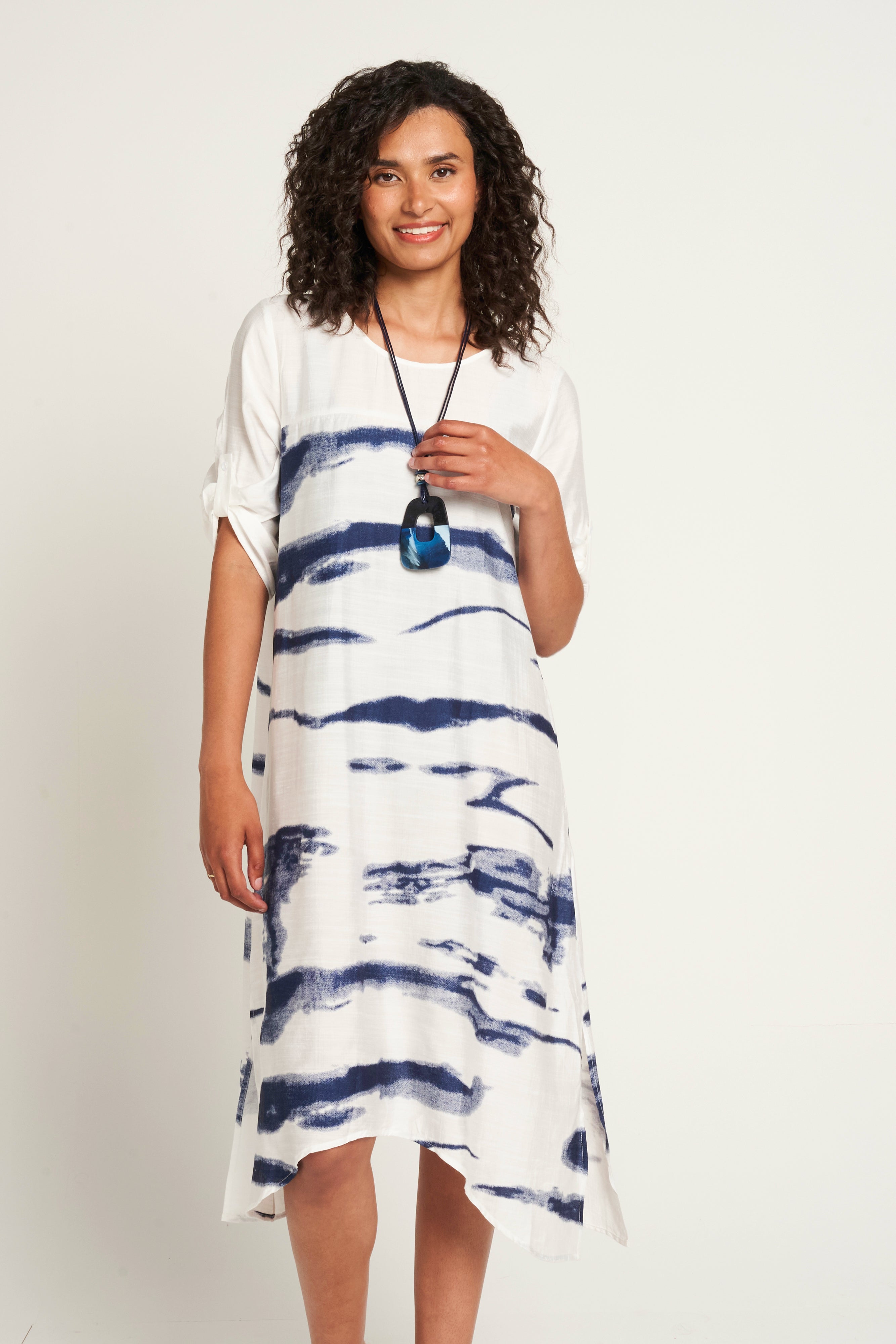 Elevate your style with our Ruched Sleeve Print Dress. The ruched sleeve with button tab adds a touch of elegance, while the round neck and dipped sides with slit provide a flattering fit. Complete your look with the matching necklace* for a polished, put-together appearance.