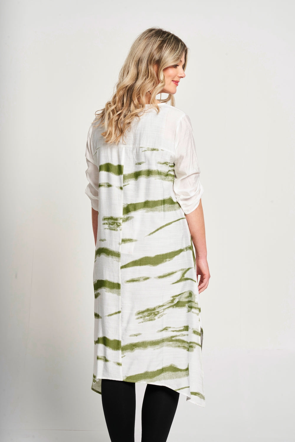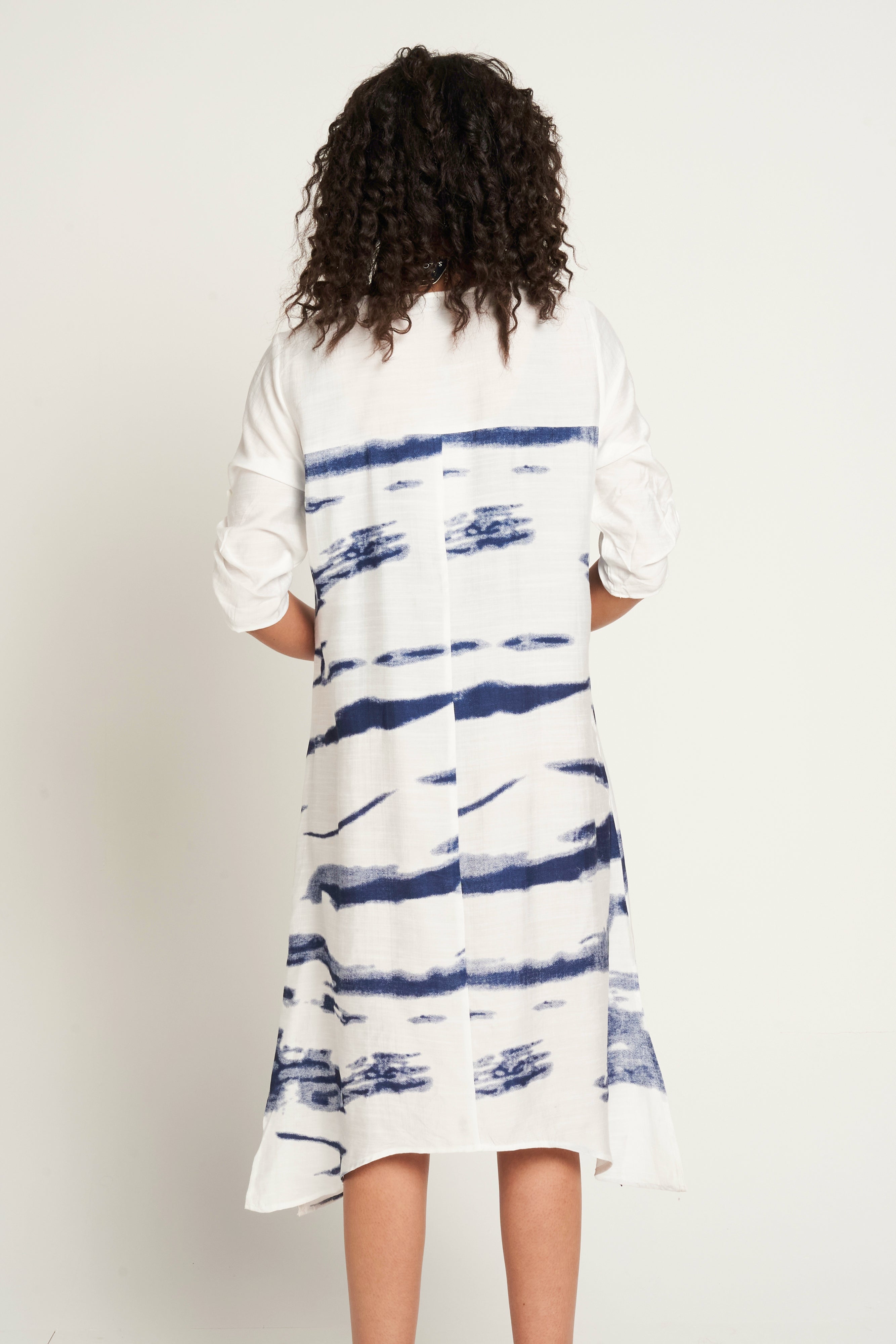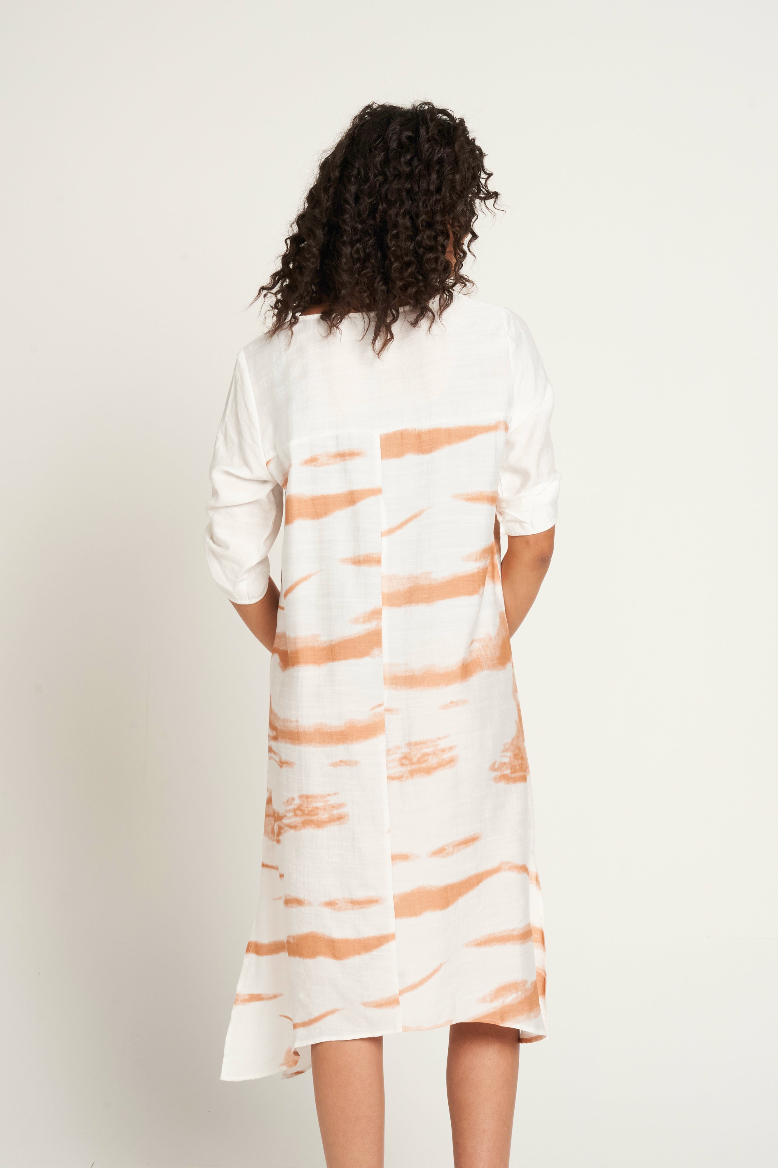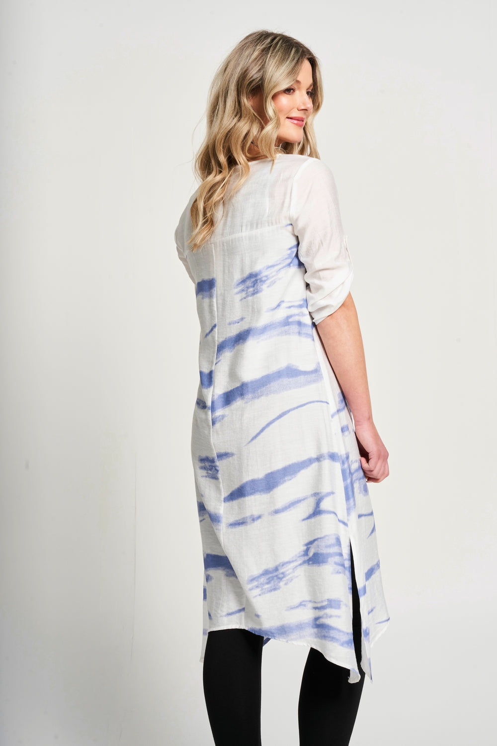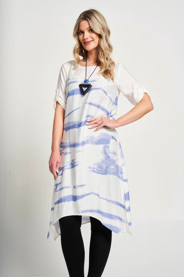 Elevate your style with our Ruched Sleeve Print Dress. The ruched sleeve with button tab adds a touch of elegance, while the round neck and dipped sides with slit provide a flattering fit. Complete your look with the matching necklace* for a polished, put-together appearance.