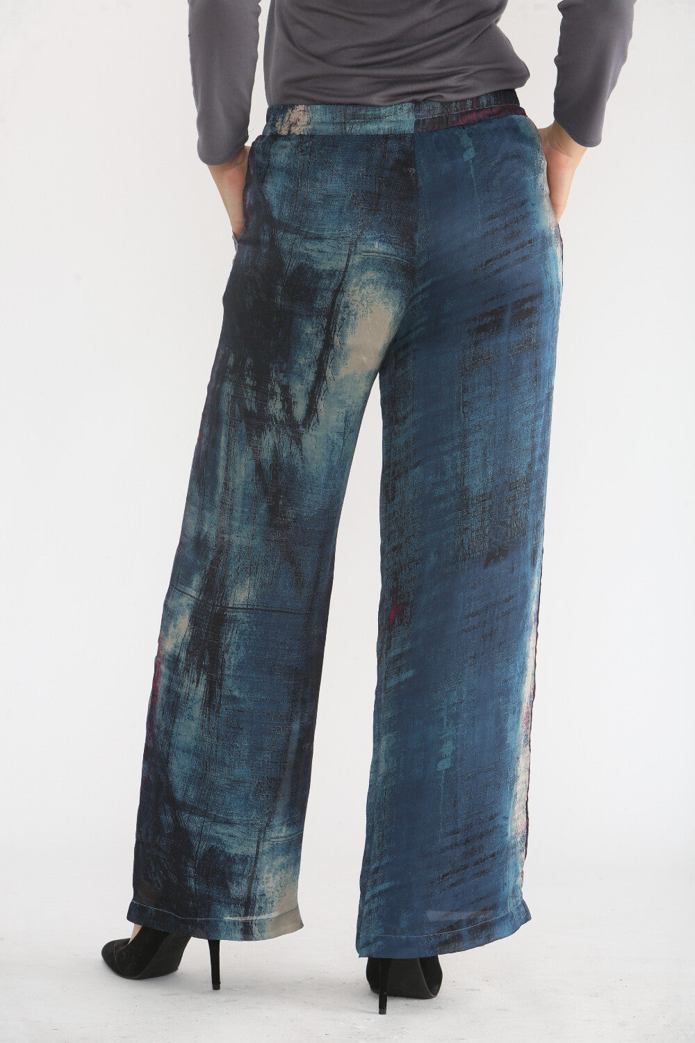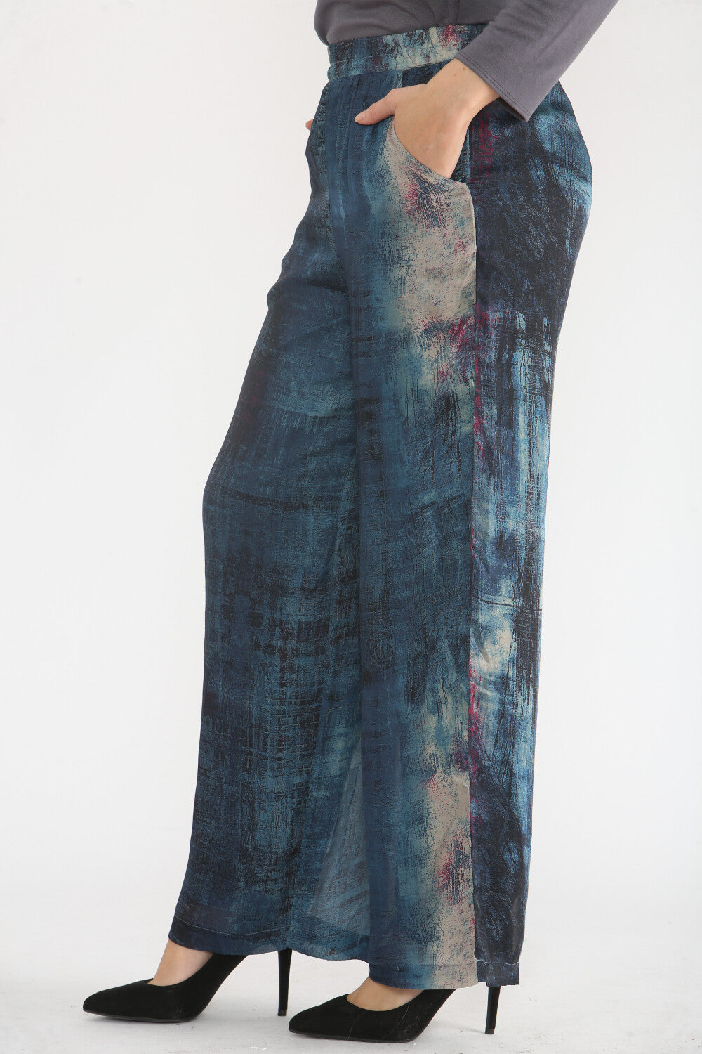These trousers offer a comfortable fit with their smooth, elastic-infused silk touch material and a wide-leg design. They also come with a plain black silk touch lining and two convenient side pockets.