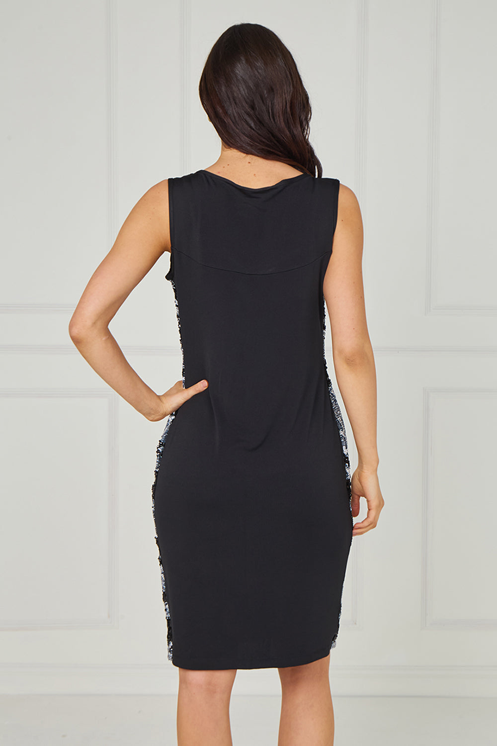 Prepare for the festive season with this glitzy sleeveless knee-length shift dress featuring a plain neck panel and a shimmer abstract print embellished with a rich array of sequins.