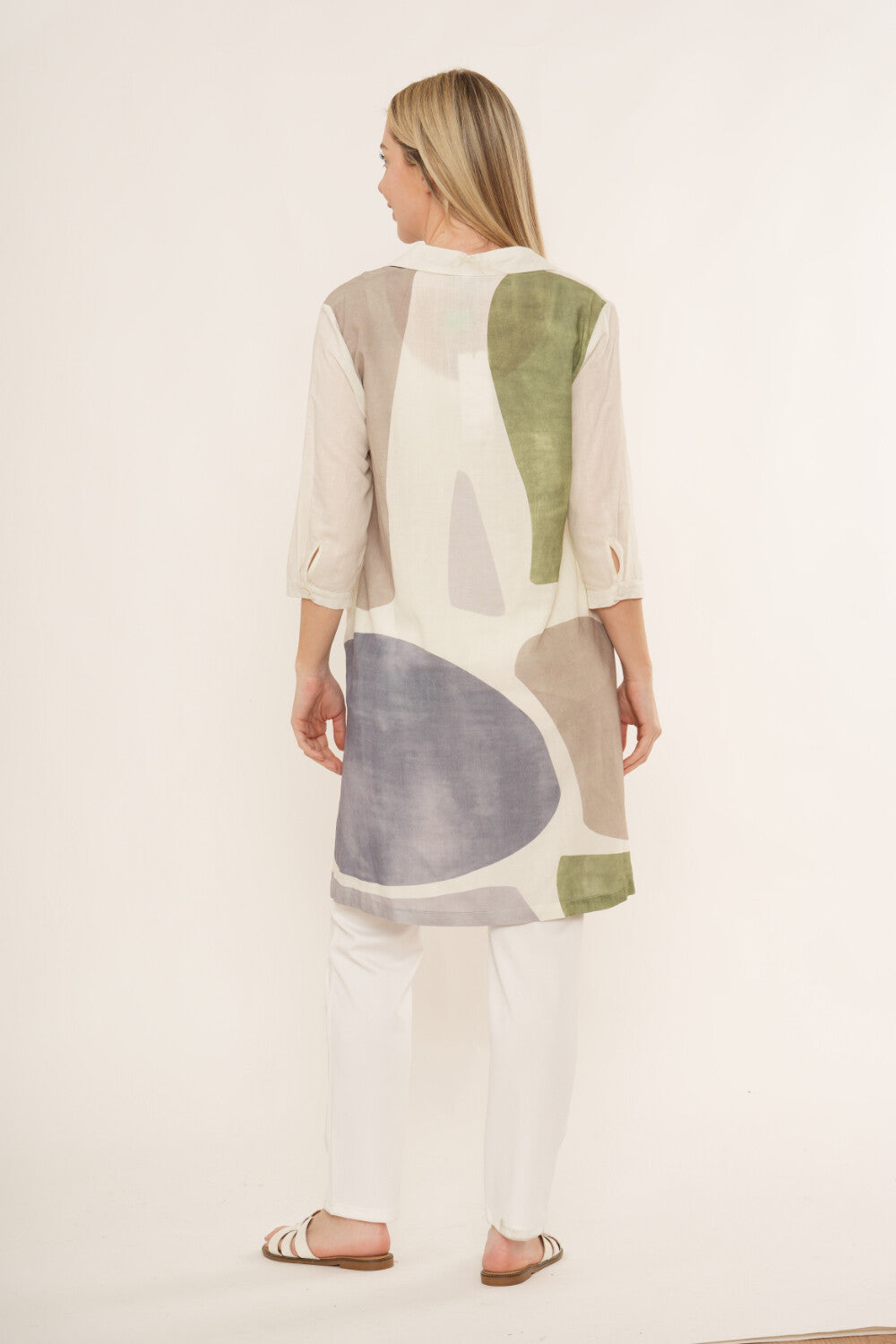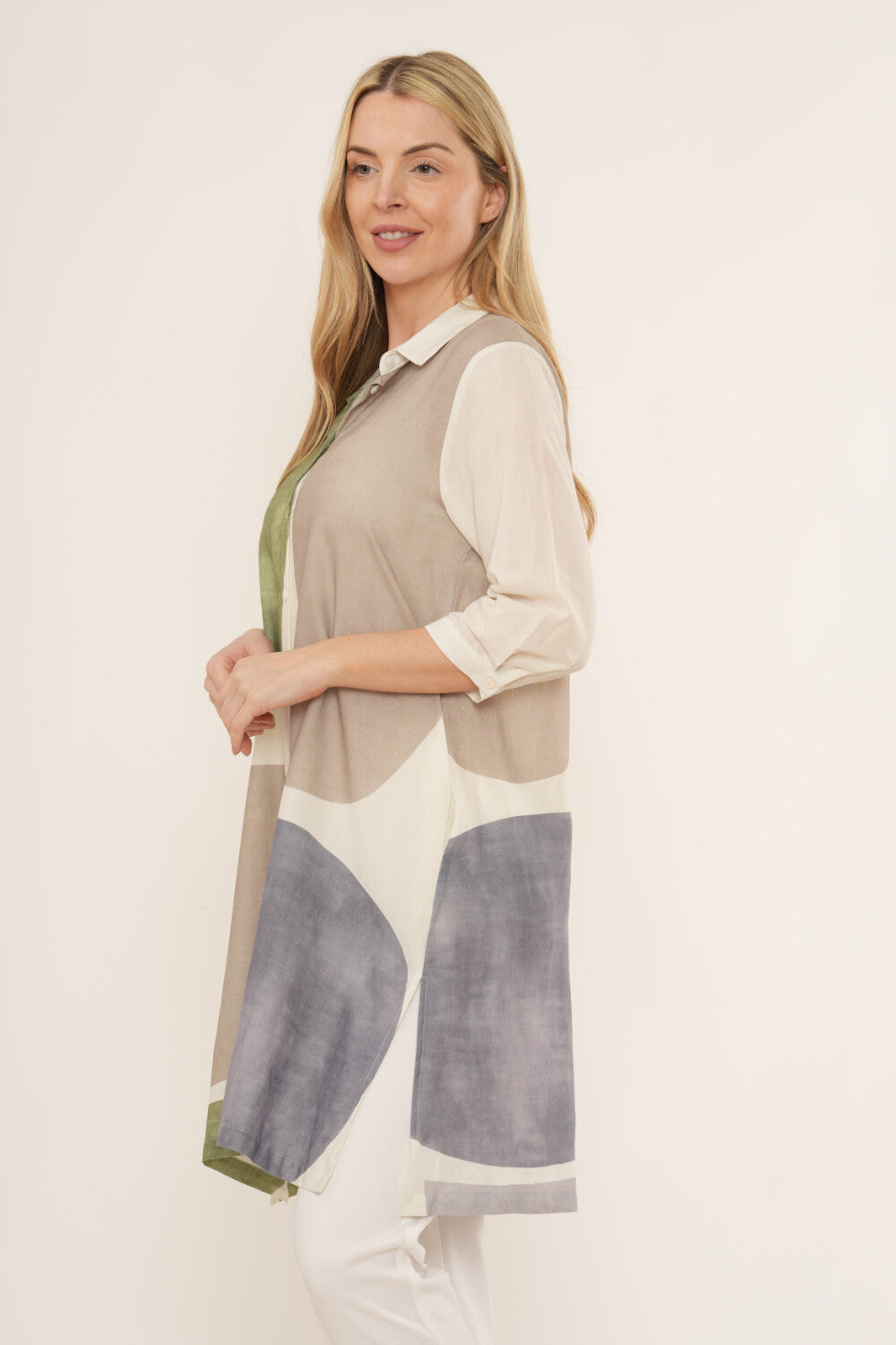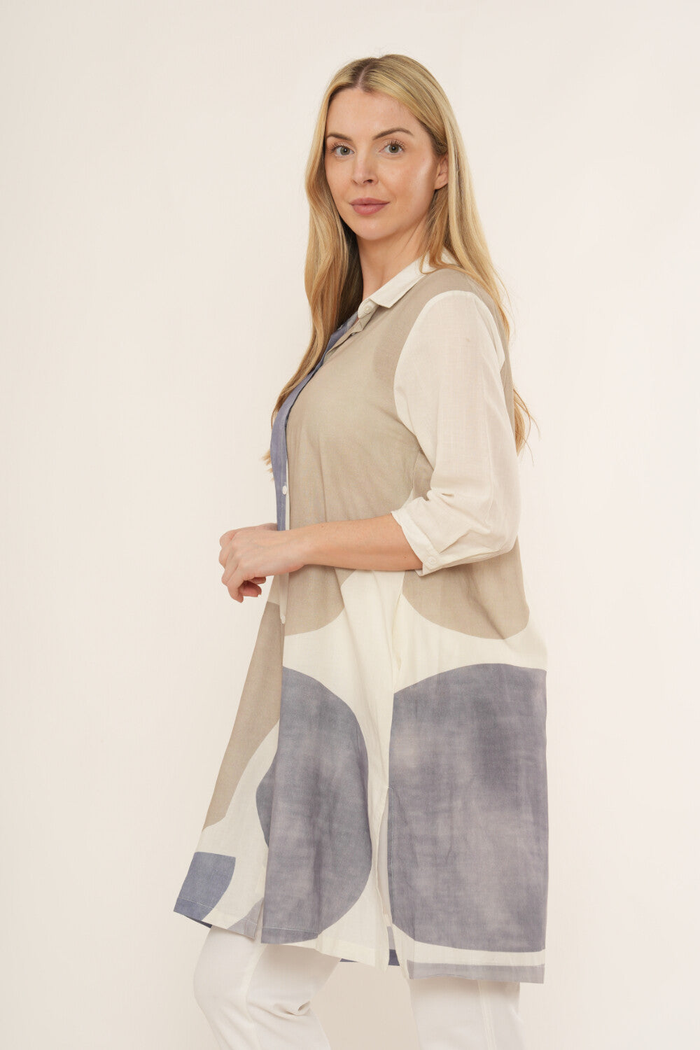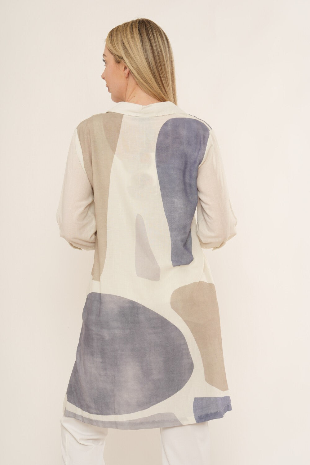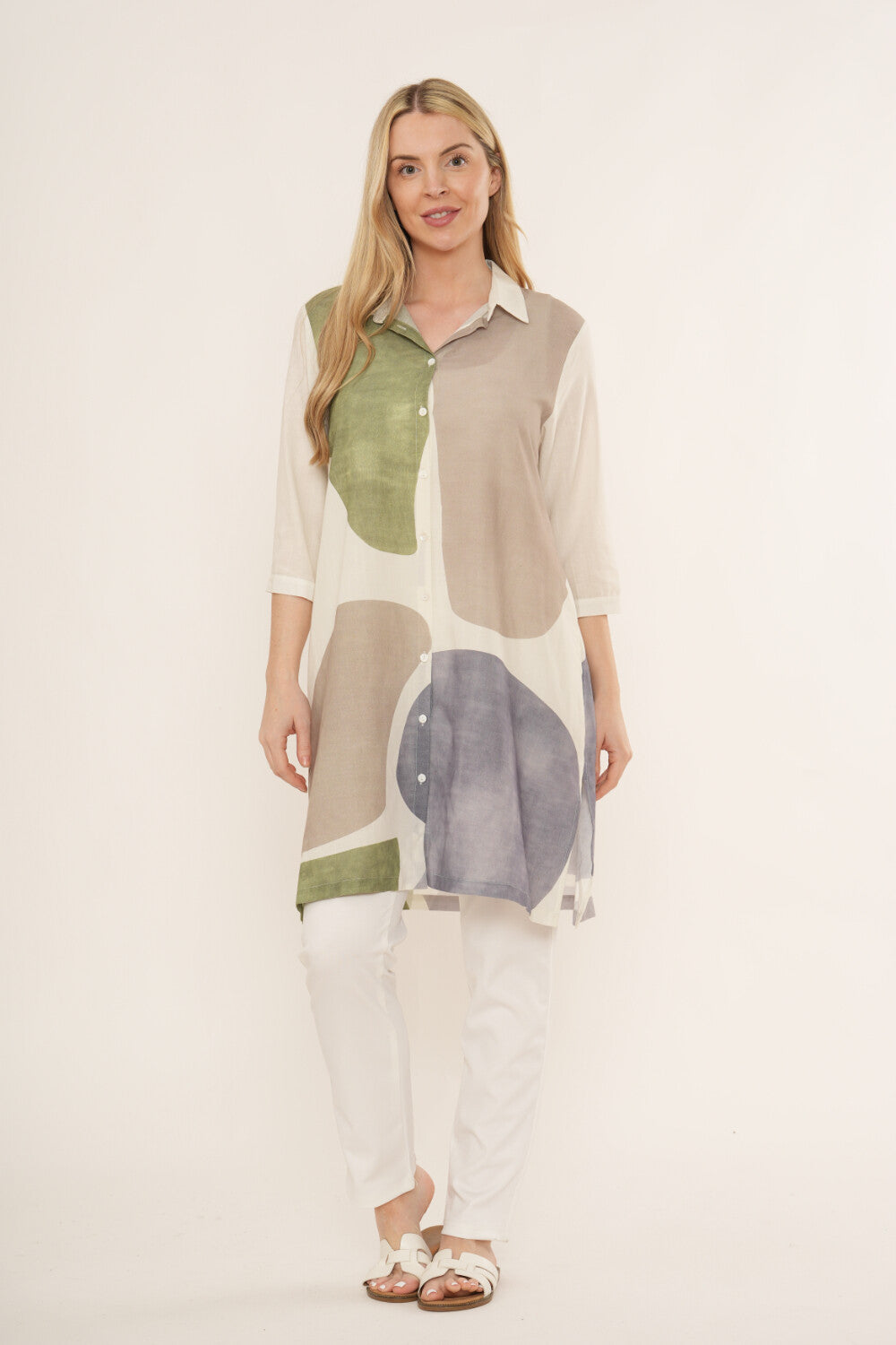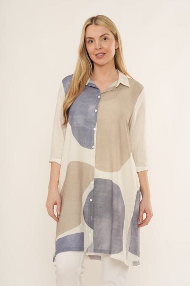 Keywords: women’s shirt dress, abstract print dress, button-through tunic dress, longline shirt dress, lightweight summer dress, casual women’s tunic dress.