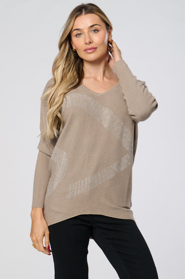 Elevate your casual look with this chic knit top, designed for both comfort and style. Crafted from a soft, lightweight knit, it features a flattering V-neckline and long sleeves for year-round wear. The standout detail is the shimmering metallic diagonal stripe that adds a modern, eye-catching twist to a classic silhouette. Perfect for pairing with jeans or tailored trousers, this versatile piece transitions effortlessly from day to night.